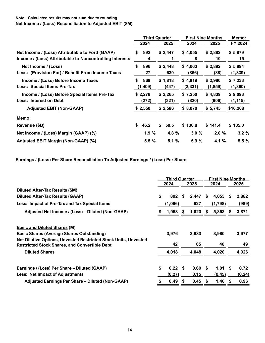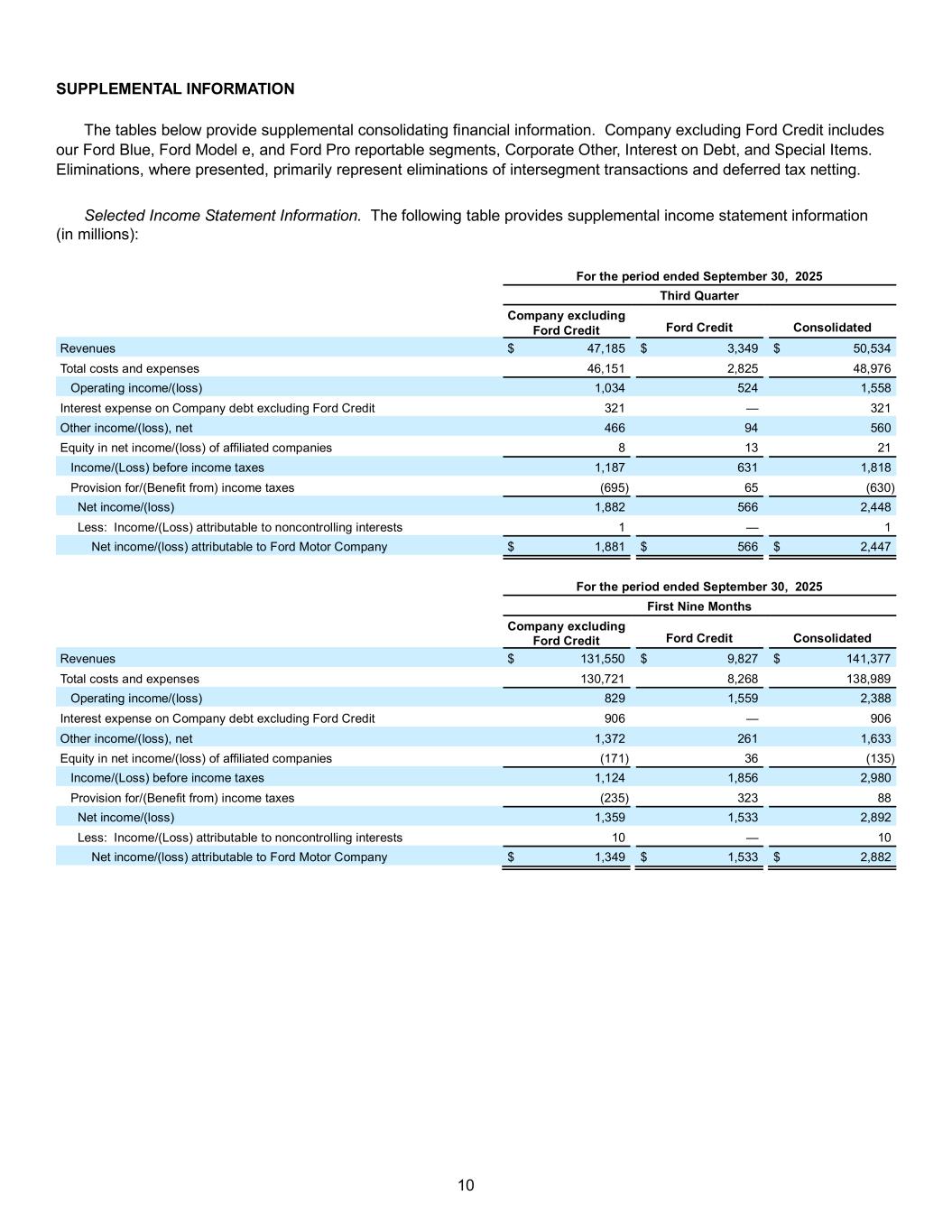 10 SUPPLEMENTAL INFORMATION The tables below provide supplemental consolidating financial information. Company excluding Ford Credit includes our Ford Blue, Ford Model e, and Ford Pro reportable segments, Corporate Other, Interest on Debt, and Special Items. Eliminations, where presented, primarily represent eliminations of intersegment transactions and deferred tax netting. Selected Income Statement Information. The following table provides supplemental income statement information (in millions): For the period ended September 30, 2025 Third Quarter Company excluding Ford Credit Ford Credit Consolidated Revenues $ 47,185 $ 3,349 $ 50,534 Total costs and expenses 46,151 2,825 48,976 Operating income/(loss) 1,034 524 1,558 Interest expense on Company debt excluding Ford Credit 321 — 321 Other income/(loss), net 466 94 560 Equity in net income/(loss) of affiliated companies 8 13 21 Income/(Loss) before income taxes 1,187 631 1,818 Provision for/(Benefit from) income taxes (695) 65 (630) Net income/(loss) 1,882 566 2,448 Less: Income/(Loss) attributable to noncontrolling interests 1 — 1 Net income/(loss) attributable to Ford Motor Company $ 1,881 $ 566 $ 2,447 For the period ended September 30, 2025 First Nine Months Company excluding Ford Credit Ford Credit Consolidated Revenues $ 131,550 $ 9,827 $ 141,377 Total costs and expenses 130,721 8,268 138,989 Operating income/(loss) 829 1,559 2,388 Interest expense on Company debt excluding Ford Credit 906 — 906 Other income/(loss), net 1,372 261 1,633 Equity in net income/(loss) of affiliated companies (171) 36 (135) Income/(Loss) before income taxes 1,124 1,856 2,980 Provision for/(Benefit from) income taxes (235) 323 88 Net income/(loss) 1,359 1,533 2,892 Less: Income/(Loss) attributable to noncontrolling interests 10 — 10 Net income/(loss) attributable to Ford Motor Company $ 1,349 $ 1,533 $ 2,882