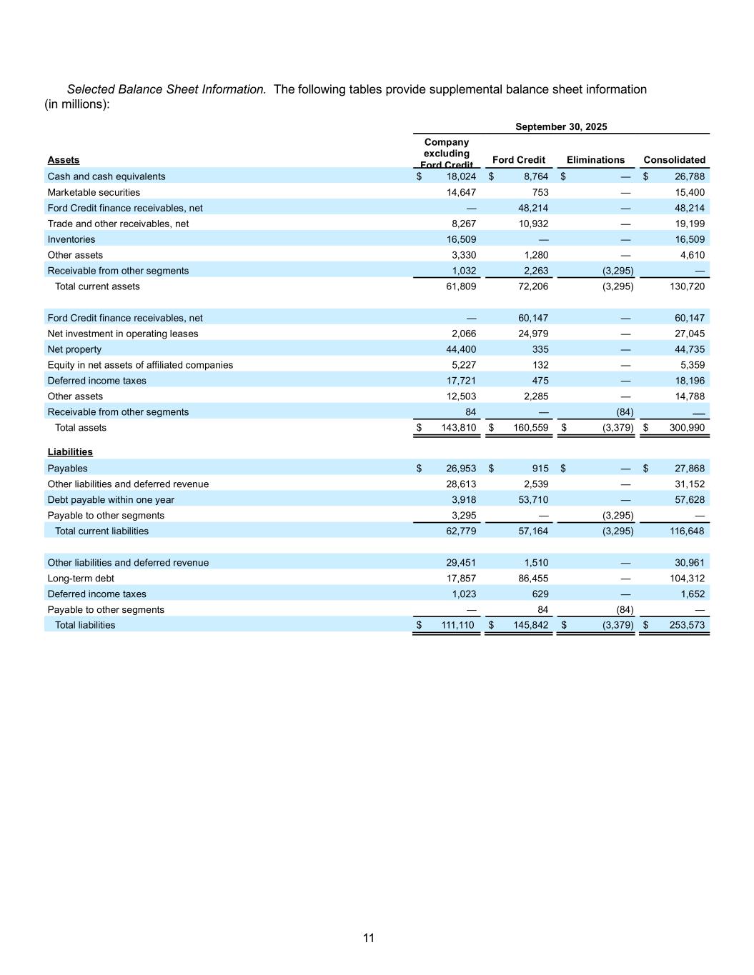 11 Selected Balance Sheet Information. The following tables provide supplemental balance sheet information (in millions): September 30, 2025 Assets Company excluding Ford Credit Ford Credit Eliminations Consolidated Cash and cash equivalents $ 18,024 $ 8,764 $ — $ 26,788 Marketable securities 14,647 753 — 15,400 Ford Credit finance receivables, net — 48,214 — 48,214 Trade and other receivables, net 8,267 10,932 — 19,199 Inventories 16,509 — — 16,509 Other assets 3,330 1,280 — 4,610 Receivable from other segments 1,032 2,263 (3,295) — Total current assets 61,809 72,206 (3,295) 130,720 Ford Credit finance receivables, net — 60,147 — 60,147 Net investment in operating leases 2,066 24,979 — 27,045 Net property 44,400 335 — 44,735 Equity in net assets of affiliated companies 5,227 132 — 5,359 Deferred income taxes 17,721 475 — 18,196 Other assets 12,503 2,285 — 14,788 Receivable from other segments 84 — (84) — Total assets $ 143,810 $ 160,559 $ (3,379) $ 300,990 Liabilities Payables $ 26,953 $ 915 $ — $ 27,868 Other liabilities and deferred revenue 28,613 2,539 — 31,152 Debt payable within one year 3,918 53,710 — 57,628 Payable to other segments 3,295 — (3,295) — Total current liabilities 62,779 57,164 (3,295) 116,648 Other liabilities and deferred revenue 29,451 1,510 — 30,961 Long-term debt 17,857 86,455 — 104,312 Deferred income taxes 1,023 629 — 1,652 Payable to other segments — 84 (84) — Total liabilities $ 111,110 $ 145,842 $ (3,379) $ 253,573
