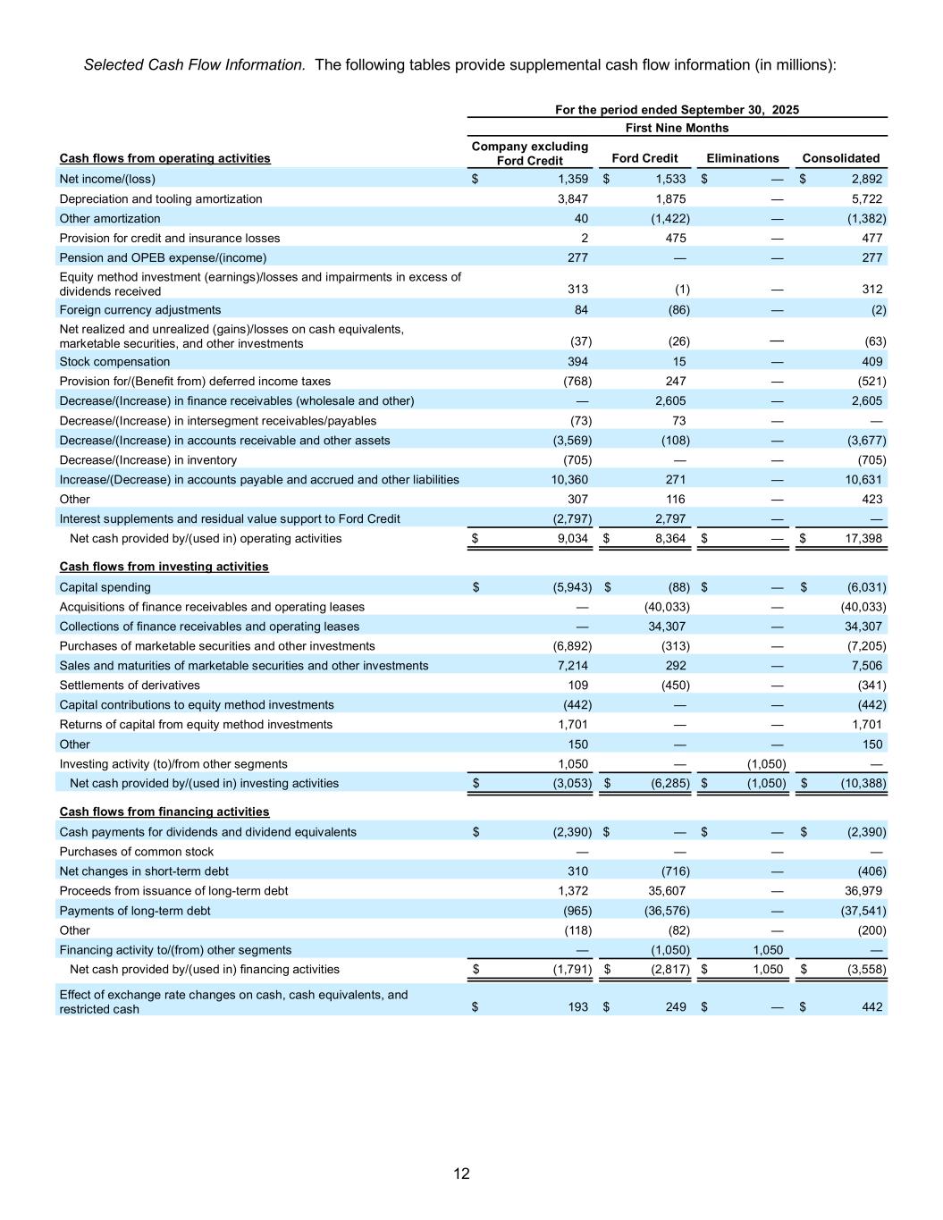 12 Selected Cash Flow Information. The following tables provide supplemental cash flow information (in millions): For the period ended September 30, 2025 First Nine Months Cash flows from operating activities Company excluding Ford Credit Ford Credit Eliminations Consolidated Net income/(loss) $ 1,359 $ 1,533 $ — $ 2,892 Depreciation and tooling amortization 3,847 1,875 — 5,722 Other amortization 40 (1,422) — (1,382) Provision for credit and insurance losses 2 475 — 477 Pension and OPEB expense/(income) 277 — — 277 Equity method investment (earnings)/losses and impairments in excess of dividends received 313 (1) — 312 Foreign currency adjustments 84 (86) — (2) Net realized and unrealized (gains)/losses on cash equivalents, marketable securities, and other investments (37) (26) — (63) Stock compensation 394 15 — 409 Provision for/(Benefit from) deferred income taxes (768) 247 — (521) Decrease/(Increase) in finance receivables (wholesale and other) — 2,605 — 2,605 Decrease/(Increase) in intersegment receivables/payables (73) 73 — — Decrease/(Increase) in accounts receivable and other assets (3,569) (108) — (3,677) Decrease/(Increase) in inventory (705) — — (705) Increase/(Decrease) in accounts payable and accrued and other liabilities 10,360 271 — 10,631 Other 307 116 — 423 Interest supplements and residual value support to Ford Credit (2,797) 2,797 — — Net cash provided by/(used in) operating activities $ 9,034 $ 8,364 $ — $ 17,398 Cash flows from investing activities Capital spending $ (5,943) $ (88) $ — $ (6,031) Acquisitions of finance receivables and operating leases — (40,033) — (40,033) Collections of finance receivables and operating leases — 34,307 — 34,307 Purchases of marketable securities and other investments (6,892) (313) — (7,205) Sales and maturities of marketable securities and other investments 7,214 292 — 7,506 Settlements of derivatives 109 (450) — (341) Capital contributions to equity method investments (442) — — (442) Returns of capital from equity method investments 1,701 — — 1,701 Other 150 — — 150 Investing activity (to)/from other segments 1,050 — (1,050) — Net cash provided by/(used in) investing activities $ (3,053) $ (6,285) $ (1,050) $ (10,388) Cash flows from financing activities Cash payments for dividends and dividend equivalents $ (2,390) $ — $ — $ (2,390) Purchases of common stock — — — — Net changes in short-term debt 310 (716) — (406) Proceeds from issuance of long-term debt 1,372 35,607 — 36,979 Payments of long-term debt (965) (36,576) — (37,541) Other (118) (82) — (200) Financing activity to/(from) other segments — (1,050) 1,050 — Net cash provided by/(used in) financing activities $ (1,791) $ (2,817) $ 1,050 $ (3,558) Effect of exchange rate changes on cash, cash equivalents, and restricted cash $ 193 $ 249 $ — $ 442
