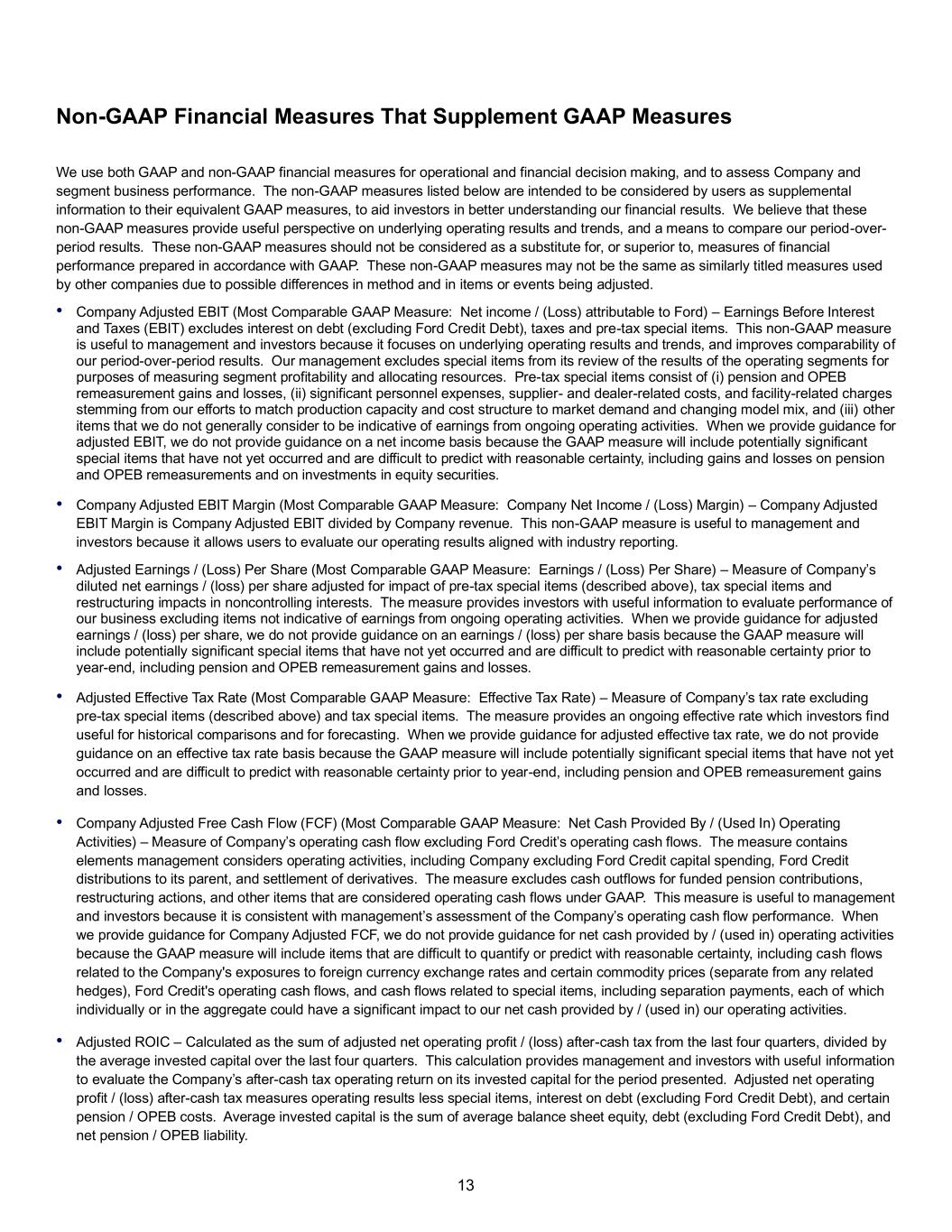 13 Non-GAAP Financial Measures That Supplement GAAP Measures We use both GAAP and non-GAAP financial measures for operational and financial decision making, and to assess Company and segment business performance. The non-GAAP measures listed below are intended to be considered by users as supplemental information to their equivalent GAAP measures, to aid investors in better understanding our financial results. We believe that these non-GAAP measures provide useful perspective on underlying operating results and trends, and a means to compare our period-over- period results. These non-GAAP measures should not be considered as a substitute for, or superior to, measures of financial performance prepared in accordance with GAAP. These non-GAAP measures may not be the same as similarly titled measures used by other companies due to possible differences in method and in items or events being adjusted. • Company Adjusted EBIT (Most Comparable GAAP Measure: Net income / (Loss) attributable to Ford) – Earnings Before Interest and Taxes (EBIT) excludes interest on debt (excluding Ford Credit Debt), taxes and pre-tax special items. This non-GAAP measure is useful to management and investors because it focuses on underlying operating results and trends, and improves comparability of our period-over-period results. Our management excludes special items from its review of the results of the operating segments for purposes of measuring segment profitability and allocating resources. Pre-tax special items consist of (i) pension and OPEB remeasurement gains and losses, (ii) significant personnel expenses, supplier- and dealer-related costs, and facility-related charges stemming from our efforts to match production capacity and cost structure to market demand and changing model mix, and (iii) other items that we do not generally consider to be indicative of earnings from ongoing operating activities. When we provide guidance for adjusted EBIT, we do not provide guidance on a net income basis because the GAAP measure will include potentially significant special items that have not yet occurred and are difficult to predict with reasonable certainty, including gains and losses on pension and OPEB remeasurements and on investments in equity securities. • Company Adjusted EBIT Margin (Most Comparable GAAP Measure: Company Net Income / (Loss) Margin) – Company Adjusted EBIT Margin is Company Adjusted EBIT divided by Company revenue. This non-GAAP measure is useful to management and investors because it allows users to evaluate our operating results aligned with industry reporting. • Adjusted Earnings / (Loss) Per Share (Most Comparable GAAP Measure: Earnings / (Loss) Per Share) – Measure of Company’s diluted net earnings / (loss) per share adjusted for impact of pre-tax special items (described above), tax special items and restructuring impacts in noncontrolling interests. The measure provides investors with useful information to evaluate performance of our business excluding items not indicative of earnings from ongoing operating activities. When we provide guidance for adjusted earnings / (loss) per share, we do not provide guidance on an earnings / (loss) per share basis because the GAAP measure will include potentially significant special items that have not yet occurred and are difficult to predict with reasonable certainty prior to year-end, including pension and OPEB remeasurement gains and losses. • Adjusted Effective Tax Rate (Most Comparable GAAP Measure: Effective Tax Rate) – Measure of Company’s tax rate excluding pre-tax special items (described above) and tax special items. The measure provides an ongoing effective rate which investors find useful for historical comparisons and for forecasting. When we provide guidance for adjusted effective tax rate, we do not provide guidance on an effective tax rate basis because the GAAP measure will include potentially significant special items that have not yet occurred and are difficult to predict with reasonable certainty prior to year-end, including pension and OPEB remeasurement gains and losses. • Company Adjusted Free Cash Flow (FCF) (Most Comparable GAAP Measure: Net Cash Provided By / (Used In) Operating Activities) – Measure of Company’s operating cash flow excluding Ford Credit’s operating cash flows. The measure contains elements management considers operating activities, including Company excluding Ford Credit capital spending, Ford Credit distributions to its parent, and settlement of derivatives. The measure excludes cash outflows for funded pension contributions, restructuring actions, and other items that are considered operating cash flows under GAAP. This measure is useful to management and investors because it is consistent with management’s assessment of the Company’s operating cash flow performance. When we provide guidance for Company Adjusted FCF, we do not provide guidance for net cash provided by / (used in) operating activities because the GAAP measure will include items that are difficult to quantify or predict with reasonable certainty, including cash flows related to the Company's exposures to foreign currency exchange rates and certain commodity prices (separate from any related hedges), Ford Credit's operating cash flows, and cash flows related to special items, including separation payments, each of which individually or in the aggregate could have a significant impact to our net cash provided by / (used in) our operating activities. • Adjusted ROIC – Calculated as the sum of adjusted net operating profit / (loss) after-cash tax from the last four quarters, divided by the average invested capital over the last four quarters. This calculation provides management and investors with useful information to evaluate the Company’s after-cash tax operating return on its invested capital for the period presented. Adjusted net operating profit / (loss) after-cash tax measures operating results less