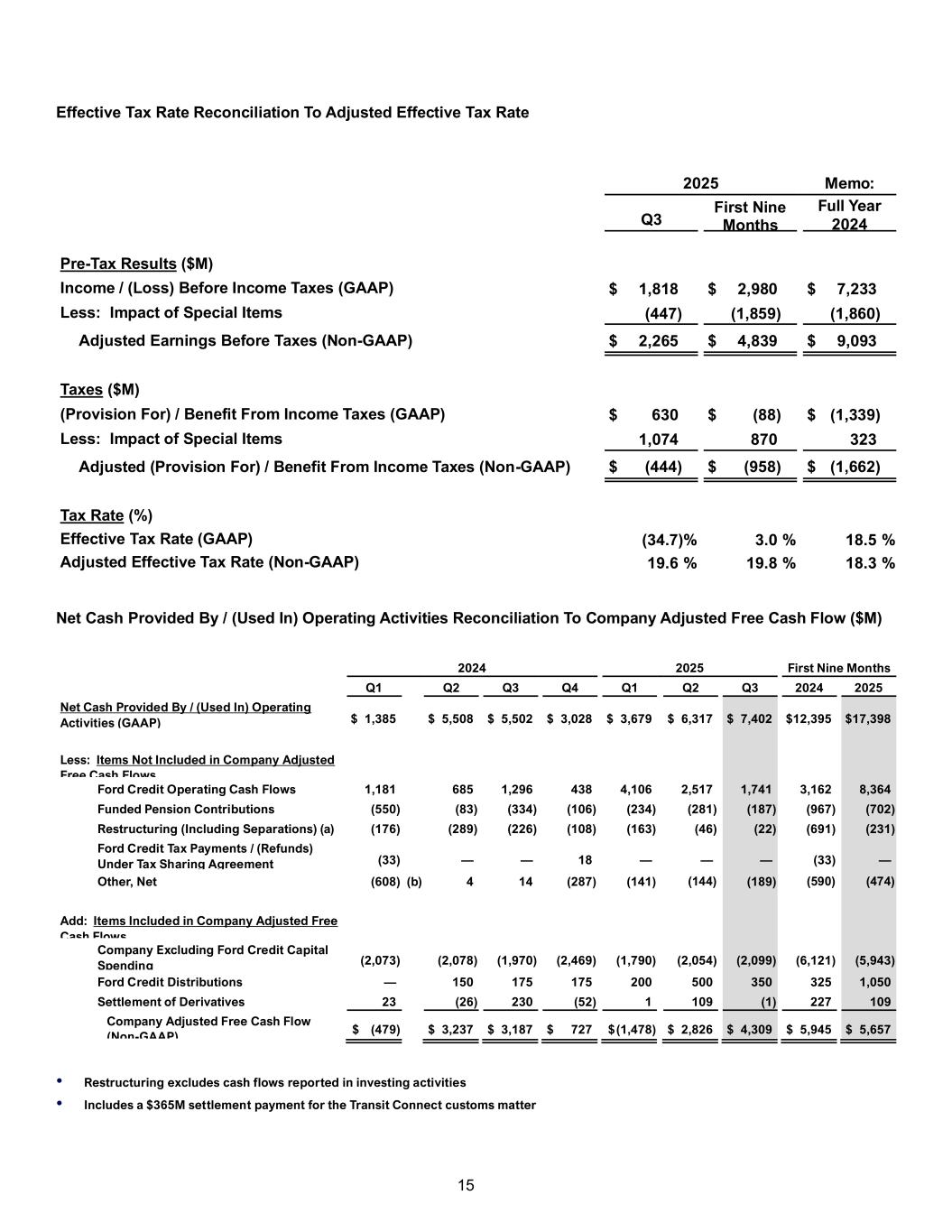 14 Note: Calculated results may not sum due to rounding Net Income / (Loss) Reconciliation to Adjusted EBIT ($M) Third Quarter First Nine Months Memo: 2024 2025 2024 2025 FY 2024 Net Income / (Loss) Attributable to Ford (GAAP) $ 892 $ 2,447 $ 4,055 $ 2,882 $ 5,879 Income / (Loss) Attributable to Noncontrolling Interests 4 1 8 10 15 Net Income / (Loss) $ 896 $ 2,448 $ 4,063 $ 2,892 $ 5,894 Less: (Provision For) / Benefit From Income Taxes 27 630 (856) (88) (1,339) Income / (Loss) Before Income Taxes $ 869 $ 1,818 $ 4,919 $ 2,980 $ 7,233 Less: Special Items Pre-Tax (1,409) (447) (2,331) (1,859) (1,860) Income / (Loss) Before Special Items Pre-Tax $ 2,278 $ 2,265 $ 7,250 $ 4,839 $ 9,093 Less: Interest on Debt (272) (321) (820) (906) (1,115) Adjusted EBIT (Non-GAAP) $ 2,550 $ 2,586 $ 8,070 $ 5,745 $ 10,208 Memo: Revenue ($B) $ 46.2 $ 50.5 $ 136.8 $ 141.4 $ 185.0 Net Income / (Loss) Margin (GAAP) (%) 1.9 % 4.8 % 3.0 % 2.0 % 3.2 % Adjusted EBIT Margin (Non-GAAP) (%) 5.5 % 5.1 % 5.9 % 4.1 % 5.5 % Earnings / (Loss) Per Share Reconciliation To Adjusted Earnings / (Loss) Per Share Third Quarter First Nine Months 2024 2025 2024 2025 Diluted After-Tax Results ($M) Diluted After-Tax Results (GAAP) $ 892 $ 2,447 $ 4,055 $ 2,882 Less: Impact of Pre-Tax and Tax Special Items (1,066) 627 (1,798) (989) Adjusted Net Income / (Loss) – Diluted (Non-GAAP) $ 1,958 $ 1,820 $ 5,853 $ 3,871 Basic and Diluted Shares (M) Basic Shares (Average Shares Outstanding) 3,976 3,983 3,980 3,977 Net Dilutive Options, Unvested Restricted Stock Units, Unvested Restricted Stock Shares, and Convertible Debt 42 65 40 49 Diluted Shares 4,018 4,048 4,020 4,026 Earnings / (Loss) Per Share – Diluted (GAAP) $ 0.22 $ 0.60 $ 1.01 $ 0.72 Less: Net Impact of Adjustments (0.27) 0.15 (0.45) (0.24) Adjusted Earnings Per Share – Diluted (Non-GAAP) $ 0.49 $ 0.45 $ 1.46 $ 0.96