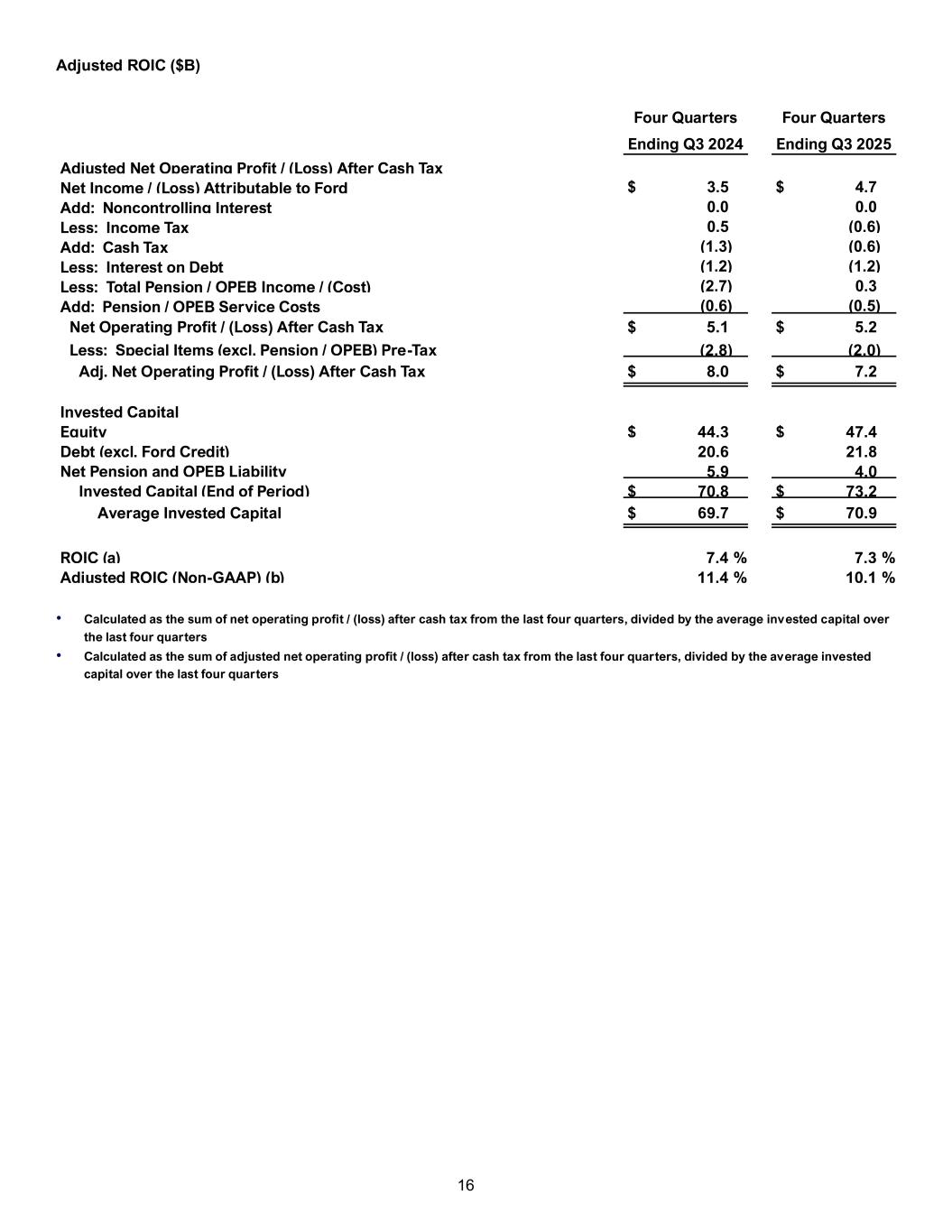 15 Effective Tax Rate Reconciliation To Adjusted Effective Tax Rate 2025 Memo: Q3 First Nine Months Full Year 2024 Pre-Tax Results ($M) Income / (Loss) Before Income Taxes (GAAP) $ 1,818 $ 2,980 $ 7,233 Less: Impact of Special Items (447) (1,859) (1,860) Adjusted Earnings Before Taxes (Non-GAAP) $ 2,265 $ 4,839 $ 9,093 Taxes ($M) (Provision For) / Benefit From Income Taxes (GAAP) $ 630 $ (88) $ (1,339) Less: Impact of Special Items 1,074 870 323 Adjusted (Provision For) / Benefit From Income Taxes (Non-GAAP) $ (444) $ (958) $ (1,662) Tax Rate (%) Effective Tax Rate (GAAP) (34.7) % 3.0 % 18.5 % Adjusted Effective Tax Rate (Non-GAAP) 19.6 % 19.8 % 18.3 % Net Cash Provided By / (Used In) Operating Activities Reconciliation To Company Adjusted Free Cash Flow ($M) 2024 2025 First Nine Months Q1 Q2 Q3 Q4 Q1 Q2 Q3 2024 2025 Net Cash Provided By / (Used In) Operating Activities (GAAP) $ 1,385 $ 5,508 $ 5,502 $ 3,028 $ 3,679 $ 6,317 $ 7,402 $12,395 $17,398 Less: Items Not Included in Company Adjusted Free Cash Flows Ford Credit Operating Cash Flows 1,181 685 1,296 438 4,106 2,517 1,741 3,162 8,364 Funded Pension Contributions (550) (83) (334) (106) (234) (281) (187) (967) (702) Restructuring (Including Separations) (a) (176) (289) (226) (108) (163) (46) (22) (691) (231) Ford Credit Tax Payments / (Refunds) Under Tax Sharing Agreement (33) — — 18 — — — (33) — Other, Net (608) (b) 4 14 (287) (141) (144) (189) (590) (474) Add: Items Included in Company Adjusted Free Cash Flows Company Excluding Ford Credit Capital Spending (2,073) (2,078) (1,970) (2,469) (1,790) (2,054) (2,099) (6,121) (5,943) Ford Credit Distributions — 150 175 175 200 500 350 325 1,050 Settlement of Derivatives 23 (26) 230 (52) 1 109 (1) 227 109 Company Adjusted Free Cash Flow (Non-GAAP) $ (479) $ 3,237 $ 3,187 $ 727 $ (1,478) $ 2,826 $ 4,309 $ 5,945 $ 5,657 • Restructuring excludes cash flows reported in investing activities • Includes a $365M settlement payment for the Transit Connect customs matter