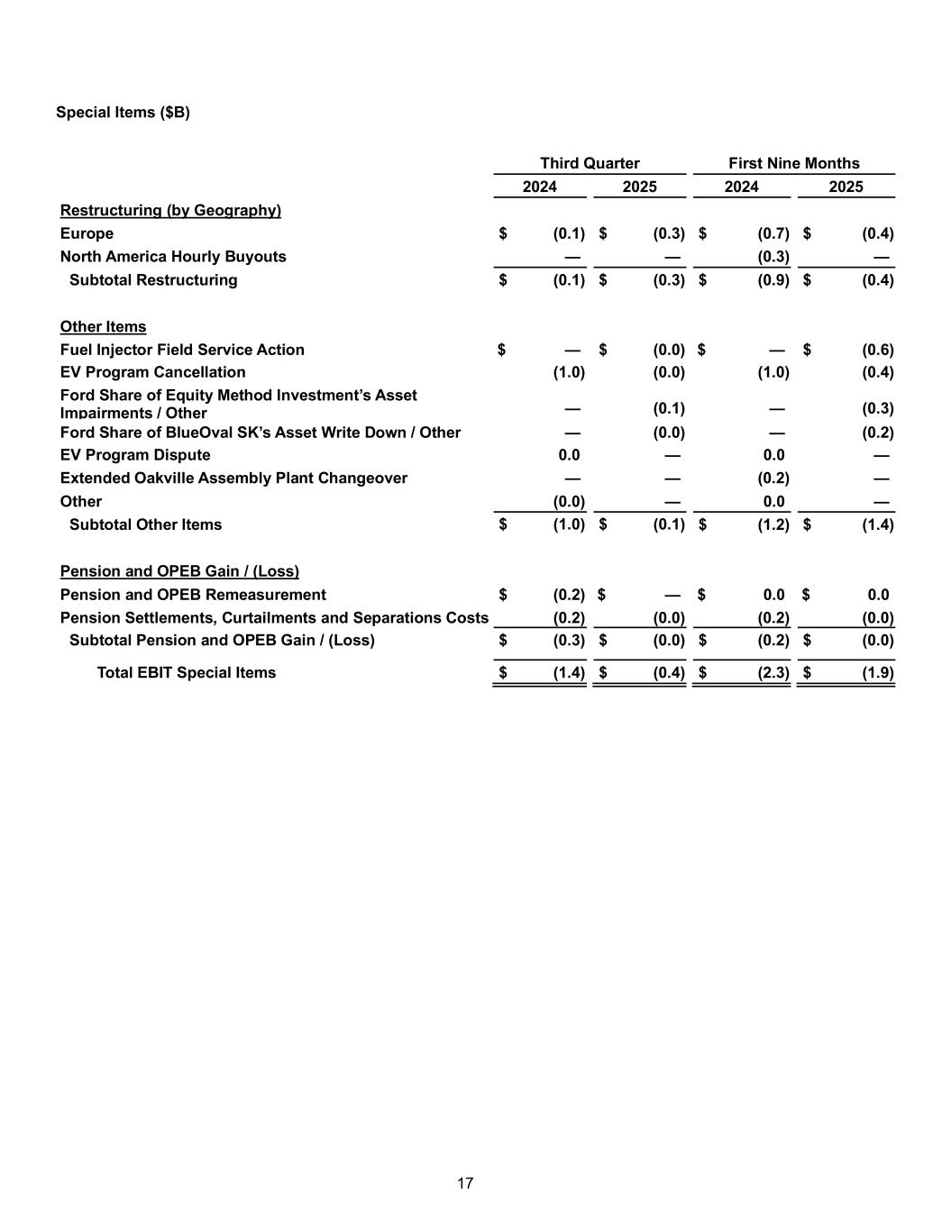 16 Adjusted ROIC ($B) Four Quarters Ending Q3 2024 Four Quarters Ending Q3 2025 Adjusted Net Operating Profit / (Loss) After Cash Tax Net Income / (Loss) Attributable to Ford $ 3.5 $ 4.7 Add: Noncontrolling Interest 0.0 0.0 Less: Income Tax 0.5 (0.6) Add: Cash Tax (1.3) (0.6) Less: Interest on Debt (1.2) (1.2) Less: Total Pension / OPEB Income / (Cost) (2.7) 0.3 Add: Pension / OPEB Service Costs (0.6) (0.5) Net Operating Profit / (Loss) After Cash Tax $ 5.1 $ 5.2 Less: Special Items (excl. Pension / OPEB) Pre-Tax (2.8) (2.0) Adj. Net Operating Profit / (Loss) After Cash Tax $ 8.0 $ 7.2 Invested Capital Equity $ 44.3 $ 47.4 Debt (excl. Ford Credit) 20.6 21.8 Net Pension and OPEB Liability 5.9 4.0 Invested Capital (End of Period) $ 70.8 $ 73.2 Average Invested Capital $ 69.7 $ 70.9 ROIC (a) 7.4 % 7.3 % Adjusted ROIC (Non-GAAP) (b) 11.4 % 10.1 % • Calculated as the sum of net operating profit / (loss) after cash tax from the last four quarters, divided by the average invested capital over the last four quarters • Calculated as the sum of adjusted net operating profit / (loss) after cash tax from the last four quarters, divided by the average invested capital over the last four quarters