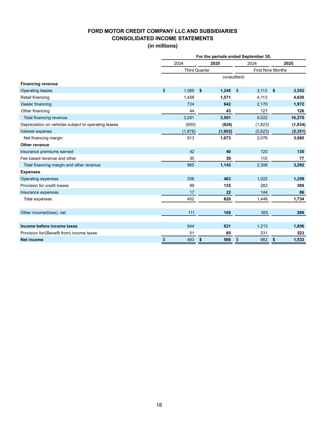 18 FORD MOTOR CREDIT COMPANY LLC AND SUBSIDIARIES CONSOLIDATED INCOME STATEMENTS (in millions) For the periods ended September 30, 2024 2025 2024 2025 Third Quarter First Nine Months (unaudited) Financing revenue Operating leases $ 1,065 $ 1,245 $ 3,112 $ 3,552 Retail financing 1,458 1,571 4,113 4,620 Dealer financing 724 642 2,170 1,972 Other financing 44 43 127 126 Total financing revenue 3,291 3,501 9,522 10,270 Depreciation on vehicles subject to operating leases (600) (626) (1,823) (1,834) Interest expense (1,878) (1,802) (5,623) (5,351) Net financing margin 813 1,073 2,076 3,085 Other revenue Insurance premiums earned 42 40 120 130 Fee based revenue and other 30 30 110 77 Total financing margin and other revenue 885 1,143 2,306 3,292 Expenses Operating expenses 336 463 1,022 1,259 Provision for credit losses 99 135 282 389 Insurance expenses 17 22 144 86 Total expenses 452 620 1,448 1,734 Other income/(loss), net 111 108 355 298 Income before income taxes 544 631 1,213 1,856 Provision for/(Benefit from) income taxes 51 65 231 323 Net income $ 493 $ 566 $ 982 $ 1,533