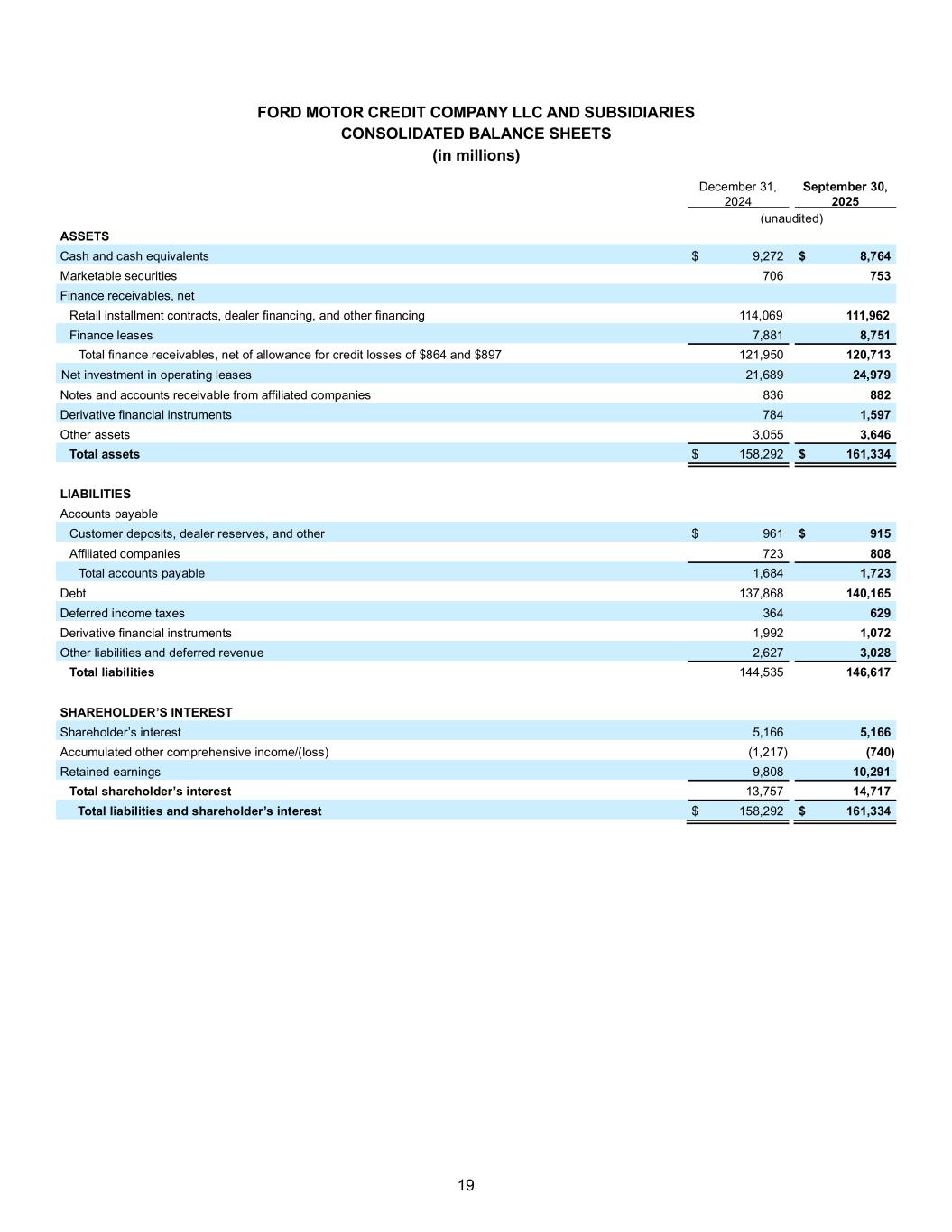 19 FORD MOTOR CREDIT COMPANY LLC AND SUBSIDIARIES CONSOLIDATED BALANCE SHEETS (in millions) December 31, 2024 September 30, 2025 (unaudited) ASSETS Cash and cash equivalents $ 9,272 $ 8,764 Marketable securities 706 753 Finance receivables, net Retail installment contracts, dealer financing, and other financing 114,069 111,962 Finance leases 7,881 8,751 Total finance receivables, net of allowance for credit losses of $864 and $897 121,950 120,713 Net investment in operating leases 21,689 24,979 Notes and accounts receivable from affiliated companies 836 882 Derivative financial instruments 784 1,597 Other assets 3,055 3,646 Total assets $ 158,292 $ 161,334 LIABILITIES Accounts payable Customer deposits, dealer reserves, and other $ 961 $ 915 Affiliated companies 723 808 Total accounts payable 1,684 1,723 Debt 137,868 140,165 Deferred income taxes 364 629 Derivative financial instruments 1,992 1,072 Other liabilities and deferred revenue 2,627 3,028 Total liabilities 144,535 146,617 SHAREHOLDER’S INTEREST Shareholder’s interest 5,166 5,166 Accumulated other comprehensive income/(loss) (1,217) (740) Retained earnings 9,808 10,291 Total shareholder’s interest 13,757 14,717 Total liabilities and shareholder’s interest $ 158,292 $ 161,334