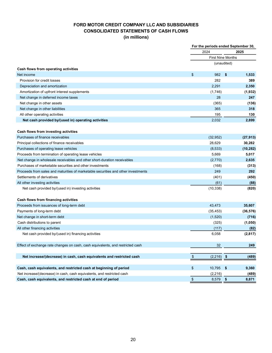 20 FORD MOTOR CREDIT COMPANY LLC AND SUBSIDIARIES CONSOLIDATED STATEMENTS OF CASH FLOWS (in millions) For the periods ended September 30, 2024 2025 First Nine Months (unaudited) Cash flows from operating activities Net income $ 982 $ 1,533 Provision for credit losses 282 389 Depreciation and amortization 2,291 2,350 Amortization of upfront interest supplements (1,746) (1,932) Net change in deferred income taxes 28 247 Net change in other assets (365) (136) Net change in other liabilities 365 318 All other operating activities 195 130 Net cash provided by/(used in) operating activities 2,032 2,899 Cash flows from investing activities Purchases of finance receivables (32,952) (27,913) Principal collections of finance receivables 28,629 30,282 Purchases of operating lease vehicles (8,533) (10,282) Proceeds from termination of operating lease vehicles 5,669 5,017 Net change in wholesale receivables and other short-duration receivables (2,770) 2,635 Purchases of marketable securities and other investments (168) (313) Proceeds from sales and maturities of marketable securities and other investments 249 292 Settlements of derivatives (401) (450) All other investing activities (61) (88) Net cash provided by/(used in) investing activities (10,338) (820) Cash flows from financing activities Proceeds from issuances of long-term debt 43,473 35,607 Payments of long-term debt (35,453) (36,576) Net change in short-term debt (1,520) (716) Cash distributions to parent (325) (1,050) All other financing activities (117) (82) Net cash provided by/(used in) financing activities 6,058 (2,817) Effect of exchange rate changes on cash, cash equivalents, and restricted cash 32 249 Net increase/(decrease) in cash, cash equivalents and restricted cash $ (2,216) $ (489) Cash, cash equivalents, and restricted cash at beginning of period $ 10,795 $ 9,360 Net increase/(decrease) in cash, cash equivalents, and restricted cash (2,216) (489) Cash, cash equivalents, and restricted cash at end of period $ 8,579 $ 8,871