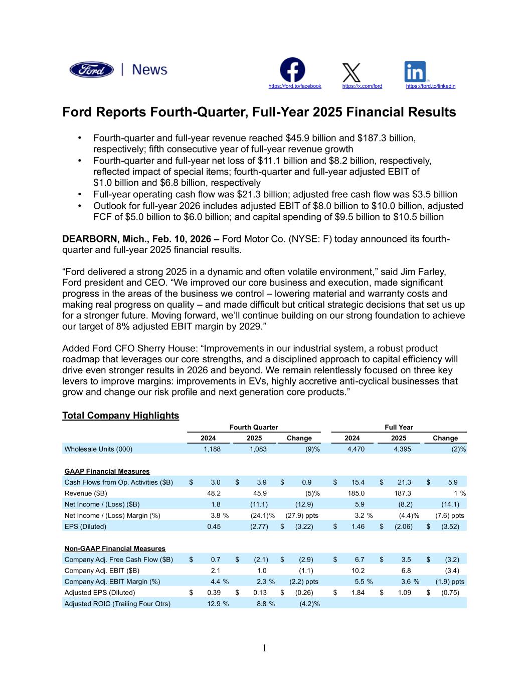 1 https://ford.to/facebook https://x.com/ford https://ford.to/linkedin Ford Reports Fourth-Quarter, Full-Year 2025 Financial Results • Fourth-quarter and full-year revenue reached $45.9 billion and $187.3 billion, respectively; fifth consecutive year of full-year revenue growth • Fourth-quarter and full-year net loss of $11.1 billion and $8.2 billion, respectively, reflected impact of special items; fourth-quarter and full-year adjusted EBIT of $1.0 billion and $6.8 billion, respectively • Full-year operating cash flow was $21.3 billion; adjusted free cash flow was $3.5 billion • Outlook for full-year 2026 includes adjusted EBIT of $8.0 billion to $10.0 billion, adjusted FCF of $5.0 billion to $6.0 billion; and capital spending of $9.5 billion to $10.5 billion DEARBORN, Mich., Feb. 10, 2026 – Ford Motor Co. (NYSE: F) today announced its fourth- quarter and full-year 2025 financial results. “Ford delivered a strong 2025 in a dynamic and often volatile environment,” said Jim Farley, Ford president and CEO. “We improved our core business and execution, made significant progress in the areas of the business we control – lowering material and warranty costs and making real progress on quality – and made difficult but critical strategic decisions that set us up for a stronger future. Moving forward, we’ll continue building on our strong foundation to achieve our target of 8% adjusted EBIT margin by 2029.” Added Ford CFO Sherry House: “Improvements in our industrial system, a robust product roadmap that leverages our core strengths, and a disciplined approach to capital efficiency will drive even stronger results in 2026 and beyond. We remain relentlessly focused on three key levers to improve margins: improvements in EVs, highly accretive anti-cyclical businesses that grow and change our risk profile and next generation core products.” Total Company Highlights Fourth Quarter Full Year 2024 2025 Change 2024 2025 Change Wholesale Units (000) 1,188 1,083 (9)% 4,470 4,395 (2)% GAAP Financial Measures Cash Flows from Op. Activities ($B) $ 3.0 $ 3.9 $ 0.9 $ 15.4 $ 21.3 $ 5.9 Revenue ($B) 48.2 45.9 (5)% 185.0 187.3 1 % Net Income / (Loss) ($B) 1.8 (11.1) (12.9) 5.9 (8.2) (14.1) Net Income / (Loss) Margin (%) 3.8 % (24.1) % (27.9) ppts 3.2 % (4.4)% (7.6) ppts EPS (Diluted) 0.45 (2.77) $ (3.22) $ 1.46 $ (2.06) $ (3.52) Non-GAAP Financial Measures Company Adj. Free Cash Flow ($B) $ 0.7 $ (2.1) $ (2.9) $ 6.7 $ 3.5 $ (3.2) Company Adj. EBIT ($B) 2.1 1.0 (1.1) 10.2 6.8 (3.4) Company Adj. EBIT Margin (%) 4.4 % 2.3 % (2.2) ppts 5.5 % 3.6 % (1.9) ppts Adjusted EPS (Diluted) $ 0.39 $ 0.13 $ (0.26) $ 1.84 $ 1.09 $ (0.75) Adjusted ROIC (Trailing Four Qtrs) 12.9 % 8.8 % (4.2)%