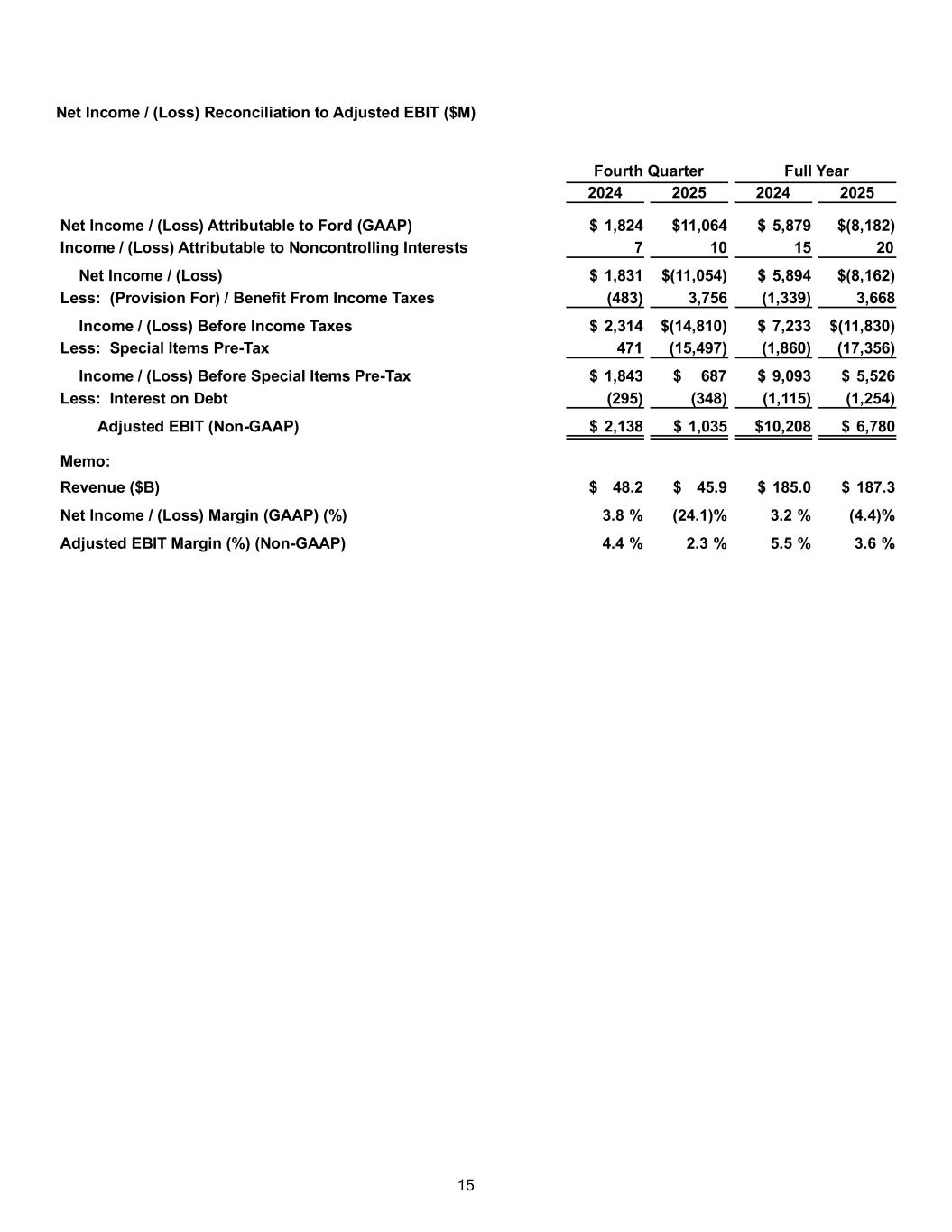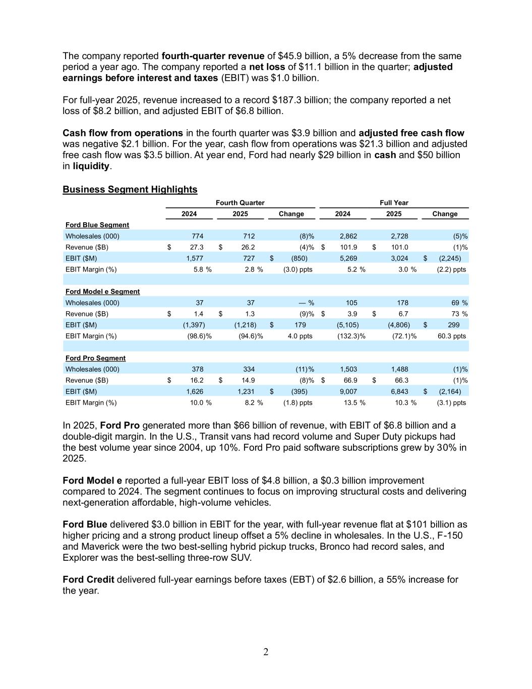 2 The company reported fourth-quarter revenue of $45.9 billion, a 5% decrease from the same period a year ago. The company reported a net loss of $11.1 billion in the quarter; adjusted earnings before interest and taxes (EBIT) was $1.0 billion. For full-year 2025, revenue increased to a record $187.3 billion; the company reported a net loss of $8.2 billion, and adjusted EBIT of $6.8 billion. Cash flow from operations in the fourth quarter was $3.9 billion and adjusted free cash flow was negative $2.1 billion. For the year, cash flow from operations was $21.3 billion and adjusted free cash flow was $3.5 billion. At year end, Ford had nearly $29 billion in cash and $50 billion in liquidity. Business Segment Highlights Fourth Quarter Full Year 2024 2025 Change 2024 2025 Change Ford Blue Segment Wholesales (000) 774 712 (8)% 2,862 2,728 (5)% Revenue ($B) $ 27.3 $ 26.2 (4)% $ 101.9 $ 101.0 (1)% EBIT ($M) 1,577 727 $ (850) 5,269 3,024 $ (2,245) EBIT Margin (%) 5.8 % 2.8 % (3.0) ppts 5.2 % 3.0 % (2.2) ppts Ford Model e Segment Wholesales (000) 37 37 — % 105 178 69 % Revenue ($B) $ 1.4 $ 1.3 (9)% $ 3.9 $ 6.7 73 % EBIT ($M) (1,397) (1,218) $ 179 (5,105) (4,806) $ 299 EBIT Margin (%) (98.6) % (94.6) % 4.0 ppts (132.3)% (72.1) % 60.3 ppts Ford Pro Segment Wholesales (000) 378 334 (11) % 1,503 1,488 (1)% Revenue ($B) $ 16.2 $ 14.9 (8)% $ 66.9 $ 66.3 (1)% EBIT ($M) 1,626 1,231 $ (395) 9,007 6,843 $ (2,164) EBIT Margin (%) 10.0 % 8.2 % (1.8) ppts 13.5 % 10.3 % (3.1) ppts In 2025, Ford Pro generated more than $66 billion of revenue, with EBIT of $6.8 billion and a double-digit margin. In the U.S., Transit vans had record volume and Super Duty pickups had the best volume year since 2004, up 10%. Ford Pro paid software subscriptions grew by 30% in 2025. Ford Model e reported a full-year EBIT loss of $4.8 billion, a $0.3 billion improvement compared to 2024. The segment continues to focus on improving structural costs and delivering next-generation affordable, high-volume vehicles. Ford Blue delivered $3.0 billion in EBIT for the year, with full-year revenue flat at $101 billion as higher pricing and a strong product lineup offset a 5% decline in wholesales. In the U.S., F-150 and Maverick were the two best-selling hybrid pickup trucks, Bronco had record sales, and Explorer was the best-selling three-row SUV. Ford Credit delivered full-year earnings before taxes (EBT) of $2.6 billion, a 55% increase for the year.