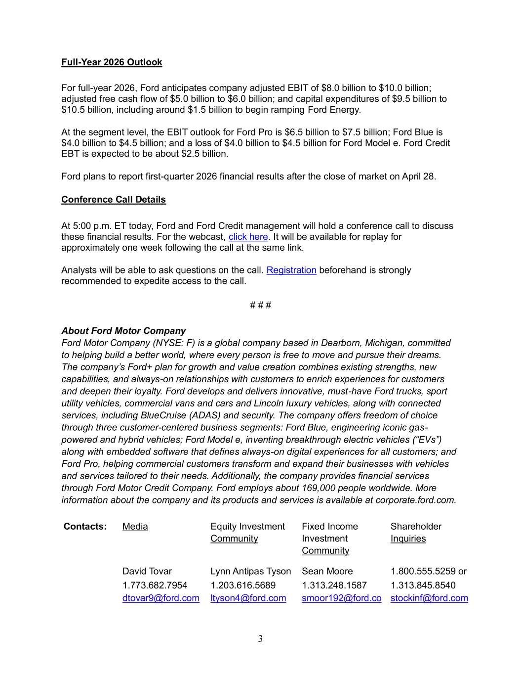 3 Full-Year 2026 Outlook For full-year 2026, Ford anticipates company adjusted EBIT of $8.0 billion to $10.0 billion; adjusted free cash flow of $5.0 billion to $6.0 billion; and capital expenditures of $9.5 billion to $10.5 billion, including around $1.5 billion to begin ramping Ford Energy. At the segment level, the EBIT outlook for Ford Pro is $6.5 billion to $7.5 billion; Ford Blue is $4.0 billion to $4.5 billion; and a loss of $4.0 billion to $4.5 billion for Ford Model e. Ford Credit EBT is expected to be about $2.5 billion. Ford plans to report first-quarter 2026 financial results after the close of market on April 28. Conference Call Details At 5:00 p.m. ET today, Ford and Ford Credit management will hold a conference call to discuss these financial results. For the webcast, click here. It will be available for replay for approximately one week following the call at the same link. Analysts will be able to ask questions on the call. Registration beforehand is strongly recommended to expedite access to the call. # # # About Ford Motor Company Ford Motor Company (NYSE: F) is a global company based in Dearborn, Michigan, committed to helping build a better world, where every person is free to move and pursue their dreams. The company’s Ford+ plan for growth and value creation combines existing strengths, new capabilities, and always-on relationships with customers to enrich experiences for customers and deepen their loyalty. Ford develops and delivers innovative, must-have Ford trucks, sport utility vehicles, commercial vans and cars and Lincoln luxury vehicles, along with connected services, including BlueCruise (ADAS) and security. The company offers freedom of choice through three customer-centered business segments: Ford Blue, engineering iconic gas- powered and hybrid vehicles; Ford Model e, inventing breakthrough electric vehicles (“EVs”) along with embedded software that defines always-on digital experiences for all customers; and Ford Pro, helping commercial customers transform and expand their businesses with vehicles and services tailored to their needs. Additionally, the company provides financial services through Ford Motor Credit Company. Ford employs about 169,000 people worldwide. More information about the company and its products and services is available at corporate.ford.com. Contacts: Media Equity Investment Community Fixed Income Investment Community Shareholder Inquiries David Tovar Lynn Antipas Tyson Sean Moore 1.800.555.5259 or 1.773.682.7954 1.203.616.5689 1.313.248.1587 1.313.845.8540 dtovar9@ford.com ltyson4@ford.com smoor192@ford.co m stockinf@ford.com