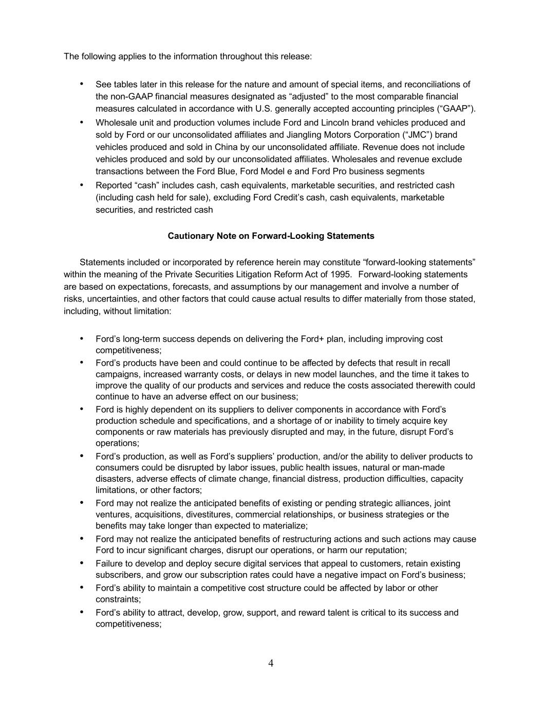 4 The following applies to the information throughout this release: • See tables later in this release for the nature and amount of special items, and reconciliations of the non-GAAP financial measures designated as “adjusted” to the most comparable financial measures calculated in accordance with U.S. generally accepted accounting principles (“GAAP”). • Wholesale unit and production volumes include Ford and Lincoln brand vehicles produced and sold by Ford or our unconsolidated affiliates and Jiangling Motors Corporation (“JMC”) brand vehicles produced and sold in China by our unconsolidated affiliate. Revenue does not include vehicles produced and sold by our unconsolidated affiliates. Wholesales and revenue exclude transactions between the Ford Blue, Ford Model e and Ford Pro business segments • Reported “cash” includes cash, cash equivalents, marketable securities, and restricted cash (including cash held for sale), excluding Ford Credit’s cash, cash equivalents, marketable securities, and restricted cash Cautionary Note on Forward-Looking Statements Statements included or incorporated by reference herein may constitute “forward-looking statements” within the meaning of the Private Securities Litigation Reform Act of 1995. Forward-looking statements are based on expectations, forecasts, and assumptions by our management and involve a number of risks, uncertainties, and other factors that could cause actual results to differ materially from those stated, including, without limitation: • Ford’s long-term success depends on delivering the Ford+ plan, including improving cost competitiveness; • Ford’s products have been and could continue to be affected by defects that result in recall campaigns, increased warranty costs, or delays in new model launches, and the time it takes to improve the quality of our products and services and reduce the costs associated therewith could continue to have an adverse effect on our business; • Ford is highly dependent on its suppliers to deliver components in accordance with Ford’s production schedule and specifications, and a shortage of or inability to timely acquire key components or raw materials has previously disrupted and may, in the future, disrupt Ford’s operations; • Ford’s production, as well as Ford’s suppliers’ production, and/or the ability to deliver products to consumers could be disrupted by labor issues, public health issues, natural or man-made disasters, adverse effects of climate change, financial distress, production difficulties, capacity limitations, or other factors; • Ford may not realize the anticipated benefits of existing or pending strategic alliances, joint ventures, acquisitions, divestitures, commercial relationships, or business strategies or the benefits may take longer than expected to materialize; • Ford may not realize the anticipated benefits of restructuring actions and such actions may cause Ford to incur significant charges, disrupt our operations, or harm our reputation; • Failure to develop and deploy secure digital services that appeal to customers, retain existing subscribers, and grow our subscription rates could have a negative impact on Ford’s business; • Ford’s ability to maintain a competitive cost structure could be affected by labor or other constraints; • Ford’s ability to attract, develop, grow, support, and reward talent is critical to its success and competitiveness;