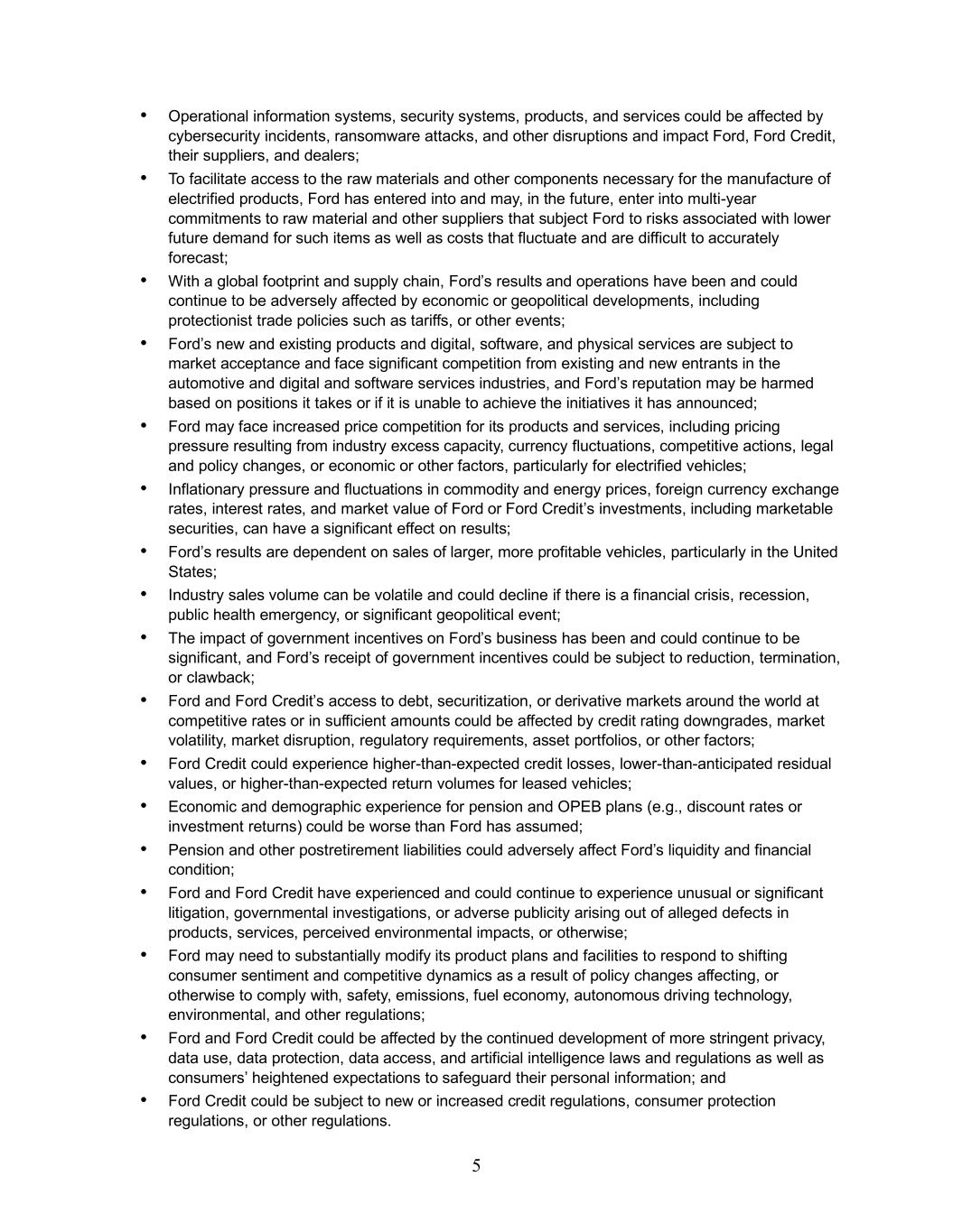 5 • Operational information systems, security systems, products, and services could be affected by cybersecurity incidents, ransomware attacks, and other disruptions and impact Ford, Ford Credit, their suppliers, and dealers; • To facilitate access to the raw materials and other components necessary for the manufacture of electrified products, Ford has entered into and may, in the future, enter into multi-year commitments to raw material and other suppliers that subject Ford to risks associated with lower future demand for such items as well as costs that fluctuate and are difficult to accurately forecast; • With a global footprint and supply chain, Ford’s results and operations have been and could continue to be adversely affected by economic or geopolitical developments, including protectionist trade policies such as tariffs, or other events; • Ford’s new and existing products and digital, software, and physical services are subject to market acceptance and face significant competition from existing and new entrants in the automotive and digital and software services industries, and Ford’s reputation may be harmed based on positions it takes or if it is unable to achieve the initiatives it has announced; • Ford may face increased price competition for its products and services, including pricing pressure resulting from industry excess capacity, currency fluctuations, competitive actions, legal and policy changes, or economic or other factors, particularly for electrified vehicles; • Inflationary pressure and fluctuations in commodity and energy prices, foreign currency exchange rates, interest rates, and market value of Ford or Ford Credit’s investments, including marketable securities, can have a significant effect on results; • Ford’s results are dependent on sales of larger, more profitable vehicles, particularly in the United States; • Industry sales volume can be volatile and could decline if there is a financial crisis, recession, public health emergency, or significant geopolitical event; • The impact of government incentives on Ford’s business has been and could continue to be significant, and Ford’s receipt of government incentives could be subject to reduction, termination, or clawback; • Ford and Ford Credit’s access to debt, securitization, or derivative markets around the world at competitive rates or in sufficient amounts could be affected by credit rating downgrades, market volatility, market disruption, regulatory requirements, asset portfolios, or other factors; • Ford Credit could experience higher-than-expected credit losses, lower-than-anticipated residual values, or higher-than-expected return volumes for leased vehicles; • Economic and demographic experience for pension and OPEB plans (e.g., discount rates or investment returns) could be worse than Ford has assumed; • Pension and other postretirement liabilities could adversely affect Ford’s liquidity and financial condition; • Ford and Ford Credit have experienced and could continue to experience unusual or significant litigation, governmental investigations, or adverse publicity arising out of alleged defects in products, services, perceived environmental impacts, or otherwise; • Ford may need to substantially modify its product plans and facilities to respond to shifting consumer sentiment and competitive dynamics as a result of policy changes affecting, or otherwise to comply with, safety, emissions, fuel economy, autonomous driving technology, environmental, and other regulations; • Ford and Ford Credit could be affected by the continued development of more stringent privacy, data use, data protection, data access, and artificial intelligence laws and regulations as well as consumers’ heightened expectations to safeguard their personal information; and • Ford Credit could be subject to new or increased credit regulations, consumer protection regulations, or other regulations.