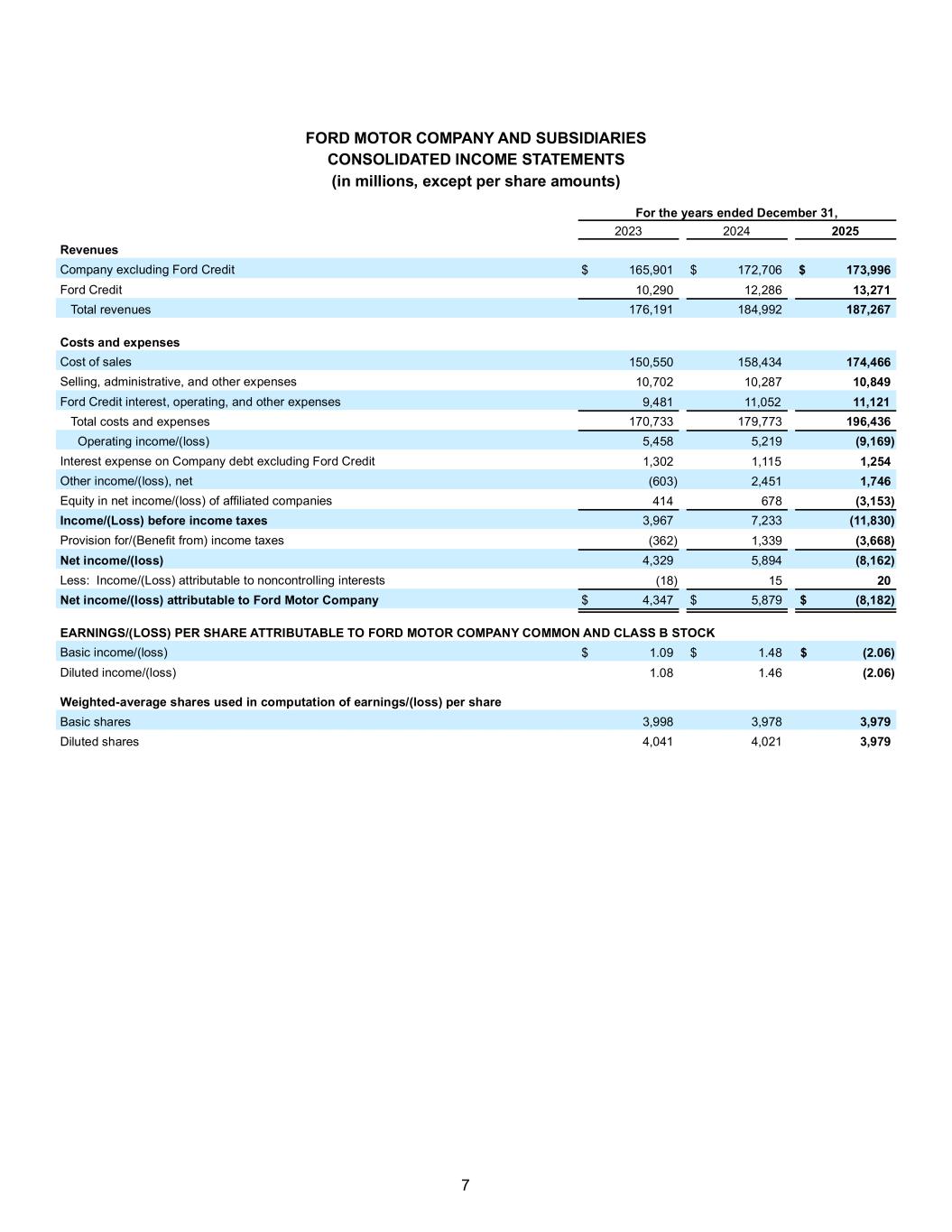 7 FORD MOTOR COMPANY AND SUBSIDIARIES CONSOLIDATED INCOME STATEMENTS (in millions, except per share amounts) For the years ended December 31, 2023 2024 2025 Revenues Company excluding Ford Credit ........................................................................................................................................................................... $ 165,901 $ 172,706 $ 173,996 Ford Credit ........................................................................................................................................................................... 10,290 12,286 13,271 Total revenues ........................................................................................................................................................................ 176,191 184,992 187,267 Costs and expenses Cost of sales ........................................................................................................................................................................... 150,550 158,434 174,466 Selling, administrative, and other expenses ........................................................................................................................................................................... 10,702 10,287 10,849 Ford Credit interest, operating, and other expenses ........................................................................................................................................................................... 9,481 11,052 11,121 Total costs and expenses ........................................................................................................................................................................ 170,733 179,773 196,436 Operating income/(loss) 5,458 5,219 (9,169) Interest expense on Company debt excluding Ford Credit ........................................................................................................................................................................... 1,302 1,115 1,254 Other income/(loss), net ........................................................................................................................................................................... (603) 2,451 1,746 Equity in net income/(loss) of affiliated companies ........................................................................................................................................................................... 414 678 (3,153) Income/(Loss) before income taxes ........................................................................................................................................................................... 3,967 7,233 (11,830) Provision for/(Benefit from) income taxes ........................................................................................................................................................................... (362) 1,339 (3,668) Net income/(loss) ........................................................................................................................................................................... 4,329 5,894 (8,162) Less: Income/(Loss) attributable to noncontrolling interests ........................................................................................................................................................................... (18) 15 20 Net income/(loss) attributable to Ford Motor Company ........................................................................................................................................................................... $ 4,347 $ 5,879 $ (8,182) EARNINGS/(LOSS) PER SHARE ATTRIBUTABLE TO FORD MOTOR COMPANY COMMON AND CLASS B STOCK Basic income/(loss) ........................................................................................................................................................................... $ 1.09 $ 1.48 $ (2.06) Diluted income/(loss) ........................................................................................................................................................................... 1.08 1.46 (2.06) Weighted-average shares used in computation of earnings/(loss) per share Basic shares 3,998 3,978 3,979 Diluted shares 4,041 4,021 3,979