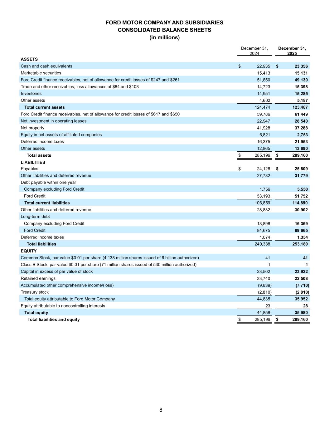 8 FORD MOTOR COMPANY AND SUBSIDIARIES CONSOLIDATED BALANCE SHEETS (in millions) December 31, 2024 December 31, 2025 ASSETS Cash and cash equivalents ............................................................................................................................................................................................................... $ 22,935 $ 23,356 Marketable securities ............................................................................................................................................................................................................... 15,413 15,131 Ford Credit finance receivables, net of allowance for credit losses of $247 and $261 ............................................................................................................................................................................................................... 51,850 49,130 Trade and other receivables, less allowances of $84 and $108 ............................................................................................................................................................................................................... 14,723 15,398 Inventories ............................................................................................................................................................................................................... 14,951 15,285 Other assets ............................................................................................................................................................................................................... 4,602 5,187 Total current assets ............................................................................................................................................................................................................ 124,474 123,487 Ford Credit finance receivables, net of allowance for credit losses of $617 and $650 ............................................................................................................................................................................................................... 59,786 61,449 Net investment in operating leases ............................................................................................................................................................................................................... 22,947 28,540 Net property ............................................................................................................................................................................................................... 41,928 37,288 Equity in net assets of affiliated companies ............................................................................................................................................................................................................... 6,821 2,753 Deferred income taxes ............................................................................................................................................................................................................... 16,375 21,953 Other assets ............................................................................................................................................................................................................... 12,865 13,690 Total assets .......................................................................................................................................................................................................... $ 285,196 $ 289,160 LIABILITIES Payables ............................................................................................................................................................................................................... $ 24,128 $ 25,809 Other liabilities and deferred revenue ............................................................................................................................................................................................................... 27,782 31,779 Debt payable within one year ............................................................................................................................................................................................................... Company excluding Ford Credit ............................................................................................................................................................................................................ 1,756 5,550 Ford Credit ............................................................................................................................................................................................................ 53,193 51,752 Total current liabilities ............................................................................................................................................................................................................ 106,859 114,890 Other liabilities and deferred revenue ............................................................................................................................................................................................................... 28,832 30,902 Long-term debt ............................................................................................................................................................................................................... Company excluding Ford Credit ............................................................................................................................................................................................................ 18,898 16,369 Ford Credit ........................................................................................