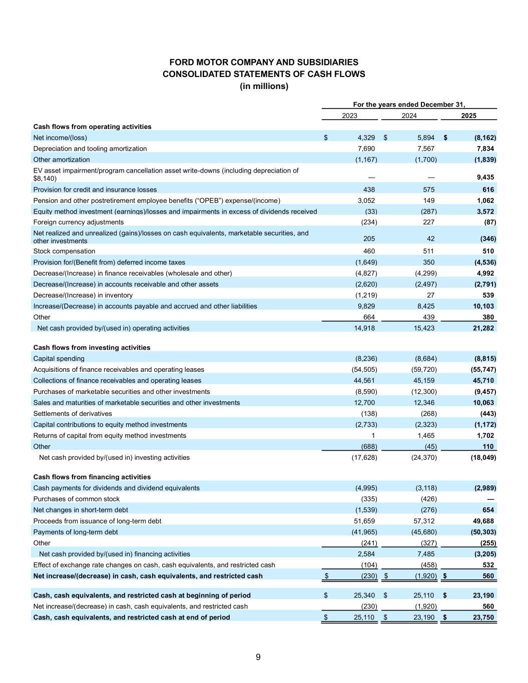 9 FORD MOTOR COMPANY AND SUBSIDIARIES CONSOLIDATED STATEMENTS OF CASH FLOWS (in millions) For the years ended December 31, 2023 2024 2025 Cash flows from operating activities Net income/(loss) ........................................................................................................................................................................... $ 4,329 $ 5,894 $ (8,162) Depreciation and tooling amortization ........................................................................................................................................................................... 7,690 7,567 7,834 Other amortization ........................................................................................................................................................................... (1,167) (1,700) (1,839) EV asset impairment/program cancellation asset write-downs (including depreciation of $8,140) ........................................................................................................................................................................... — — 9,435 Provision for credit and insurance losses ........................................................................................................................................................................... 438 575 616 Pension and other postretirement employee benefits (“OPEB”) expense/(income) ........................................................................................................................................................................... 3,052 149 1,062 Equity method investment (earnings)/losses and impairments in excess of dividends received ........................................................................................................................................................................... (33) (287) 3,572 Foreign currency adjustments ........................................................................................................................................................................... (234) 227 (87) Net realized and unrealized (gains)/losses on cash equivalents, marketable securities, and other investments ........................................................................................................................................................................... 205 42 (346) Stock compensation ........................................................................................................................................................................... 460 511 510 Provision for/(Benefit from) deferred income taxes ........................................................................................................................................................................... (1,649) 350 (4,536) Decrease/(Increase) in finance receivables (wholesale and other) ........................................................................................................................................................................... (4,827) (4,299) 4,992 Decrease/(Increase) in accounts receivable and other assets ........................................................................................................................................................................... (2,620) (2,497) (2,791) Decrease/(Increase) in inventory ........................................................................................................................................................................... (1,219) 27 539 Increase/(Decrease) in accounts payable and accrued and other liabilities ........................................................................................................................................................................... 9,829 8,425 10,103 Other ........................................................................................................................................................................... 664 439 380 Net cash provided by/(used in) operating activities ......................................................................................................................................................................... 14,918 15,423 21,282 Cash flows from investing activities Capital spending ........................................................................................................................................................................... (8,236) (8,684) (8,815) Acquisitions of finance receivables and operating leases ........................................................................................................................................................................... (54,505) (59,720) (55,747) Collections of finance receivables and operating leases ........................................................................................................................................................................... 44,561 45,159 45,710 Purchases of marketable securities and other investments ........................................................................................................................................................................... (8,590) (12,300) (9,457) Sales and maturities of marketable securities and other investments ........................................................................................................................................................................... 12,700 12,346 10,063 Settlements of derivatives ........................................................................................................................................................................... (138) (268) (443) Capital contributions to equity method investments ........................................................................................................................................................................... (2,733) (2,3