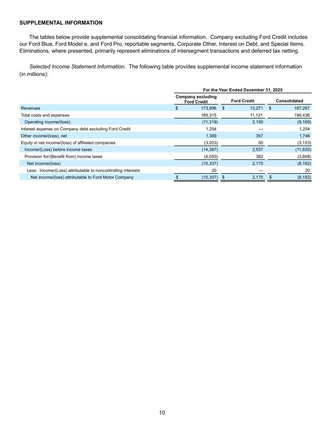 10 SUPPLEMENTAL INFORMATION The tables below provide supplemental consolidating financial information. Company excluding Ford Credit includes our Ford Blue, Ford Model e, and Ford Pro, reportable segments, Corporate Other, Interest on Debt, and Special Items. Eliminations, where presented, primarily represent eliminations of intersegment transactions and deferred tax netting. Selected Income Statement Information. The following table provides supplemental income statement information (in millions): For the Year Ended December 31, 2025 Company excluding Ford Credit Ford Credit Consolidated Revenues $ 173,996 $ 13,271 $ 187,267 Total costs and expenses 185,315 11,121 196,436 Operating income/(loss) (11,319) 2,150 (9,169) Interest expense on Company debt excluding Ford Credit 1,254 — 1,254 Other income/(loss), net 1,389 357 1,746 Equity in net income/(loss) of affiliated companies (3,203) 50 (3,153) Income/(Loss) before income taxes (14,387) 2,557 (11,830) Provision for/(Benefit from) income taxes (4,050) 382 (3,668) Net income/(loss) (10,337) 2,175 (8,162) Less: Income/(Loss) attributable to noncontrolling interests 20 — 20 Net income/(loss) attributable to Ford Motor Company $ (10,357) $ 2,175 $ (8,182)