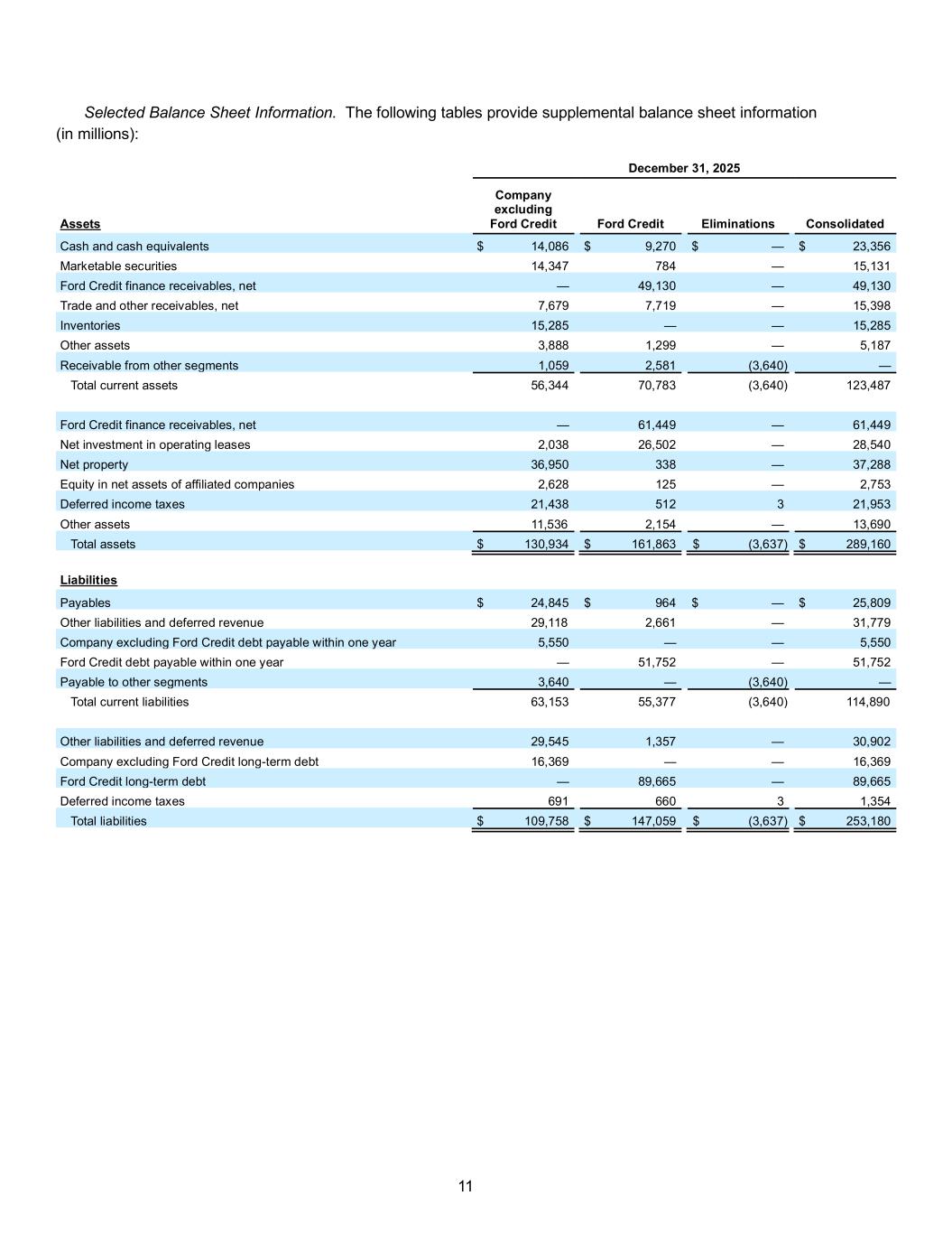 11 Selected Balance Sheet Information. The following tables provide supplemental balance sheet information (in millions): December 31, 2025 Assets Company excluding Ford Credit Ford Credit Eliminations Consolidated Cash and cash equivalents $ 14,086 $ 9,270 $ — $ 23,356 Marketable securities 14,347 784 — 15,131 Ford Credit finance receivables, net — 49,130 — 49,130 Trade and other receivables, net 7,679 7,719 — 15,398 Inventories 15,285 — — 15,285 Other assets 3,888 1,299 — 5,187 Receivable from other segments 1,059 2,581 (3,640) — Total current assets 56,344 70,783 (3,640) 123,487 Ford Credit finance receivables, net — 61,449 — 61,449 Net investment in operating leases 2,038 26,502 — 28,540 Net property 36,950 338 — 37,288 Equity in net assets of affiliated companies 2,628 125 — 2,753 Deferred income taxes 21,438 512 3 21,953 Other assets 11,536 2,154 — 13,690 Total assets $ 130,934 $ 161,863 $ (3,637) $ 289,160 Liabilities Payables $ 24,845 $ 964 $ — $ 25,809 Other liabilities and deferred revenue 29,118 2,661 — 31,779 Company excluding Ford Credit debt payable within one year 5,550 — — 5,550 Ford Credit debt payable within one year — 51,752 — 51,752 Payable to other segments 3,640 — (3,640) — Total current liabilities 63,153 55,377 (3,640) 114,890 Other liabilities and deferred revenue 29,545 1,357 — 30,902 Company excluding Ford Credit long-term debt 16,369 — — 16,369 Ford Credit long-term debt — 89,665 — 89,665 Deferred income taxes 691 660 3 1,354 Total liabilities $ 109,758 $ 147,059 $ (3,637) $ 253,180
