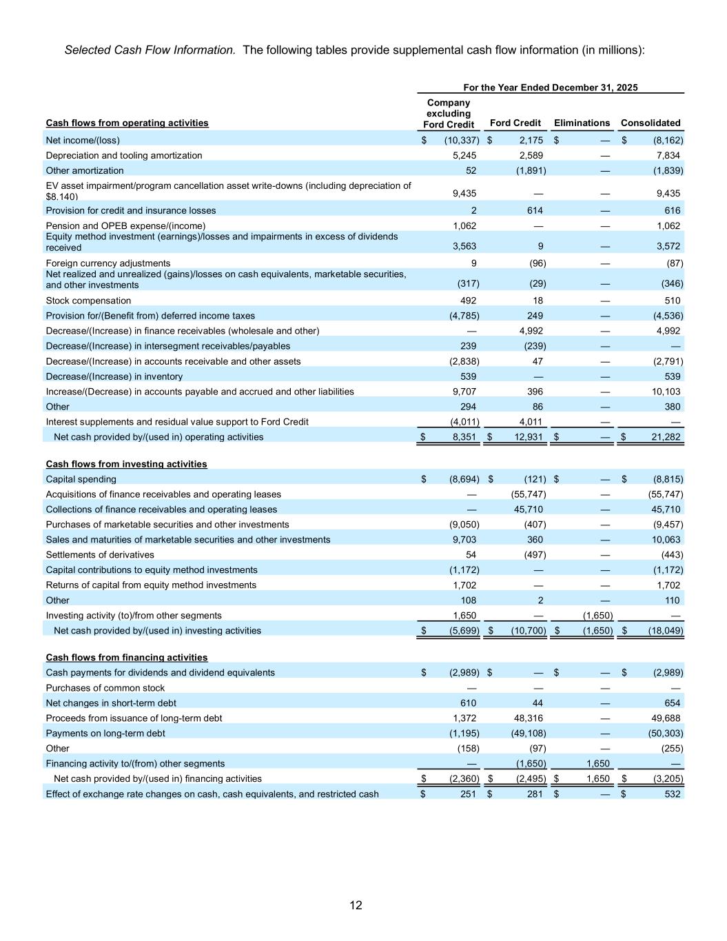 12 Selected Cash Flow Information. The following tables provide supplemental cash flow information (in millions): For the Year Ended December 31, 2025 Cash flows from operating activities Company excluding Ford Credit Ford Credit Eliminations Consolidated Net income/(loss) $ (10,337) $ 2,175 $ — $ (8,162) Depreciation and tooling amortization 5,245 2,589 — 7,834 Other amortization 52 (1,891) — (1,839) EV asset impairment/program cancellation asset write-downs (including depreciation of $8,140) 9,435 — — 9,435 Provision for credit and insurance losses 2 614 — 616 Pension and OPEB expense/(income) 1,062 — — 1,062 Equity method investment (earnings)/losses and impairments in excess of dividends received 3,563 9 — 3,572 Foreign currency adjustments 9 (96) — (87) Net realized and unrealized (gains)/losses on cash equivalents, marketable securities, and other investments (317) (29) — (346) Stock compensation 492 18 — 510 Provision for/(Benefit from) deferred income taxes (4,785) 249 — (4,536) Decrease/(Increase) in finance receivables (wholesale and other) — 4,992 — 4,992 Decrease/(Increase) in intersegment receivables/payables 239 (239) — — Decrease/(Increase) in accounts receivable and other assets (2,838) 47 — (2,791) Decrease/(Increase) in inventory 539 — — 539 Increase/(Decrease) in accounts payable and accrued and other liabilities 9,707 396 — 10,103 Other 294 86 — 380 Interest supplements and residual value support to Ford Credit (4,011) 4,011 — — Net cash provided by/(used in) operating activities $ 8,351 $ 12,931 $ — $ 21,282 Cash flows from investing activities Capital spending $ (8,694) $ (121) $ — $ (8,815) Acquisitions of finance receivables and operating leases — (55,747) — (55,747) Collections of finance receivables and operating leases — 45,710 — 45,710 Purchases of marketable securities and other investments (9,050) (407) — (9,457) Sales and maturities of marketable securities and other investments 9,703 360 — 10,063 Settlements of derivatives 54 (497) — (443) Capital contributions to equity method investments ................................................................................................................................................................ (1,172) — — (1,172) Returns of capital from equity method investments ................................................................................................................................................................ 1,702 — — 1,702 Other 108 2 — 110 Investing activity (to)/from other segments 1,650 — (1,650) — Net cash provided by/(used in) investing activities $ (5,699) $ (10,700) $ (1,650) $ (18,049) Cash flows from financing activities Cash payments for dividends and dividend equivalents $ (2,989) $ — $ — $ (2,989) Purchases of common stock — — — — Net changes in short-term debt 610 44 — 654 Proceeds from issuance of long-term debt 1,372 48,316 — 49,688 Payments on long-term debt (1,195) (49,108) — (50,303) Other (158) (97) — (255) Financing activity to/(from) other segments — (1,650) 1,650 — Net cash provided by/(used in) financing activities $ (2,360) $ (2,495) $ 1,650 $ (3,205) Effect of exchange rate changes on cash, cash equivalents, and restricted cash $ 251 $ 281 $ — $ 532
