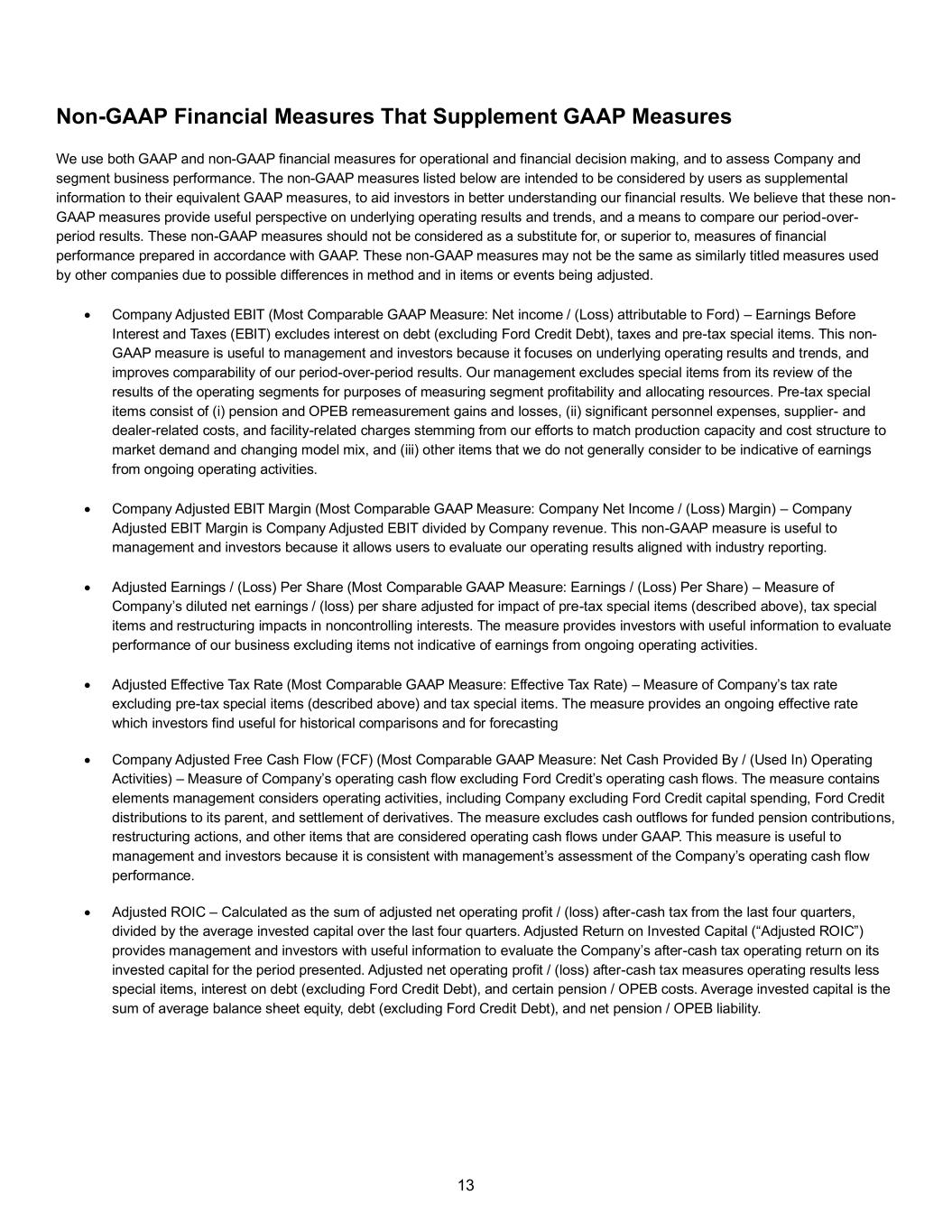 13 Non-GAAP Financial Measures That Supplement GAAP Measures We use both GAAP and non-GAAP financial measures for operational and financial decision making, and to assess Company and segment business performance. The non-GAAP measures listed below are intended to be considered by users as supplemental information to their equivalent GAAP measures, to aid investors in better understanding our financial results. We believe that these non- GAAP measures provide useful perspective on underlying operating results and trends, and a means to compare our period-over- period results. These non-GAAP measures should not be considered as a substitute for, or superior to, measures of financial performance prepared in accordance with GAAP. These non-GAAP measures may not be the same as similarly titled measures used by other companies due to possible differences in method and in items or events being adjusted. • Company Adjusted EBIT (Most Comparable GAAP Measure: Net income / (Loss) attributable to Ford) – Earnings Before Interest and Taxes (EBIT) excludes interest on debt (excluding Ford Credit Debt), taxes and pre-tax special items. This non- GAAP measure is useful to management and investors because it focuses on underlying operating results and trends, and improves comparability of our period-over-period results. Our management excludes special items from its review of the results of the operating segments for purposes of measuring segment profitability and allocating resources. Pre-tax special items consist of (i) pension and OPEB remeasurement gains and losses, (ii) significant personnel expenses, supplier- and dealer-related costs, and facility-related charges stemming from our efforts to match production capacity and cost structure to market demand and changing model mix, and (iii) other items that we do not generally consider to be indicative of earnings from ongoing operating activities. • Company Adjusted EBIT Margin (Most Comparable GAAP Measure: Company Net Income / (Loss) Margin) – Company Adjusted EBIT Margin is Company Adjusted EBIT divided by Company revenue. This non-GAAP measure is useful to management and investors because it allows users to evaluate our operating results aligned with industry reporting. • Adjusted Earnings / (Loss) Per Share (Most Comparable GAAP Measure: Earnings / (Loss) Per Share) – Measure of Company’s diluted net earnings / (loss) per share adjusted for impact of pre-tax special items (described above), tax special items and restructuring impacts in noncontrolling interests. The measure provides investors with useful information to evaluate performance of our business excluding items not indicative of earnings from ongoing operating activities. • Adjusted Effective Tax Rate (Most Comparable GAAP Measure: Effective Tax Rate) – Measure of Company’s tax rate excluding pre-tax special items (described above) and tax special items. The measure provides an ongoing effective rate which investors find useful for historical comparisons and for forecasting • Company Adjusted Free Cash Flow (FCF) (Most Comparable GAAP Measure: Net Cash Provided By / (Used In) Operating Activities) – Measure of Company’s operating cash flow excluding Ford Credit’s operating cash flows. The measure contains elements management considers operating activities, including Company excluding Ford Credit capital spending, Ford Credit distributions to its parent, and settlement of derivatives. The measure excludes cash outflows for funded pension contributions, restructuring actions, and other items that are considered operating cash flows under GAAP. This measure is useful to management and investors because it is consistent with management’s assessment of the Company’s operating cash flow performance. • Adjusted ROIC – Calculated as the sum of adjusted net operating profit / (loss) after-cash tax from the last four quarters, divided by the average invested capital over the last four quarters. Adjusted Return on Invested Capital (“Adjusted ROIC”) provides management and investors with useful information to evaluate the Company’s after-cash tax operating return on its invested capital for the period presented. Adjusted net operating profit / (loss) after-cash tax measures operating results less special items, interest on debt (excluding Ford Credit Debt), and certain pension / OPEB costs. Average invested capital is the sum of average balance sheet equity, debt (excluding Ford Credit Debt), and net pension / OPEB liability.