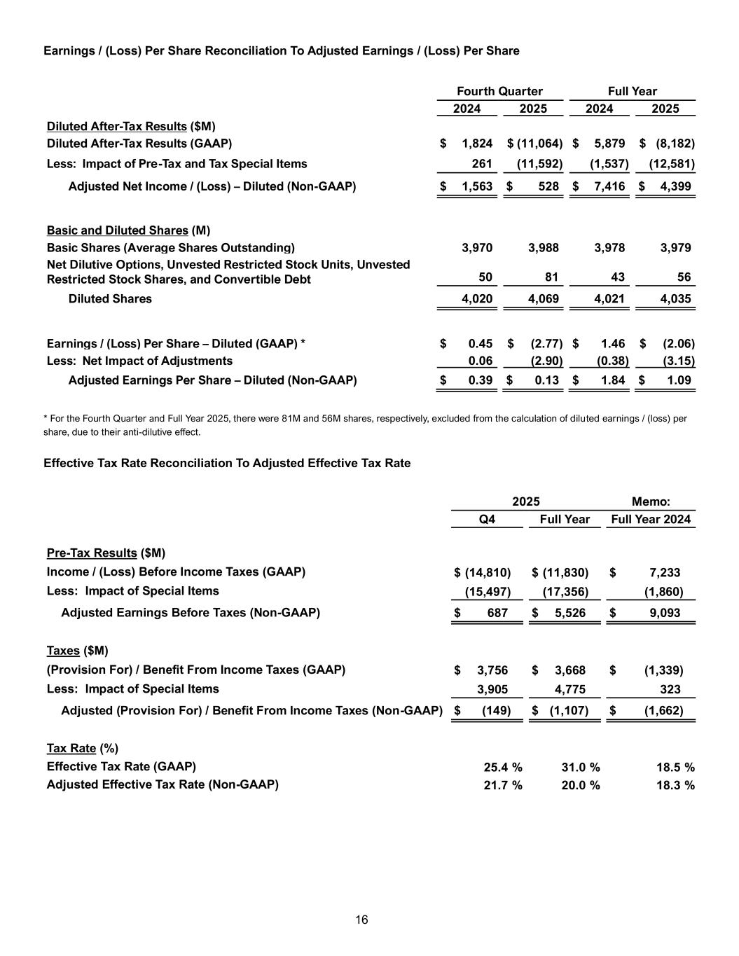 16 Earnings / (Loss) Per Share Reconciliation To Adjusted Earnings / (Loss) Per Share Fourth Quarter Full Year 2024 2025 2024 2025 Diluted After-Tax Results ($M) Diluted After-Tax Results (GAAP) $ 1,824 $ (11,064) $ 5,879 $ (8,182) Less: Impact of Pre-Tax and Tax Special Items 261 (11,592) (1,537) (12,581) Adjusted Net Income / (Loss) – Diluted (Non-GAAP) $ 1,563 $ 528 $ 7,416 $ 4,399 Basic and Diluted Shares (M) Basic Shares (Average Shares Outstanding) 3,970 3,988 3,978 3,979 Net Dilutive Options, Unvested Restricted Stock Units, Unvested Restricted Stock Shares, and Convertible Debt 50 81 43 56 Diluted Shares 4,020 4,069 4,021 4,035 Earnings / (Loss) Per Share – Diluted (GAAP) * $ 0.45 $ (2.77) $ 1.46 $ (2.06) Less: Net Impact of Adjustments 0.06 (2.90) (0.38) (3.15) Adjusted Earnings Per Share – Diluted (Non-GAAP) $ 0.39 $ 0.13 $ 1.84 $ 1.09 * For the Fourth Quarter and Full Year 2025, there were 81M and 56M shares, respectively, excluded from the calculation of diluted earnings / (loss) per share, due to their anti-dilutive effect. Effective Tax Rate Reconciliation To Adjusted Effective Tax Rate 2025 Memo: Q4 Full Year Full Year 2024 Pre-Tax Results ($M) Income / (Loss) Before Income Taxes (GAAP) $ (14,810) $ (11,830) $ 7,233 Less: Impact of Special Items (15,497) (17,356) (1,860) Adjusted Earnings Before Taxes (Non-GAAP) $ 687 $ 5,526 $ 9,093 Taxes ($M) (Provision For) / Benefit From Income Taxes (GAAP) $ 3,756 $ 3,668 $ (1,339) Less: Impact of Special Items 3,905 4,775 323 Adjusted (Provision For) / Benefit From Income Taxes (Non-GAAP) $ (149) $ (1,107) $ (1,662) Tax Rate (%) Effective Tax Rate (GAAP) 25.4 % 31.0 % 18.5 % Adjusted Effective Tax Rate (Non-GAAP) 21.7 % 20.0 % 18.3 %