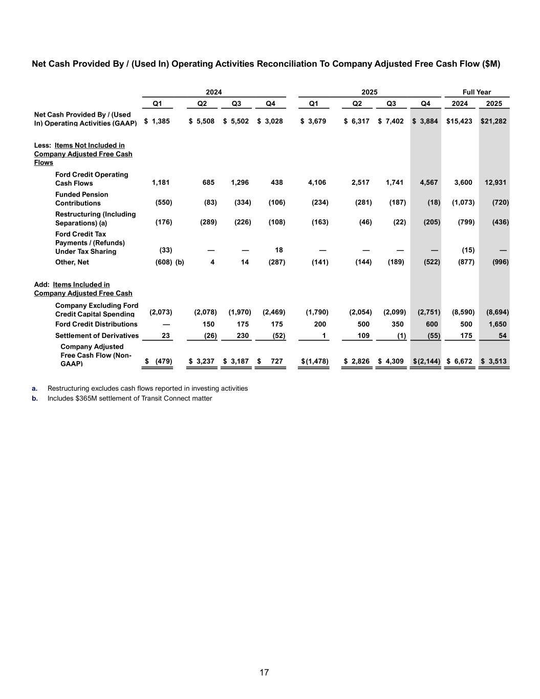 17 Net Cash Provided By / (Used In) Operating Activities Reconciliation To Company Adjusted Free Cash Flow ($M) 2024 2025 Full Year Q1 Q2 Q3 Q4 Q1 Q2 Q3 Q4 2024 2025 Net Cash Provided By / (Used In) Operating Activities (GAAP) $ 1,385 $ 5,508 $ 5,502 $ 3,028 $ 3,679 $ 6,317 $ 7,402 $ 3,884 $15,423 $21,282 Less: Items Not Included in Company Adjusted Free Cash Flows Ford Credit Operating Cash Flows 1,181 685 1,296 438 4,106 2,517 1,741 4,567 3,600 12,931 Funded Pension Contributions (550) (83) (334) (106) (234) (281) (187) (18) (1,073) (720) Restructuring (Including Separations) (a) (176) (289) (226) (108) (163) (46) (22) (205) (799) (436) Ford Credit Tax Payments / (Refunds) Under Tax Sharing Agreement (33) — — 18 — — — — (15) — Other, Net (608) (b) 4 14 (287) (141) (144) (189) (522) (877) (996) Add: Items Included in Company Adjusted Free Cash Flows Company Excluding Ford Credit Capital Spending (2,073) (2,078) (1,970) (2,469) (1,790) (2,054) (2,099) (2,751) (8,590) (8,694) Ford Credit Distributions — 150 175 175 200 500 350 600 500 1,650 Settlement of Derivatives 23 (26) 230 (52) 1 109 (1) (55) 175 54 Company Adjusted Free Cash Flow (Non- GAAP) $ (479) $ 3,237 $ 3,187 $ 727 $ (1,478) $ 2,826 $ 4,309 $ (2,144) $ 6,672 $ 3,513 a. Restructuring excludes cash flows reported in investing activities b. Includes $365M settlement of Transit Connect matter