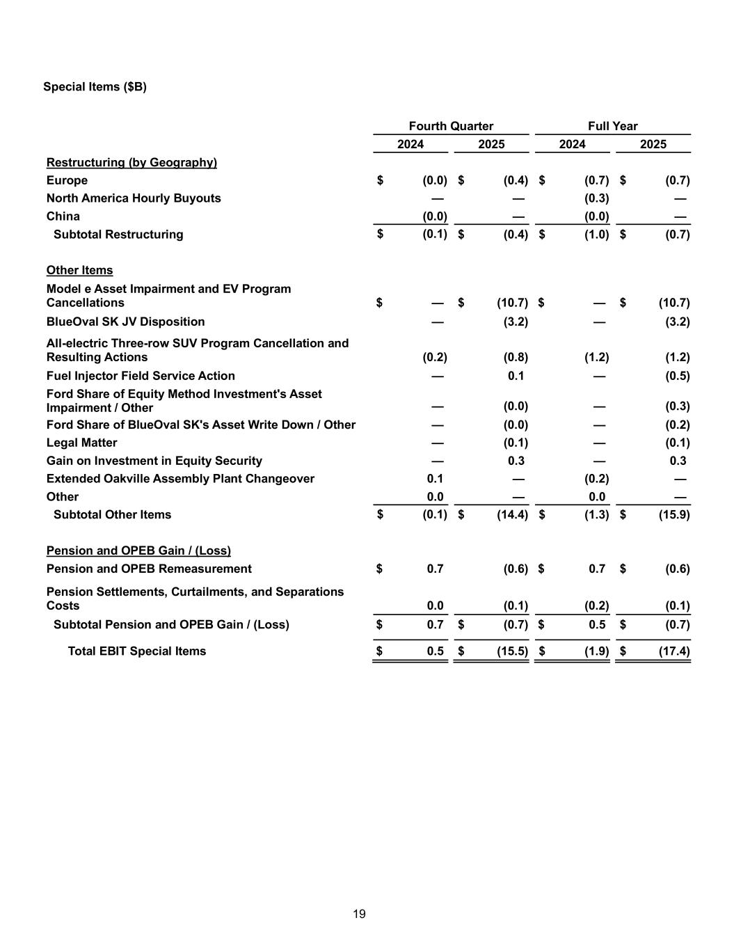 19 Special Items ($B) Fourth Quarter Full Year 2024 2025 2024 2025 Restructuring (by Geography) Europe $ (0.0) $ (0.4) $ (0.7) $ (0.7) North America Hourly Buyouts — — (0.3) — China (0.0) — (0.0) — Subtotal Restructuring $ (0.1) $ (0.4) $ (1.0) $ (0.7) Other Items Model e Asset Impairment and EV Program Cancellations $ — $ (10.7) $ — $ (10.7) BlueOval SK JV Disposition — (3.2) — (3.2) All-electric Three-row SUV Program Cancellation and Resulting Actions (0.2) (0.8) (1.2) (1.2) Fuel Injector Field Service Action — 0.1 — (0.5) Ford Share of Equity Method Investment's Asset Impairment / Other — (0.0) — (0.3) Ford Share of BlueOval SK's Asset Write Down / Other — (0.0) — (0.2) Legal Matter — (0.1) — (0.1) Gain on Investment in Equity Security — 0.3 — 0.3 Extended Oakville Assembly Plant Changeover 0.1 — (0.2) — Other 0.0 — 0.0 — Subtotal Other Items $ (0.1) $ (14.4) $ (1.3) $ (15.9) Pension and OPEB Gain / (Loss) Pension and OPEB Remeasurement $ 0.7 (0.6) $ 0.7 $ (0.6) Pension Settlements, Curtailments, and Separations Costs 0.0 (0.1) (0.2) (0.1) Subtotal Pension and OPEB Gain / (Loss) $ 0.7 $ (0.7) $ 0.5 $ (0.7) Total EBIT Special Items $ 0.5 $ (15.5) $ (1.9) $ (17.4)