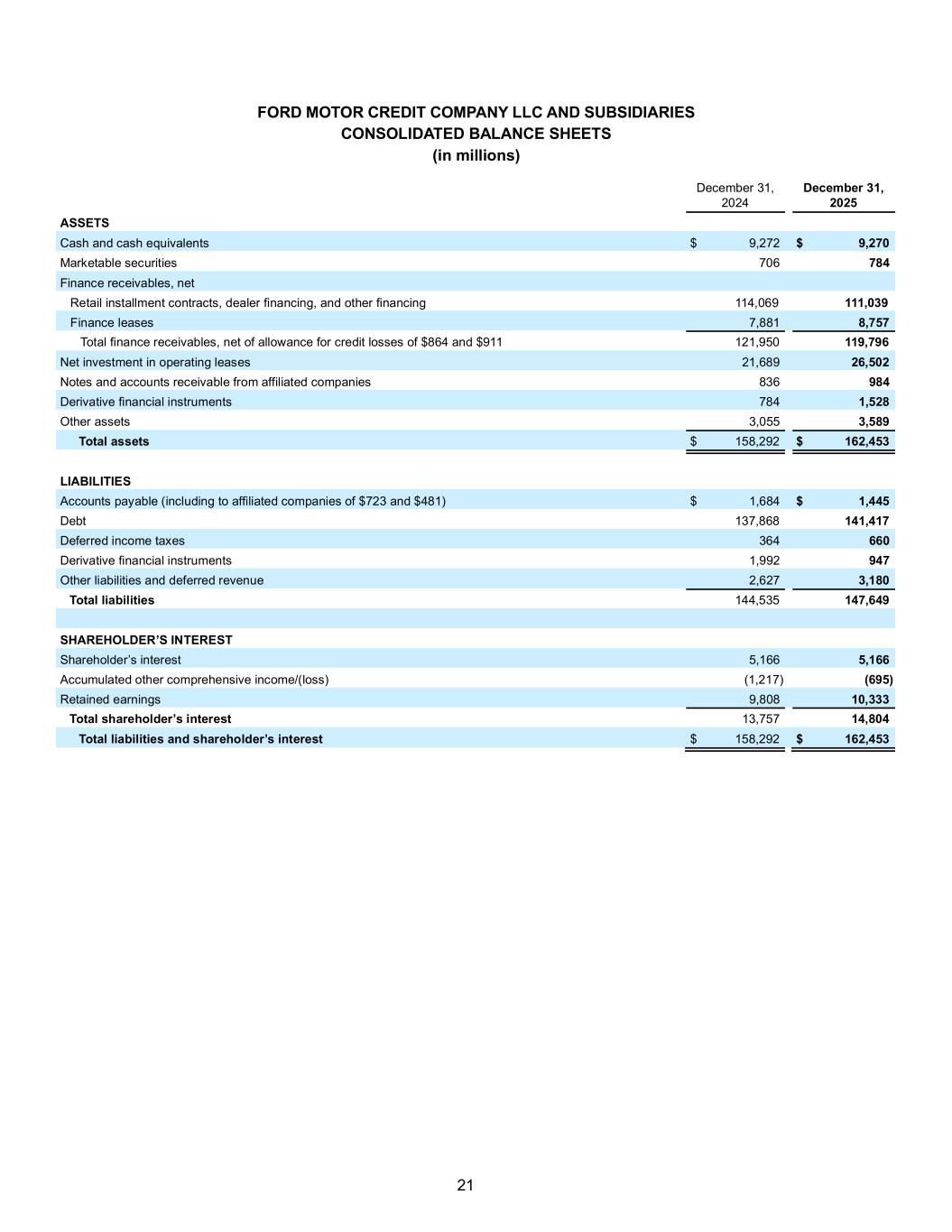 21 FORD MOTOR CREDIT COMPANY LLC AND SUBSIDIARIES CONSOLIDATED BALANCE SHEETS (in millions) December 31, 2024 December 31, 2025 ASSETS Cash and cash equivalents $ 9,272 $ 9,270 Marketable securities 706 784 Finance receivables, net Retail installment contracts, dealer financing, and other financing 114,069 111,039 Finance leases 7,881 8,757 Total finance receivables, net of allowance for credit losses of $864 and $911 121,950 119,796 Net investment in operating leases 21,689 26,502 Notes and accounts receivable from affiliated companies 836 984 Derivative financial instruments 784 1,528 Other assets 3,055 3,589 Total assets $ 158,292 $ 162,453 LIABILITIES Accounts payable (including to affiliated companies of $723 and $481) $ 1,684 $ 1,445 Debt 137,868 141,417 Deferred income taxes 364 660 Derivative financial instruments 1,992 947 Other liabilities and deferred revenue 2,627 3,180 Total liabilities 144,535 147,649 SHAREHOLDER’S INTEREST Shareholder’s interest 5,166 5,166 Accumulated other comprehensive income/(loss) (1,217) (695) Retained earnings 9,808 10,333 Total shareholder’s interest 13,757 14,804 Total liabilities and shareholder’s interest $ 158,292 $ 162,453