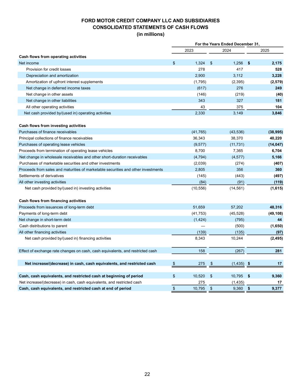 22 FORD MOTOR CREDIT COMPANY LLC AND SUBSIDIARIES CONSOLIDATED STATEMENTS OF CASH FLOWS (in millions) For the Years Ended December 31, 2023 2024 2025 Cash flows from operating activities Net income $ 1,324 $ 1,256 $ 2,175 Provision for credit losses 278 417 528 Depreciation and amortization 2,900 3,112 3,228 Amortization of upfront interest supplements (1,795) (2,395) (2,579) Net change in deferred income taxes (617) 276 249 Net change in other assets (146) (219) (40) Net change in other liabilities 343 327 181 All other operating activities 43 375 104 Net cash provided by/(used in) operating activities 2,330 3,149 3,846 Cash flows from investing activities Purchases of finance receivables (41,765) (43,536) (38,995) Principal collections of finance receivables 36,343 38,370 40,220 Purchases of operating lease vehicles (9,577) (11,731) (14,047) Proceeds from termination of operating lease vehicles 8,700 7,365 6,704 Net change in wholesale receivables and other short-duration receivables (4,794) (4,577) 5,166 Purchases of marketable securities and other investments (2,039) (274) (407) Proceeds from sales and maturities of marketable securities and other investments 2,805 356 360 Settlements of derivatives (145) (443) (497) All other investing activities (84) (91) (119) Net cash provided by/(used in) investing activities (10,556) (14,561) (1,615) Cash flows from financing activities Proceeds from issuances of long-term debt 51,659 57,202 48,316 Payments of long-term debt (41,753) (45,528) (49,108) Net change in short-term debt (1,424) (795) 44 Cash distributions to parent — (500) (1,650) All other financing activities (139) (135) (97) Net cash provided by/(used in) financing activities 8,343 10,244 (2,495) Effect of exchange rate changes on cash, cash equivalents, and restricted cash 158 (267) 281 Net increase/(decrease) in cash, cash equivalents, and restricted cash $ 275 $ (1,435) $ 17 Cash, cash equivalents, and restricted cash at beginning of period $ 10,520 $ 10,795 $ 9,360 Net increase/(decrease) in cash, cash equivalents, and restricted cash 275 (1,435) 17 Cash, cash equivalents, and restricted cash at end of period $ 10,795 $ 9,360 $ 9,377