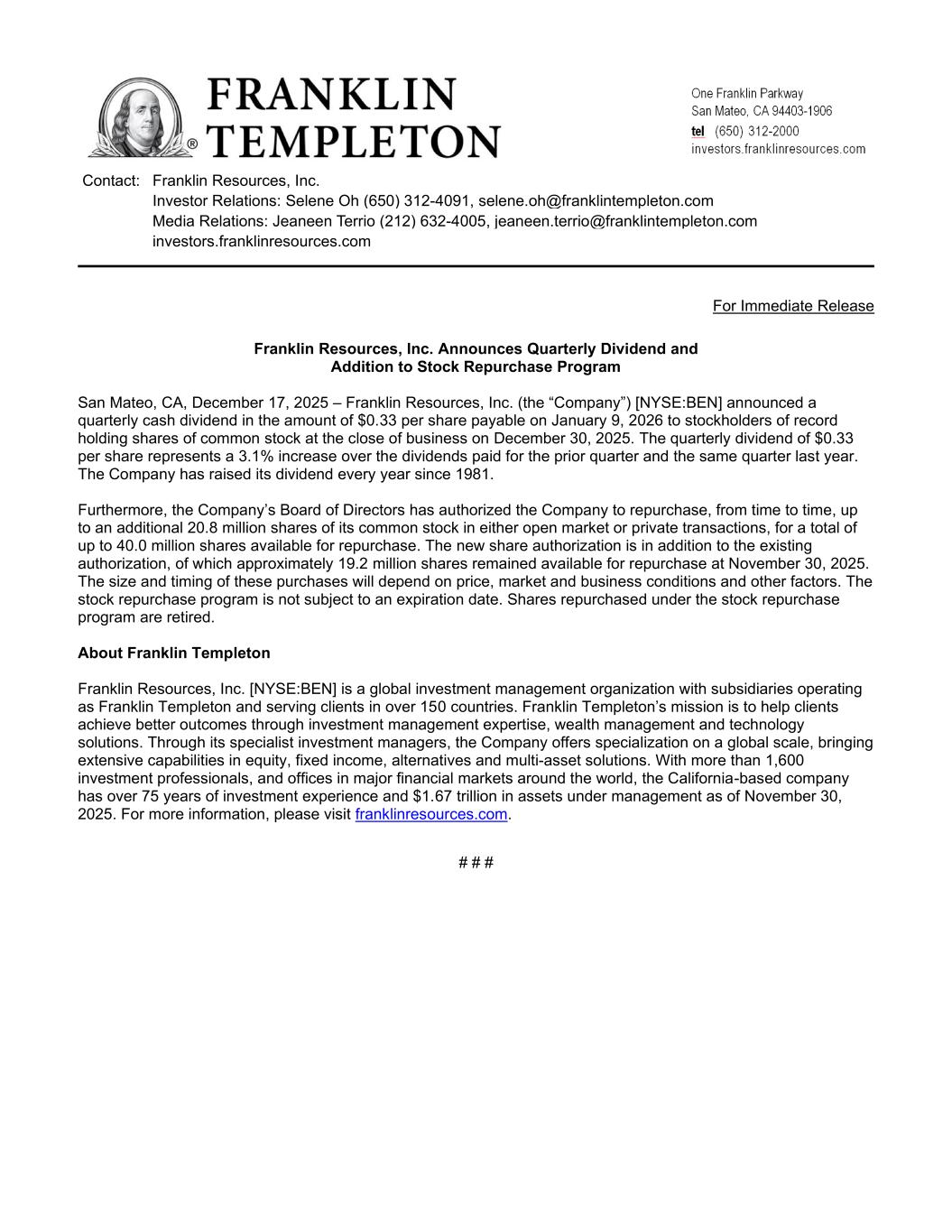 Contact: Franklin Resources, Inc. Investor Relations: Selene Oh (650) 312-4091, selene.oh@franklintempleton.com Media Relations: Jeaneen Terrio (212) 632-4005, jeaneen.terrio@franklintempleton.com investors.franklinresources.com For Immediate Release Franklin Resources, Inc. Announces Quarterly Dividend and Addition to Stock Repurchase Program San Mateo, CA, December 17, 2025 – Franklin Resources, Inc. (the “Company”) [NYSE:BEN] announced a quarterly cash dividend in the amount of $0.33 per share payable on January 9, 2026 to stockholders of record holding shares of common stock at the close of business on December 30, 2025. The quarterly dividend of $0.33 per share represents a 3.1% increase over the dividends paid for the prior quarter and the same quarter last year. The Company has raised its dividend every year since 1981. Furthermore, the Company’s Board of Directors has authorized the Company to repurchase, from time to time, up to an additional 20.8 million shares of its common stock in either open market or private transactions, for a total of up to 40.0 million shares available for repurchase. The new share authorization is in addition to the existing authorization, of which approximately 19.2 million shares remained available for repurchase at November 30, 2025. The size and timing of these purchases will depend on price, market and business conditions and other factors. The stock repurchase program is not subject to an expiration date. Shares repurchased under the stock repurchase program are retired. About Franklin Templeton Franklin Resources, Inc. [NYSE:BEN] is a global investment management organization with subsidiaries operating as Franklin Templeton and serving clients in over 150 countries. Franklin Templeton’s mission is to help clients achieve better outcomes through investment management expertise, wealth management and technology solutions. Through its specialist investment managers, the Company offers specialization on a global scale, bringing extensive capabilities in equity, fixed income, alternatives and multi-asset solutions. With more than 1,600 investment professionals, and offices in major financial markets around the world, the California-based company has over 75 years of investment experience and $1.67 trillion in assets under management as of November 30, 2025. For more information, please visit franklinresources.com. # # #