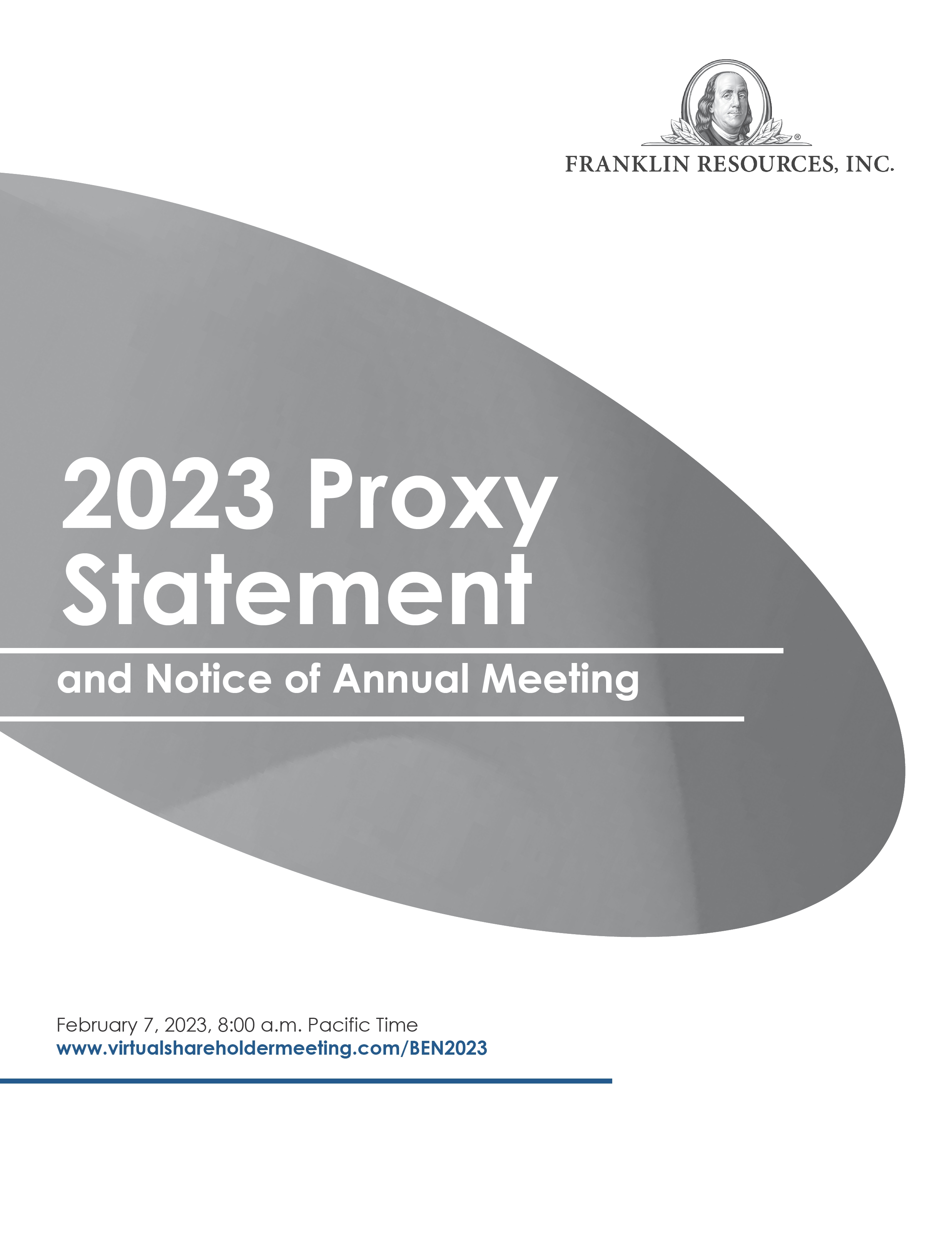 This Proxy Statement and the accompanying Notice of Annual Meeting of Stockholders are furnished in connection with the solicitation by the Board of Directors (the “Board”) of Franklin Resources, Inc., a Delaware corporation (the “Company”), of the accompanying proxy to be voted at the 2023 Annual Meeting of stockholders (the “Annual Meeting”), which will be held on Wednesday, February 7, 2023 at 8:00 a.m. Pacific Time. The Annual Meeting can be accessed by visiting www.virtualshareholdermeeting.com/BEN2023, where you will be able to listen to the meeting live and vote online. Please note that you will only be able to access the Annual Meeting by means of remote communication. This Proxy Statement and the accompanying proxy card are being mailed and/or made available to each stockholder entitled to vote on or about December 28, 2022. References to “us,” “we” or “our” as used throughout this Proxy Statement mean the Company.