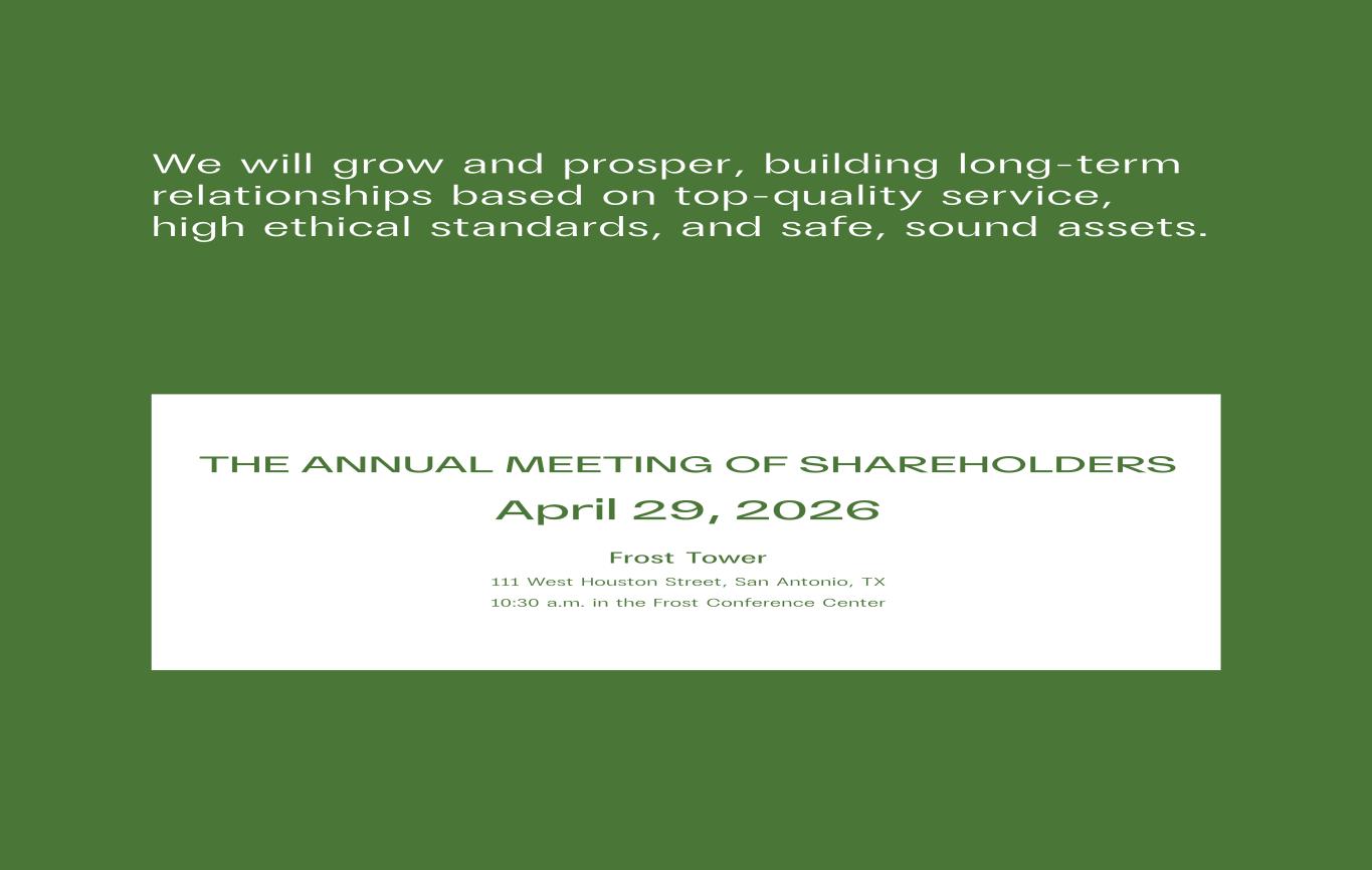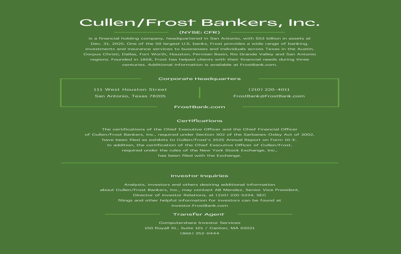We will grow and prosper, building long-term relationships based on top-quality service, high ethical standards, and safe, sound assets. THE ANNUAL MEETING OF SHAREHOLDERS April 29, 2026 Frost Tower 111 West Houston Street, San Antonio, TX 10:30 a.m. in the Frost Conference Center Cullen/Frost Bankers, Inc. Certifications The certifications of the Chief Executive Ocer and the Chief Financial Ocer of Cullen/Frost Bankers, Inc., required under Section 302 of the Sarbanes-Oxley Act of 2002, have been filed as exhibits to Cullen/Frost’s 2025 Annual Report on Form 10-K. In addition, the certification of the Chief Executive Ocer of Cullen/Frost, required under the rules of the New York Stock Exchange, Inc., has been filed with the Exchange. Computershare Investor Services 150 Royall St., Suite 101 / Canton, MA 02021 (866) 252-0444 Analysts, investors and others desiring additional information about Cullen/Frost Bankers, Inc., may contact AB Mendez, Senior Vice President, Director of Investor Relations, at (210) 220-5234. SEC filings and other helpful information for investors can be found at investor.FrostBank.com (NYSE: CFR) is a financial holding company, headquartered in San Antonio, with $53 billion in assets at Dec. 31, 2025. One of the 50 largest U.S. banks, Frost provides a wide range of banking, investments and insurance services to businesses and individuals across Texas in the Austin, Corpus Christi, Dallas, Fort Worth, Houston, Permian Basin, Rio Grande Valley and San Antonio regions. Founded in 1868, Frost has helped clients with their financial needs during three centuries. Additional information is available at FrostBank.com. Corporate Headquarters 111 West Houston Street San Antonio, Texas 78205 (210) 220-4011 FrostBank@FrostBank.com FrostBank.com Investor Inquiries Transfer Agent