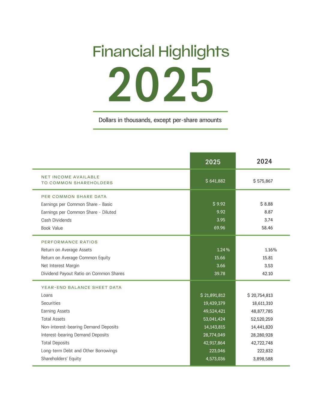 2025 Dollars in thousands, except per-share amounts Financial Highlights 2025 2024 % % NE T INCOME AVAILABLE TO COMMON SHAREHOLDERS PER COMMON SHARE DATA Earnings per Common Share – Basic Earnings per Common Share – Diluted Cash Dividends Book Value PERFORMANCE RATIOS Return on Average Assets Return on Average Common Equity Net Interest Margin Dividend Payout Ratio on Common Shares YEAR-END BALANCE SHEE T DATA Loans Securities Earning Assets Total Assets Non-interest-bearing Demand Deposits Interest-bearing Demand Deposits Total Deposits Long-term Debt and Other Borrowings Shareholders’ Equity $ 641,882 $ 9.92 9.92 3.95 69.96 1.24 15.66 3.66 39.78 $ 21,891,812 19,439,379 49,524,421 53,041,424 14,143,815 28,774,049 42,917,864 223,046 4,573,036 $ 575,867 $ 8.88 8.87 3.74 58.46 1.16 15.81 3.53 42.10 $ 20,754,813 18,611,310 48,877,785 52,520,259 14,441,820 28,280,928 42,722,748 222,832 3,898,588