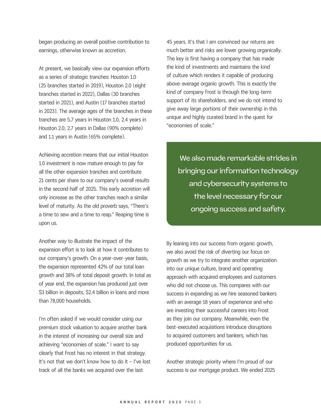 A N N U A L R E P O R T 2 0 2 5 P A G E 3 began producing an overall positive contribution to earnings, otherwise known as accretion. At present, we basically view our expansion efforts as a series of strategic tranches: Houston 1.0 (25 branches started in 2019), Houston 2.0 (eight branches started in 2022), Dallas (30 branches started in 2021), and Austin (17 branches started in 2023). The average ages of the branches in these tranches are 5.7 years in Houston 1.0, 2.4 years in Houston 2.0, 2.7 years in Dallas (90% complete) and 1.1 years in Austin (65% complete). Achieving accretion means that our initial Houston 1.0 investment is now mature enough to pay for all the other expansion tranches and contribute 21 cents per share to our company’s overall results in the second half of 2025. This early accretion will only increase as the other tranches reach a similar level of maturity. As the old proverb says, “There’s a time to sew and a time to reap.” Reaping time is upon us. Another way to illustrate the impact of the expansion effort is to look at how it contributes to our company’s growth. On a year-over-year basis, the expansion represented 42% of our total loan growth and 38% of total deposit growth. In total as of year end, the expansion has produced just over $3 billion in deposits, $2.4 billion in loans and more than 78,000 households. I’m often asked if we would consider using our premium stock valuation to acquire another bank in the interest of increasing our overall size and achieving “economies of scale.” I want to say clearly that Frost has no interest in that strategy. It’s not that we don’t know how to do it — I’ve lost track of all the banks we acquired over the last 45 years. It’s that I am convinced our returns are much better and risks are lower growing organically. The key is first having a company that has made the kind of investments and maintains the kind of culture which renders it capable of producing above-average organic growth. This is exactly the kind of company Frost is through the long-term support of its shareholders, and we do not intend to give away large portions of their ownership in this unique and highly curated brand in the quest for “economies of scale.” By leaning into our success from organic growth, we also avoid the risk of diverting our focus on growth as we try to integrate another organization into our unique culture, brand and operating approach with acquired employees and customers who did not choose us. This compares with our success in expanding as we hire seasoned bankers with an average 18 years of experience and who are investing their successful careers into Frost as they join our company. Meanwhile, even the best-executed acquisitions introduce disruptions to acquired customers and bankers, which has produced opportunities for us. Another strategic priority where I’m proud of our success is our mortgage product. We ended 2025 We also made remarkable strides in bringing our information technology and cybersecurity systems to the level necessary for our ongoing success and safety.