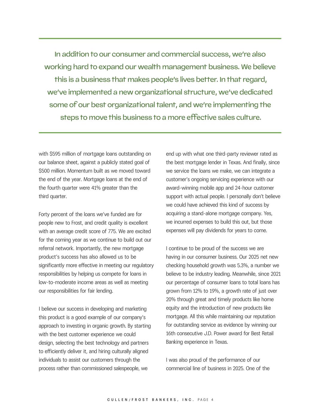 C U L L E N / F R O S T B A N K E R S , I N C . P A G E 4 with $595 million of mortgage loans outstanding on our balance sheet, against a publicly stated goal of $500 million. Momentum built as we moved toward the end of the year. Mortgage loans at the end of the fourth quarter were 41% greater than the third quarter. Forty percent of the loans we’ve funded are for people new to Frost, and credit quality is excellent with an average credit score of 775. We are excited for the coming year as we continue to build out our referral network. Importantly, the new mortgage product’s success has also allowed us to be significantly more effective in meeting our regulatory responsibilities by helping us compete for loans in low-to-moderate income areas as well as meeting our responsibilities for fair lending. I believe our success in developing and marketing this product is a good example of our company’s approach to investing in organic growth. By starting with the best customer experience we could design, selecting the best technology and partners to efficiently deliver it, and hiring culturally aligned individuals to assist our customers through the process rather than commissioned salespeople, we end up with what one third-party reviewer rated as the best mortgage lender in Texas. And finally, since we service the loans we make, we can integrate a customer’s ongoing servicing experience with our award-winning mobile app and 24-hour customer support with actual people. I personally don’t believe we could have achieved this kind of success by acquiring a stand-alone mortgage company. Yes, we incurred expenses to build this out, but those expenses will pay dividends for years to come. I continue to be proud of the success we are having in our consumer business. Our 2025 net new checking household growth was 5.3%, a number we believe to be industry leading. Meanwhile, since 2021 our percentage of consumer loans to total loans has grown from 12% to 19%, a growth rate of just over 20% through great and timely products like home equity and the introduction of new products like mortgage. All this while maintaining our reputation for outstanding service as evidence by winning our 16th consecutive J.D. Power award for Best Retail Banking experience in Texas. I was also proud of the performance of our commercial line of business in 2025. One of the In addition to our consumer and commercial success, we’re also working hard to expand our wealth management business. We believe this is a business that makes people’s lives better. In that regard, we’ve implemented a new organizational structure, we’ve dedicated some of our best organizational talent, and we’re implementing the steps to move this business to a more effective sales culture.