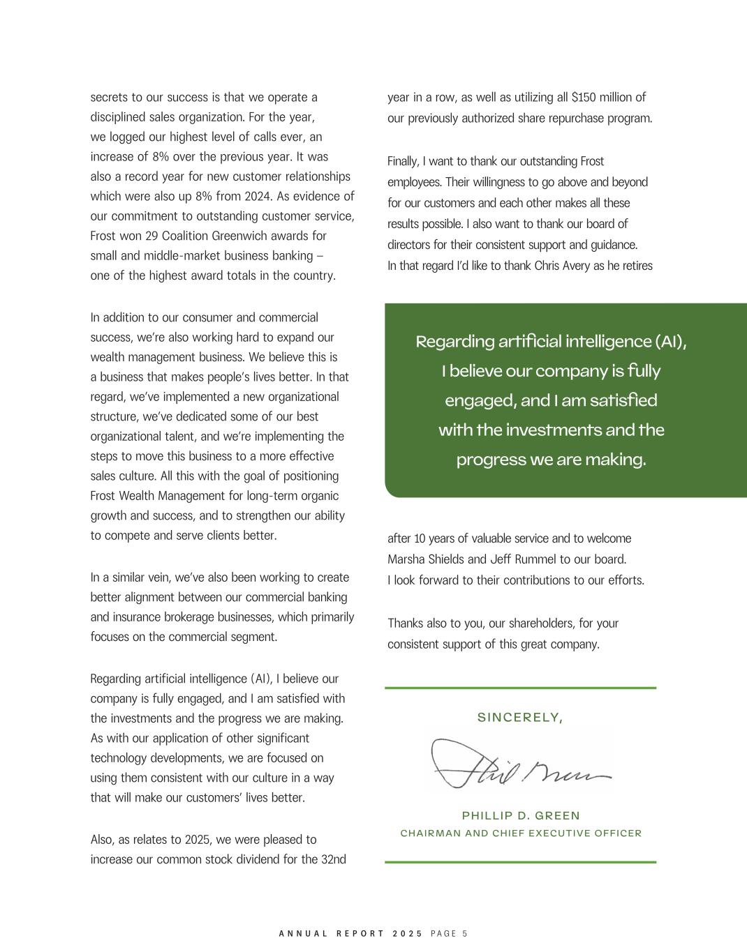 A N N U A L R E P O R T 2 0 2 5 P A G E 5 secrets to our success is that we operate a disciplined sales organization. For the year, we logged our highest level of calls ever, an increase of 8% over the previous year. It was also a record year for new customer relationships which were also up 8% from 2024. As evidence of our commitment to outstanding customer service, Frost won 29 Coalition Greenwich awards for small and middle-market business banking — one of the highest award totals in the country. In addition to our consumer and commercial success, we’re also working hard to expand our wealth management business. We believe this is a business that makes people’s lives better. In that regard, we’ve implemented a new organizational structure, we’ve dedicated some of our best organizational talent, and we’re implementing the steps to move this business to a more effective sales culture. All this with the goal of positioning Frost Wealth Management for long-term organic growth and success, and to strengthen our ability to compete and serve clients better. In a similar vein, we’ve also been working to create better alignment between our commercial banking and insurance brokerage businesses, which primarily focuses on the commercial segment. Regarding artificial intelligence (AI), I believe our company is fully engaged, and I am satisfied with the investments and the progress we are making. As with our application of other significant technology developments, we are focused on using them consistent with our culture in a way that will make our customers’ lives better. Also, as relates to 2025, we were pleased to increase our common stock dividend for the 32nd year in a row, as well as utilizing all $150 million of our previously authorized share repurchase program. Finally, I want to thank our outstanding Frost employees. Their willingness to go above and beyond for our customers and each other makes all these results possible. I also want to thank our board of directors for their consistent support and guidance. In that regard I’d like to thank Chris Avery as he retires after 10 years of valuable service and to welcome Marsha Shields and Jeff Rummel to our board. I look forward to their contributions to our efforts. Thanks also to you, our shareholders, for your consistent support of this great company. SINCERELY, PHILL IP D. GREEN CHAIRMAN AND CHIEF EXECUTIVE OFFICER Regarding artificial intelligence (AI), I believe our company is fully engaged, and I am satisfied with the investments and the progress we are making.