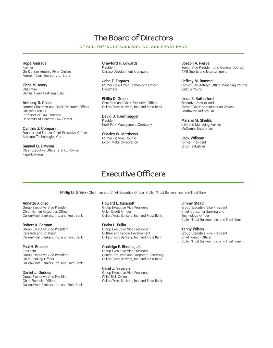 Hope Andrade Partner Go Rio San Antonio River Cruises Former Texas Secretary of State Chris M. Avery Chairman James Avery Craftsman, Inc. Anthony R. Chase Former Chairman and Chief Executive Officer ChaseSource L.P. Professor of Law Emeritus University of Houston Law Center Cynthia J. Comparin Founder and Former Chief Executive Officer Animato Technologies Corp. Samuel G. Dawson Chief Executive Officer and Co-Owner Pape-Dawson Crawford H. Edwards President Cassco Development Company John T. Engates Former Field Chief Technology Officer Cloudflare Phillip D. Green Chairman and Chief Executive Officer Cullen/Frost Bankers, Inc. and Frost Bank David J. Haemisegger President NorthPark Management Company Charles W. Matthews Former General Counsel Exxon Mobil Corporation Joseph A. Pierce Senior Vice President and General Counsel AMB Sports and Entertainment Jeffrey M. Rummel Former San Antonio Office Managing Partner Ernst & Young Linda B. Rutherford Executive Advisor and Former Chief Administration Officer Southwest Airlines Co Marsha M. Shields CEO and Managing Partner McCombs Enterprises Jack Willome Former President Ellison Industries Annette Alonzo Group Executive Vice President Chief Human Resources Officer Cullen/Frost Bankers, Inc. and Frost Bank Robert A. Berman Group Executive Vice President Research and Strategy Cullen/Frost Bankers, Inc. and Frost Bank Paul H. Bracher President Group Executive Vice President Chief Banking Officer Cullen/Frost Bankers, Inc. and Frost Bank Daniel J. Geddes Group Executive Vice President Chief Financial Officer Cullen/Frost Bankers, Inc. and Frost Bank Howard L. Kasanoff Group Executive Vice President Chief Credit Officer Cullen/Frost Bankers, Inc. and Frost Bank Ericka L. Pullin Group Executive Vice President Culture and People Development Cullen/Frost Bankers, Inc. and Frost Bank Coolidge E. Rhodes, Jr. Group Executive Vice President General Counsel and Corporate Secretary Cullen/Frost Bankers, Inc. and Frost Bank Carol J. Severyn Group Executive Vice President Chief Risk Officer Cullen/Frost Bankers, Inc. and Frost Bank Jimmy Stead Group Executive Vice President Chief Consumer Banking and Technology Officer Cullen/Frost Bankers, Inc. and Frost Bank Kenny Wilson Group Executive Vice President Chief Wealth Officer Cullen/Frost Bankers, Inc. and Frost Bank Phillip D. Green • Chairman and Chief Executive Officer, Cullen/Frost Bankers, Inc. and Frost Bank Executive Officers The Board of Directors OF CULLEN/FROST BANKERS, INC. AND FROST BANK