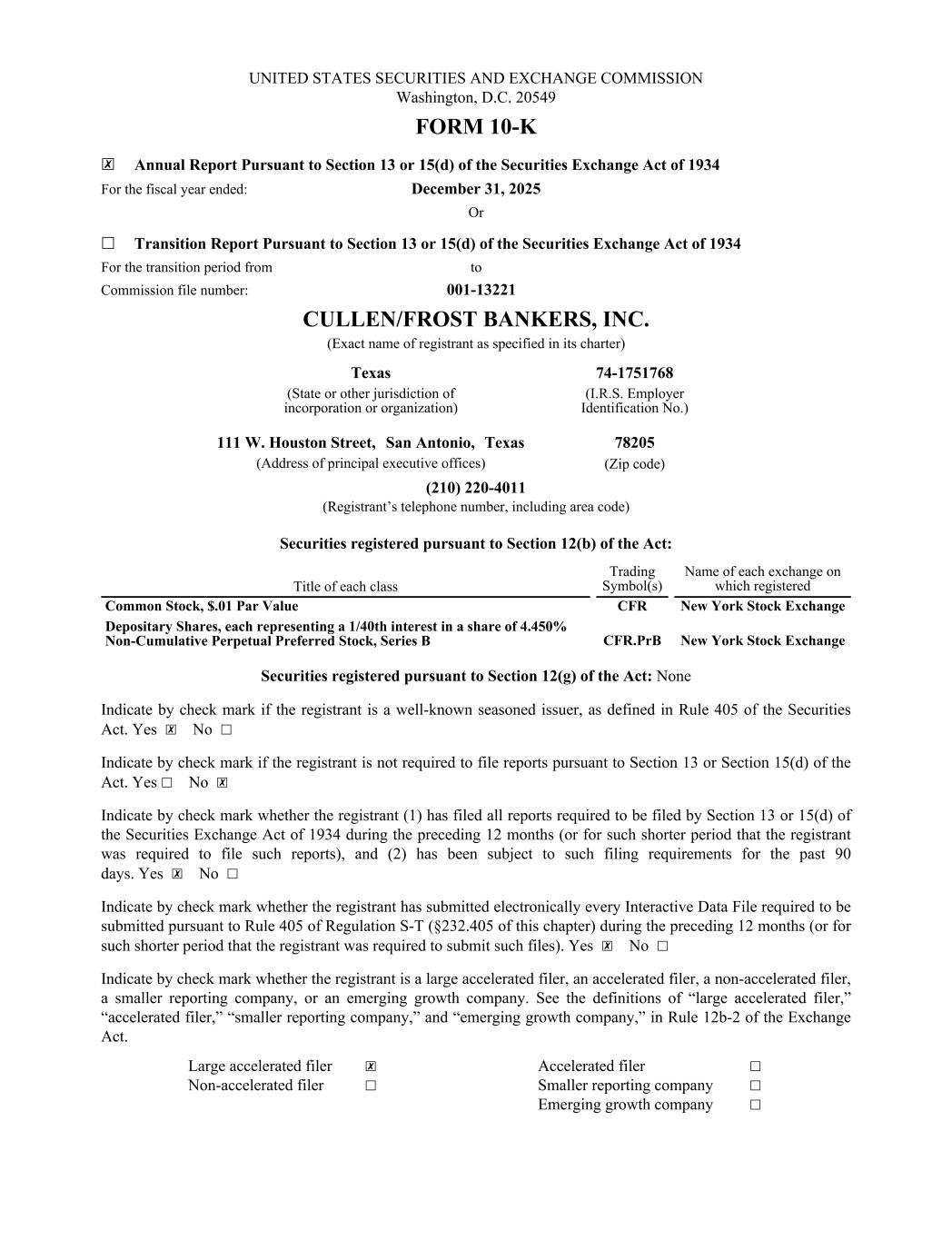 UNITED STATES SECURITIES AND EXCHANGE COMMISSION Washington, D.C. 20549 FORM 10-K ☒ Annual Report Pursuant to Section 13 or 15(d) of the Securities Exchange Act of 1934 For the fiscal year ended: December 31, 2025 Or ☐ Transition Report Pursuant to Section 13 or 15(d) of the Securities Exchange Act of 1934 For the transition period from to Commission file number: 001-13221 CULLEN/FROST BANKERS, INC. (Exact name of registrant as specified in its charter) Texas 74-1751768 (State or other jurisdiction of incorporation or organization) (I.R.S. Employer Identification No.) 111 W. Houston Street, San Antonio, Texas 78205 (Address of principal executive offices) (Zip code) (210) 220-4011 (Registrant’s telephone number, including area code) Securities registered pursuant to Section 12(b) of the Act: Title of each class Trading Symbol(s) Name of each exchange on which registered Common Stock, $.01 Par Value CFR New York Stock Exchange Depositary Shares, each representing a 1/40th interest in a share of 4.450% Non-Cumulative Perpetual Preferred Stock, Series B CFR.PrB New York Stock Exchange Securities registered pursuant to Section 12(g) of the Act: None Indicate by check mark if the registrant is a well-known seasoned issuer, as defined in Rule 405 of the Securities Act. Yes ☒ No ☐ Indicate by check mark if the registrant is not required to file reports pursuant to Section 13 or Section 15(d) of the Act. Yes ☐ No ☒ Indicate by check mark whether the registrant (1) has filed all reports required to be filed by Section 13 or 15(d) of the Securities Exchange Act of 1934 during the preceding 12 months (or for such shorter period that the registrant was required to file such reports), and (2) has been subject to such filing requirements for the past 90 days. Yes ☒ No ☐ Indicate by check mark whether the registrant has submitted electronically every Interactive Data File required to be submitted pursuant to Rule 405 of Regulation S-T (§232.405 of this chapter) during the preceding 12 months (or for such shorter period that the registrant was required to submit such files). Yes ☒ No ☐ Indicate by check mark whether the registrant is a large accelerated filer, an accelerated filer, a non-accelerated filer, a smaller reporting company, or an emerging growth company. See the definitions of “large accelerated filer,” “accelerated filer,” “smaller reporting company,” and “emerging growth company,” in Rule 12b-2 of the Exchange Act. Large accelerated filer ☒ Accelerated filer ☐ Non-accelerated filer ☐ Smaller reporting company ☐ Emerging growth company ☐