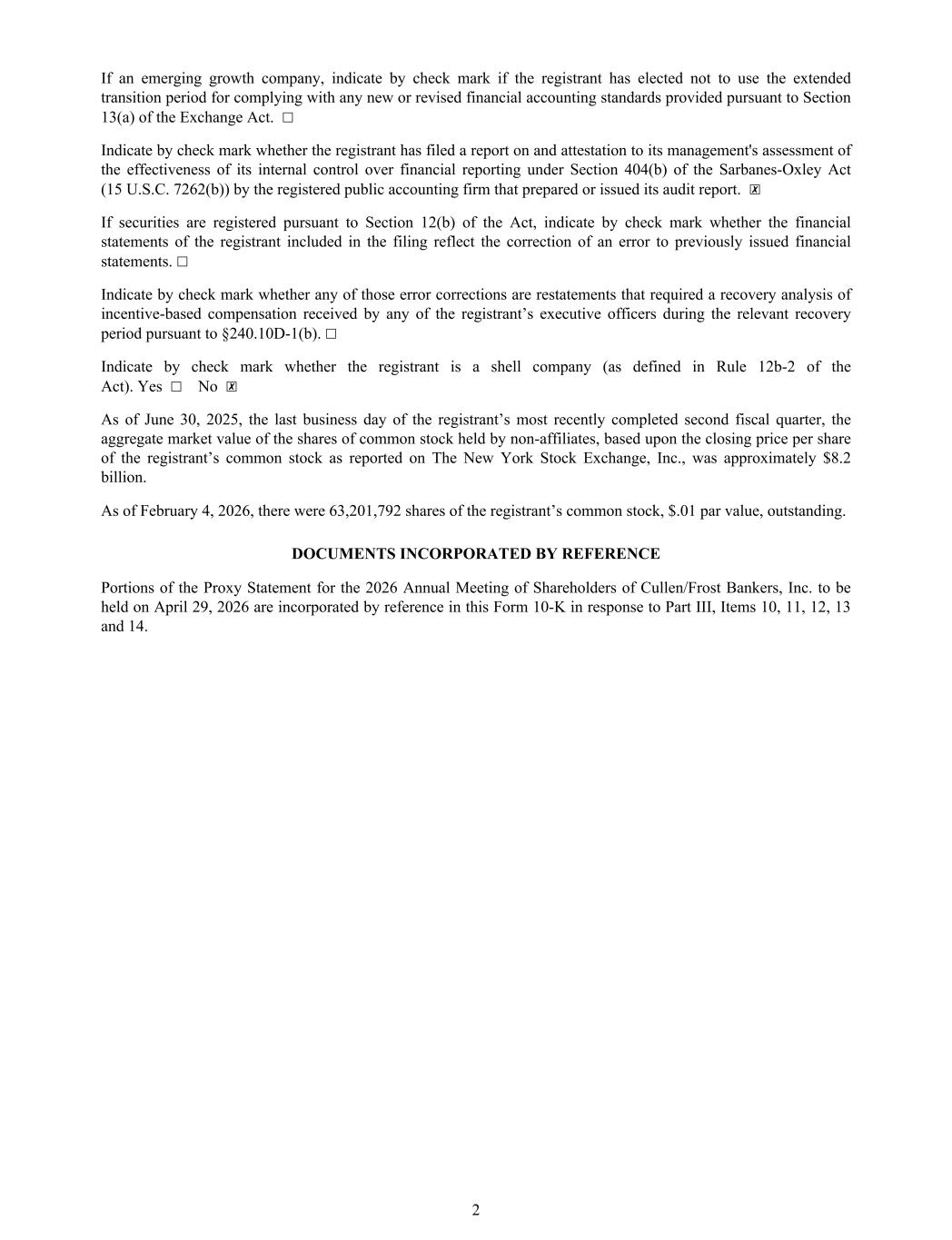 If an emerging growth company, indicate by check mark if the registrant has elected not to use the extended transition period for complying with any new or revised financial accounting standards provided pursuant to Section 13(a) of the Exchange Act. ☐ Indicate by check mark whether the registrant has filed a report on and attestation to its management's assessment of the effectiveness of its internal control over financial reporting under Section 404(b) of the Sarbanes-Oxley Act (15 U.S.C. 7262(b)) by the registered public accounting firm that prepared or issued its audit report. ☒ If securities are registered pursuant to Section 12(b) of the Act, indicate by check mark whether the financial statements of the registrant included in the filing reflect the correction of an error to previously issued financial statements. ☐ Indicate by check mark whether any of those error corrections are restatements that required a recovery analysis of incentive-based compensation received by any of the registrant’s executive officers during the relevant recovery period pursuant to §240.10D-1(b). ☐ Indicate by check mark whether the registrant is a shell company (as defined in Rule 12b-2 of the Act). Yes ☐ No ☒ As of June 30, 2025, the last business day of the registrant’s most recently completed second fiscal quarter, the aggregate market value of the shares of common stock held by non-affiliates, based upon the closing price per share of the registrant’s common stock as reported on The New York Stock Exchange, Inc., was approximately $8.2 billion. As of February 4, 2026, there were 63,201,792 shares of the registrant’s common stock, $.01 par value, outstanding. DOCUMENTS INCORPORATED BY REFERENCE Portions of the Proxy Statement for the 2026 Annual Meeting of Shareholders of Cullen/Frost Bankers, Inc. to be held on April 29, 2026 are incorporated by reference in this Form 10-K in response to Part III, Items 10, 11, 12, 13 and 14. 2