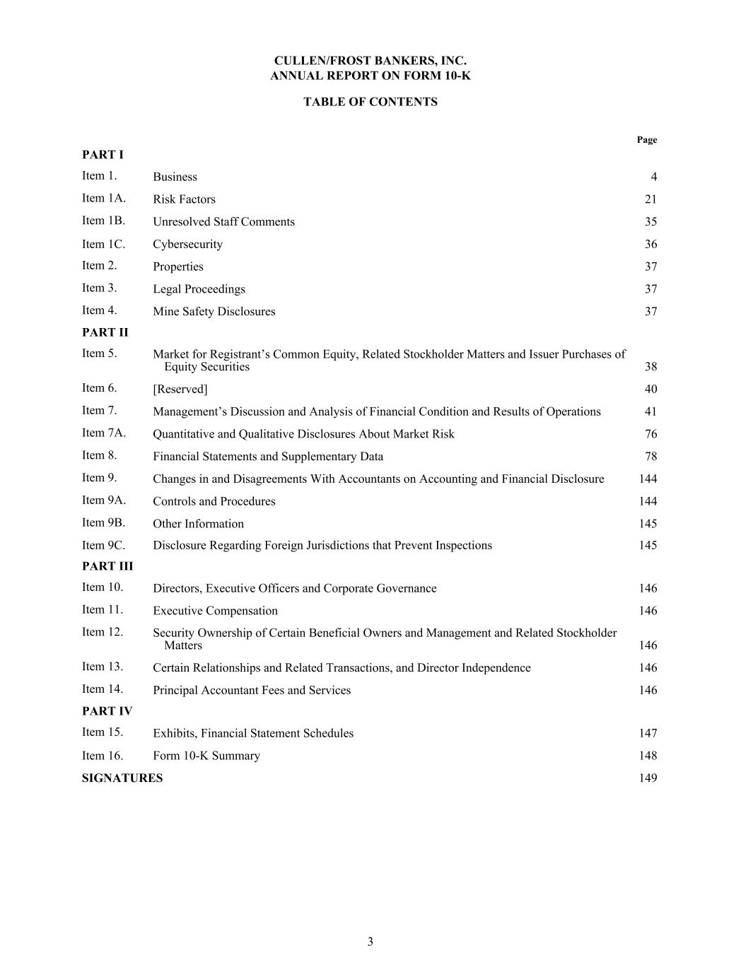 CULLEN/FROST BANKERS, INC. ANNUAL REPORT ON FORM 10-K TABLE OF CONTENTS Page PART I Item 1. Business 4 Item 1A. Risk Factors 21 Item 1B. Unresolved Staff Comments 35 Item 1C. Cybersecurity 36 Item 2. Properties 37 Item 3. Legal Proceedings 37 Item 4. Mine Safety Disclosures 37 PART II Item 5. Market for Registrant’s Common Equity, Related Stockholder Matters and Issuer Purchases of Equity Securities 38 Item 6. [Reserved] 40 Item 7. Management’s Discussion and Analysis of Financial Condition and Results of Operations 41 Item 7A. Quantitative and Qualitative Disclosures About Market Risk 76 Item 8. Financial Statements and Supplementary Data 78 Item 9. Changes in and Disagreements With Accountants on Accounting and Financial Disclosure 144 Item 9A. Controls and Procedures 144 Item 9B. Other Information 145 Item 9C. Disclosure Regarding Foreign Jurisdictions that Prevent Inspections 145 PART III Item 10. Directors, Executive Officers and Corporate Governance 146 Item 11. Executive Compensation 146 Item 12. Security Ownership of Certain Beneficial Owners and Management and Related Stockholder Matters 146 Item 13. Certain Relationships and Related Transactions, and Director Independence 146 Item 14. Principal Accountant Fees and Services 146 PART IV Item 15. Exhibits, Financial Statement Schedules 147 Item 16. Form 10-K Summary 148 SIGNATURES 149 3