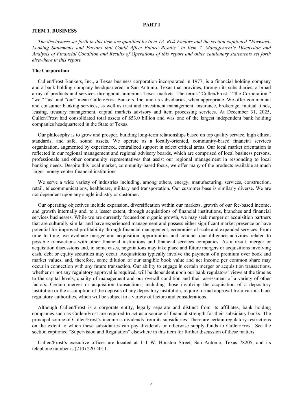 PART I ITEM 1. BUSINESS The disclosures set forth in this item are qualified by Item 1A. Risk Factors and the section captioned “Forward- Looking Statements and Factors that Could Affect Future Results” in Item 7. Management’s Discussion and Analysis of Financial Condition and Results of Operations of this report and other cautionary statements set forth elsewhere in this report. The Corporation Cullen/Frost Bankers, Inc., a Texas business corporation incorporated in 1977, is a financial holding company and a bank holding company headquartered in San Antonio, Texas that provides, through its subsidiaries, a broad array of products and services throughout numerous Texas markets. The terms “Cullen/Frost,” “the Corporation,” “we,” “us” and “our” mean Cullen/Frost Bankers, Inc. and its subsidiaries, when appropriate. We offer commercial and consumer banking services, as well as trust and investment management, insurance, brokerage, mutual funds, leasing, treasury management, capital markets advisory and item processing services. At December 31, 2025, Cullen/Frost had consolidated total assets of $53.0 billion and was one of the largest independent bank holding companies headquartered in the State of Texas. Our philosophy is to grow and prosper, building long-term relationships based on top quality service, high ethical standards, and safe, sound assets. We operate as a locally-oriented, community-based financial services organization, augmented by experienced, centralized support in select critical areas. Our local market orientation is reflected in our regional management and regional advisory boards, which are comprised of local business persons, professionals and other community representatives that assist our regional management in responding to local banking needs. Despite this local market, community-based focus, we offer many of the products available at much larger money-center financial institutions. We serve a wide variety of industries including, among others, energy, manufacturing, services, construction, retail, telecommunications, healthcare, military and transportation. Our customer base is similarly diverse. We are not dependent upon any single industry or customer. Our operating objectives include expansion, diversification within our markets, growth of our fee-based income, and growth internally and, to a lesser extent, through acquisitions of financial institutions, branches and financial services businesses. While we are currently focused on organic growth, we may seek merger or acquisition partners that are culturally similar and have experienced management and possess either significant market presence or have potential for improved profitability through financial management, economies of scale and expanded services. From time to time, we evaluate merger and acquisition opportunities and conduct due diligence activities related to possible transactions with other financial institutions and financial services companies. As a result, merger or acquisition discussions and, in some cases, negotiations may take place and future mergers or acquisitions involving cash, debt or equity securities may occur. Acquisitions typically involve the payment of a premium over book and market values, and, therefore, some dilution of our tangible book value and net income per common share may occur in connection with any future transaction. Our ability to engage in certain merger or acquisition transactions, whether or not any regulatory approval is required, will be dependent upon our bank regulators’ views at the time as to the capital levels, quality of management and our overall condition and their assessment of a variety of other factors. Certain merger or acquisition transactions, including those involving the acquisition of a depository institution or the assumption of the deposits of any depository institution, require formal approval from various bank regulatory authorities, which will be subject to a variety of factors and considerations. Although Cullen/Frost is a corporate entity, legally separate and distinct from its affiliates, bank holding companies such as Cullen/Frost are required to act as a source of financial strength for their subsidiary banks. The principal source of Cullen/Frost’s income is dividends from its subsidiaries. There are certain regulatory restrictions on the extent to which these subsidiaries can pay dividends or otherwise supply funds to Cullen/Frost. See the section captioned “Supervision and Regulation” elsewhere in this item for further discussion of these matters. Cullen/Frost’s executive offices are located at 111 W. Houston Street, San Antonio, Texas 78205, and its telephone number is (210) 220-4011. 4