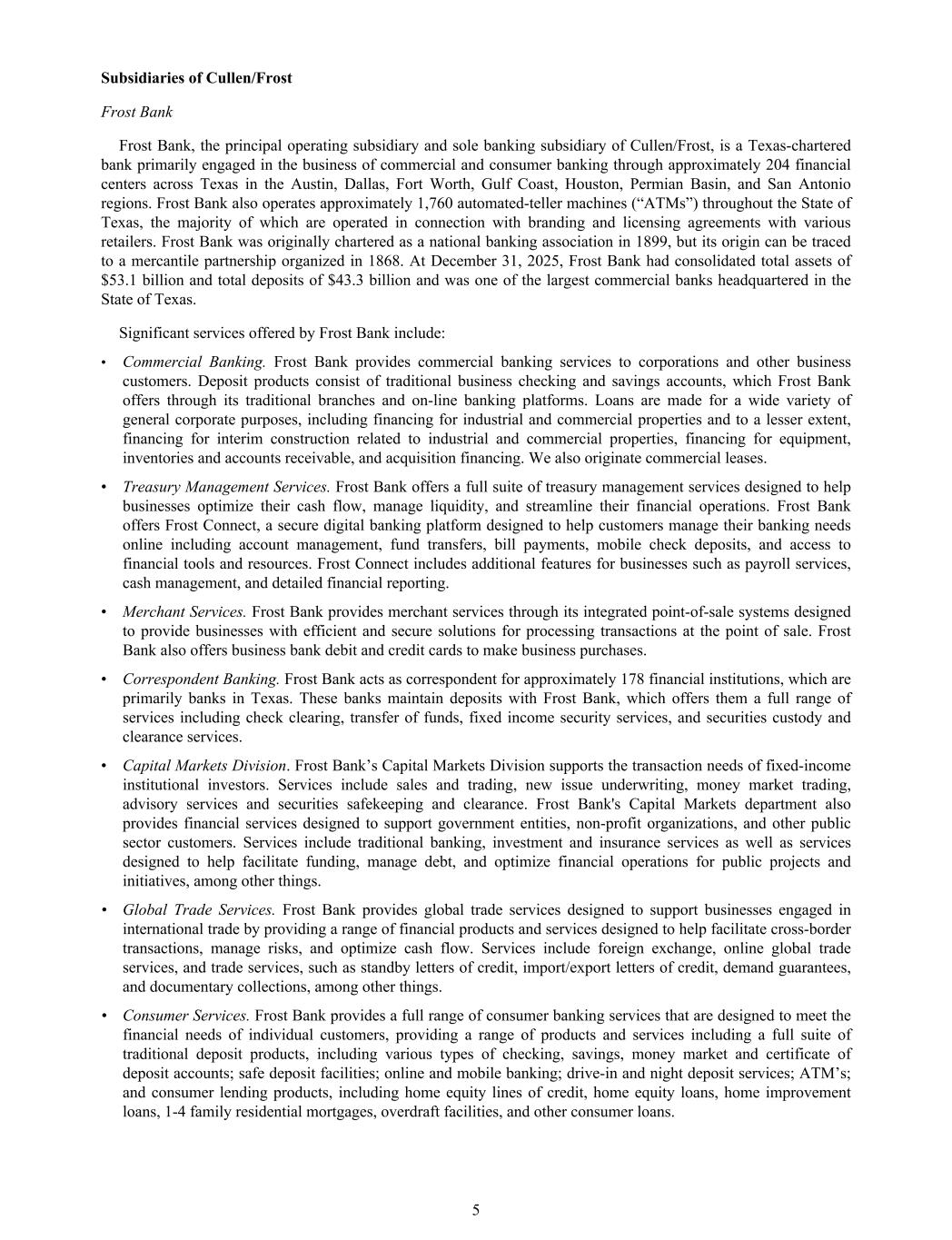 • International Banking. Frost Bank provides international banking services to customers residing in or dealing with businesses located in Mexico. These services consist of accepting deposits (only payable in the U.S. in U.S. dollars), making loans (generally only in U.S. dollars), issuing letters of credit, handling foreign collections, transmitting funds, and to a limited extent, dealing in foreign exchange. • Trust Services. Frost Bank provides a wide range of trust, investment, agency and custodial services for individual and corporate customers. These services include the administration of estates and personal trusts, as well as the management of investment accounts for individuals, employee benefit plans and charitable foundations. At December 31, 2025, the estimated fair value of trust assets was $51.0 billion, including managed assets of $26.7 billion and custody assets of $24.3 billion. Frost Insurance Agency, Inc. Frost Insurance Agency (“FIA”) is a wholly owned subsidiary of Frost Bank. FIA provides a broad range of insurance products and services to both business and consumer customers. Products and services include property and casualty insurance and employee benefits plans for businesses, among other things. FIA also arranges for life, disability, long-term care, property and real estate, automobile, and valuables insurance for individuals. Frost Brokerage Services, Inc. Frost Brokerage Services, Inc. (“FBS”) is a wholly owned subsidiary of Frost Bank that provides brokerage services and performs other transactions or operations related to the sale and purchase of securities of all types. FBS is registered as a fully disclosed introducing broker-dealer under the Securities Exchange Act of 1934 and, as such, does not hold any customer accounts or maintain custody of customer assets. Frost Investment Advisors, LLC Frost Investment Advisors, LLC is a registered investment advisor and a wholly owned subsidiary of Frost Bank that provides investment management services to Frost-managed mutual funds, institutions and individuals. Frost Investment Services, LLC Frost Investment Services, LLC is a registered investment advisor and a wholly owned subsidiary of Frost Bank that provides investment management services to individuals. Tri–Frost Corporation Tri-Frost Corporation is a wholly owned subsidiary of Frost Bank that primarily holds securities and receives cash flows related to principal and interest on the securities until such time that the securities mature. Cullen/Frost Capital Trust II Cullen/Frost Capital Trust II (“Trust II”) is a Delaware statutory business trust formed in 2004 for the purpose of issuing $120.0 million in trust preferred securities and lending the proceeds to Cullen/Frost. Cullen/Frost guarantees, on a limited basis, payments of distributions on the trust preferred securities and payments on redemption of the trust preferred securities. Trust II is a variable interest entity for which we are not the primary beneficiary. As such, the accounts of Trust II are not included in our consolidated financial statements. See our accounting policy related to consolidation in Note 1 - Summary of Significant Accounting Policies in the notes to consolidated financial statements included in Item 8. Financial Statements and Supplementary Data elsewhere in this report. Although the accounts of Trust II are not included in our consolidated financial statements, the $120.0 million in trust preferred securities issued by Trust II are included in the regulatory capital of Cullen/Frost during the reported periods. See the section captioned “Supervision and Regulation - Capital Requirements” for a discussion of the regulatory capital treatment of our trust preferred securities. Other Subsidiaries Cullen/Frost has various other subsidiaries that are not significant to the consolidated entity. 6