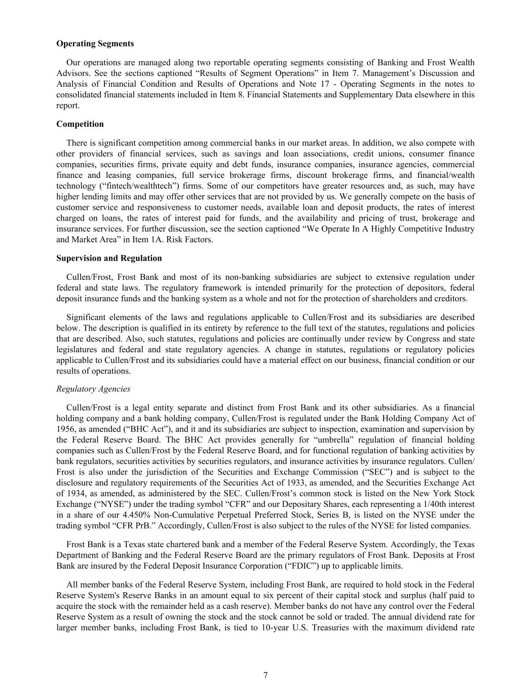 Operating Segments Our operations are managed along two reportable operating segments consisting of Banking and Frost Wealth Advisors. See the sections captioned “Results of Segment Operations” in Item 7. Management’s Discussion and Analysis of Financial Condition and Results of Operations and Note 17 - Operating Segments in the notes to consolidated financial statements included in Item 8. Financial Statements and Supplementary Data elsewhere in this report. Competition There is significant competition among commercial banks in our market areas. In addition, we also compete with other providers of financial services, such as savings and loan associations, credit unions, consumer finance companies, securities firms, private equity and debt funds, insurance companies, insurance agencies, commercial finance and leasing companies, full service brokerage firms, discount brokerage firms, and financial/wealth technology (“fintech/wealthtech”) firms. Some of our competitors have greater resources and, as such, may have higher lending limits and may offer other services that are not provided by us. We generally compete on the basis of customer service and responsiveness to customer needs, available loan and deposit products, the rates of interest charged on loans, the rates of interest paid for funds, and the availability and pricing of trust, brokerage and insurance services. For further discussion, see the section captioned “We Operate In A Highly Competitive Industry and Market Area” in Item 1A. Risk Factors. Supervision and Regulation Cullen/Frost, Frost Bank and most of its non-banking subsidiaries are subject to extensive regulation under federal and state laws. The regulatory framework is intended primarily for the protection of depositors, federal deposit insurance funds and the banking system as a whole and not for the protection of shareholders and creditors. Significant elements of the laws and regulations applicable to Cullen/Frost and its subsidiaries are described below. The description is qualified in its entirety by reference to the full text of the statutes, regulations and policies that are described. Also, such statutes, regulations and policies are continually under review by Congress and state legislatures and federal and state regulatory agencies. A change in statutes, regulations or regulatory policies applicable to Cullen/Frost and its subsidiaries could have a material effect on our business, financial condition or our results of operations. Regulatory Agencies Cullen/Frost is a legal entity separate and distinct from Frost Bank and its other subsidiaries. As a financial holding company and a bank holding company, Cullen/Frost is regulated under the Bank Holding Company Act of 1956, as amended (“BHC Act”), and it and its subsidiaries are subject to inspection, examination and supervision by the Federal Reserve Board. The BHC Act provides generally for “umbrella” regulation of financial holding companies such as Cullen/Frost by the Federal Reserve Board, and for functional regulation of banking activities by bank regulators, securities activities by securities regulators, and insurance activities by insurance regulators. Cullen/ Frost is also under the jurisdiction of the Securities and Exchange Commission (“SEC”) and is subject to the disclosure and regulatory requirements of the Securities Act of 1933, as amended, and the Securities Exchange Act of 1934, as amended, as administered by the SEC. Cullen/Frost’s common stock is listed on the New York Stock Exchange (“NYSE”) under the trading symbol “CFR” and our Depositary Shares, each representing a 1/40th interest in a share of our 4.450% Non-Cumulative Perpetual Preferred Stock, Series B, is listed on the NYSE under the trading symbol “CFR PrB.” Accordingly, Cullen/Frost is also subject to the rules of the NYSE for listed companies. Frost Bank is a Texas state chartered bank and a member of the Federal Reserve System. Accordingly, the Texas Department of Banking and the Federal Reserve Board are the primary regulators of Frost Bank. Deposits at Frost Bank are insured by the Federal Deposit Insurance Corporation (“FDIC”) up to applicable limits. All member banks of the Federal Reserve System, including Frost Bank, are required to hold stock in the Federal Reserve System's Reserve Banks in an amount equal to six percent of their capital stock and surplus (half paid to acquire the stock with the remainder held as a cash reserve). Member banks do not have any control over the Federal Reserve System as a result of owning the stock and the stock cannot be sold or traded. The annual dividend rate for larger member banks, including Frost Bank, is tied to 10-year U.S. Treasuries with the maximum dividend rate 7