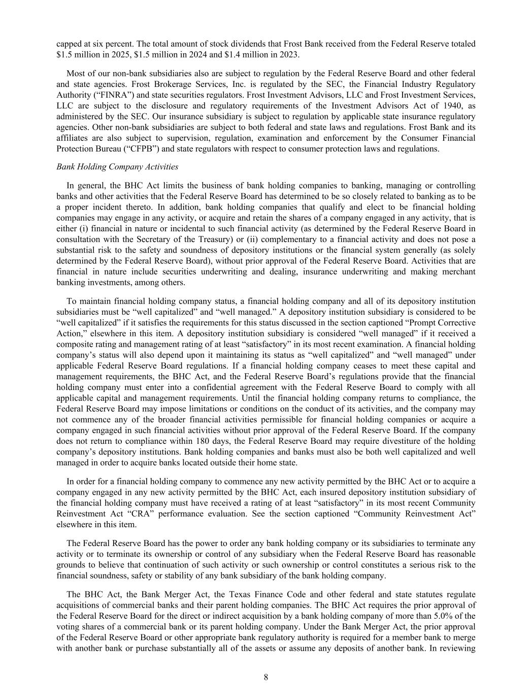 capped at six percent. The total amount of stock dividends that Frost Bank received from the Federal Reserve totaled $1.5 million in 2025, $1.5 million in 2024 and $1.4 million in 2023. Most of our non-bank subsidiaries also are subject to regulation by the Federal Reserve Board and other federal and state agencies. Frost Brokerage Services, Inc. is regulated by the SEC, the Financial Industry Regulatory Authority (“FINRA”) and state securities regulators. Frost Investment Advisors, LLC and Frost Investment Services, LLC are subject to the disclosure and regulatory requirements of the Investment Advisors Act of 1940, as administered by the SEC. Our insurance subsidiary is subject to regulation by applicable state insurance regulatory agencies. Other non-bank subsidiaries are subject to both federal and state laws and regulations. Frost Bank and its affiliates are also subject to supervision, regulation, examination and enforcement by the Consumer Financial Protection Bureau (“CFPB”) and state regulators with respect to consumer protection laws and regulations. Bank Holding Company Activities In general, the BHC Act limits the business of bank holding companies to banking, managing or controlling banks and other activities that the Federal Reserve Board has determined to be so closely related to banking as to be a proper incident thereto. In addition, bank holding companies that qualify and elect to be financial holding companies may engage in any activity, or acquire and retain the shares of a company engaged in any activity, that is either (i) financial in nature or incidental to such financial activity (as determined by the Federal Reserve Board in consultation with the Secretary of the Treasury) or (ii) complementary to a financial activity and does not pose a substantial risk to the safety and soundness of depository institutions or the financial system generally (as solely determined by the Federal Reserve Board), without prior approval of the Federal Reserve Board. Activities that are financial in nature include securities underwriting and dealing, insurance underwriting and making merchant banking investments, among others. To maintain financial holding company status, a financial holding company and all of its depository institution subsidiaries must be “well capitalized” and “well managed.” A depository institution subsidiary is considered to be “well capitalized” if it satisfies the requirements for this status discussed in the section captioned “Prompt Corrective Action,” elsewhere in this item. A depository institution subsidiary is considered “well managed” if it received a composite rating and management rating of at least “satisfactory” in its most recent examination. A financial holding company’s status will also depend upon it maintaining its status as “well capitalized” and “well managed” under applicable Federal Reserve Board regulations. If a financial holding company ceases to meet these capital and management requirements, the BHC Act, and the Federal Reserve Board’s regulations provide that the financial holding company must enter into a confidential agreement with the Federal Reserve Board to comply with all applicable capital and management requirements. Until the financial holding company returns to compliance, the Federal Reserve Board may impose limitations or conditions on the conduct of its activities, and the company may not commence any of the broader financial activities permissible for financial holding companies or acquire a company engaged in such financial activities without prior approval of the Federal Reserve Board. If the company does not return to compliance within 180 days, the Federal Reserve Board may require divestiture of the holding company’s depository institutions. Bank holding companies and banks must also be both well capitalized and well managed in order to acquire banks located outside their home state. In order for a financial holding company to commence any new activity permitted by the BHC Act or to acquire a company engaged in any new activity permitted by the BHC Act, each insured depository institution subsidiary of the financial holding company must have received a rating of at least “satisfactory” in its most recent Community Reinvestment Act “CRA” performance evaluation. See the section captioned “Community Reinvestment Act” elsewhere in this item. The Federal Reserve Board has the power to order any bank holding company or its subsidiaries to terminate any activity or to terminate its ownership or control of any subsidiary when the Federal Reserve Board has reasonable grounds to believe that continuation of such activity or such ownership or control constitutes a serious risk to the financial soundness, safety or stability of any bank subsidiary of the bank holding company. The BHC Act, the Bank Merger Act, the Texas Finance Code and other federal and state statutes regulate acquisitions of commercial banks and their parent holding companies. The BHC Act requires the prior approval of the Federal Reserve Board for the direct or indirect acquisition by a bank holding company of more than 5.0% of the voting shares of a commercial bank or its parent holding company. Under the Bank Merger Act, the prior approval of the Federal Reserve Board or other appropriate bank regulatory authority is required for a member bank to merge with another bank or purchase substantially all of the assets or assume any deposits of another bank. In reviewing 8