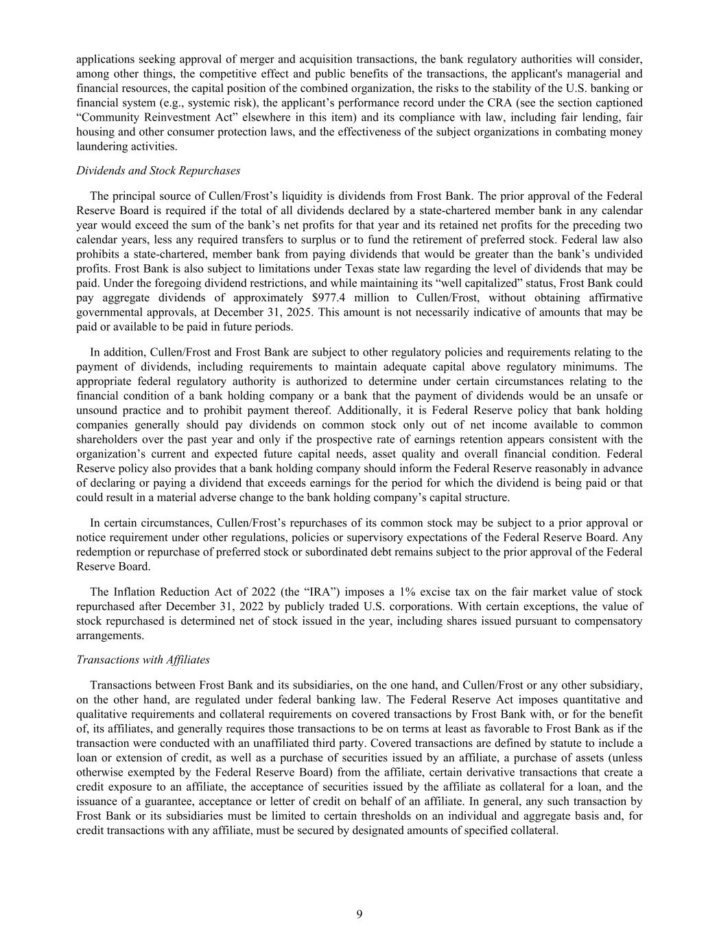 applications seeking approval of merger and acquisition transactions, the bank regulatory authorities will consider, among other things, the competitive effect and public benefits of the transactions, the applicant's managerial and financial resources, the capital position of the combined organization, the risks to the stability of the U.S. banking or financial system (e.g., systemic risk), the applicant’s performance record under the CRA (see the section captioned “Community Reinvestment Act” elsewhere in this item) and its compliance with law, including fair lending, fair housing and other consumer protection laws, and the effectiveness of the subject organizations in combating money laundering activities. Dividends and Stock Repurchases The principal source of Cullen/Frost’s liquidity is dividends from Frost Bank. The prior approval of the Federal Reserve Board is required if the total of all dividends declared by a state-chartered member bank in any calendar year would exceed the sum of the bank’s net profits for that year and its retained net profits for the preceding two calendar years, less any required transfers to surplus or to fund the retirement of preferred stock. Federal law also prohibits a state-chartered, member bank from paying dividends that would be greater than the bank’s undivided profits. Frost Bank is also subject to limitations under Texas state law regarding the level of dividends that may be paid. Under the foregoing dividend restrictions, and while maintaining its “well capitalized” status, Frost Bank could pay aggregate dividends of approximately $977.4 million to Cullen/Frost, without obtaining affirmative governmental approvals, at December 31, 2025. This amount is not necessarily indicative of amounts that may be paid or available to be paid in future periods. In addition, Cullen/Frost and Frost Bank are subject to other regulatory policies and requirements relating to the payment of dividends, including requirements to maintain adequate capital above regulatory minimums. The appropriate federal regulatory authority is authorized to determine under certain circumstances relating to the financial condition of a bank holding company or a bank that the payment of dividends would be an unsafe or unsound practice and to prohibit payment thereof. Additionally, it is Federal Reserve policy that bank holding companies generally should pay dividends on common stock only out of net income available to common shareholders over the past year and only if the prospective rate of earnings retention appears consistent with the organization’s current and expected future capital needs, asset quality and overall financial condition. Federal Reserve policy also provides that a bank holding company should inform the Federal Reserve reasonably in advance of declaring or paying a dividend that exceeds earnings for the period for which the dividend is being paid or that could result in a material adverse change to the bank holding company’s capital structure. In certain circumstances, Cullen/Frost’s repurchases of its common stock may be subject to a prior approval or notice requirement under other regulations, policies or supervisory expectations of the Federal Reserve Board. Any redemption or repurchase of preferred stock or subordinated debt remains subject to the prior approval of the Federal Reserve Board. The Inflation Reduction Act of 2022 (the “IRA”) imposes a 1% excise tax on the fair market value of stock repurchased after December 31, 2022 by publicly traded U.S. corporations. With certain exceptions, the value of stock repurchased is determined net of stock issued in the year, including shares issued pursuant to compensatory arrangements. Transactions with Affiliates Transactions between Frost Bank and its subsidiaries, on the one hand, and Cullen/Frost or any other subsidiary, on the other hand, are regulated under federal banking law. The Federal Reserve Act imposes quantitative and qualitative requirements and collateral requirements on covered transactions by Frost Bank with, or for the benefit of, its affiliates, and generally requires those transactions to be on terms at least as favorable to Frost Bank as if the transaction were conducted with an unaffiliated third party. Covered transactions are defined by statute to include a loan or extension of credit, as well as a purchase of securities issued by an affiliate, a purchase of assets (unless otherwise exempted by the Federal Reserve Board) from the affiliate, certain derivative transactions that create a credit exposure to an affiliate, the acceptance of securities issued by the affiliate as collateral for a loan, and the issuance of a guarantee, acceptance or letter of credit on behalf of an affiliate. In general, any such transaction by Frost Bank or its subsidiaries must be limited to certain thresholds on an individual and aggregate basis and, for credit transactions with any affiliate, must be secured by designated amounts of specified collateral. 9