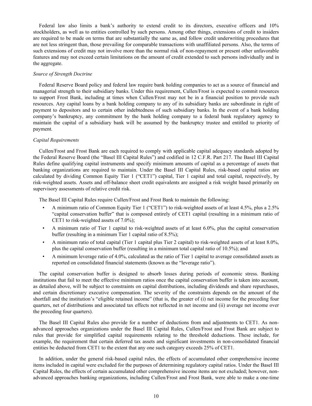 Federal law also limits a bank’s authority to extend credit to its directors, executive officers and 10% stockholders, as well as to entities controlled by such persons. Among other things, extensions of credit to insiders are required to be made on terms that are substantially the same as, and follow credit underwriting procedures that are not less stringent than, those prevailing for comparable transactions with unaffiliated persons. Also, the terms of such extensions of credit may not involve more than the normal risk of non-repayment or present other unfavorable features and may not exceed certain limitations on the amount of credit extended to such persons individually and in the aggregate. Source of Strength Doctrine Federal Reserve Board policy and federal law require bank holding companies to act as a source of financial and managerial strength to their subsidiary banks. Under this requirement, Cullen/Frost is expected to commit resources to support Frost Bank, including at times when Cullen/Frost may not be in a financial position to provide such resources. Any capital loans by a bank holding company to any of its subsidiary banks are subordinate in right of payment to depositors and to certain other indebtedness of such subsidiary banks. In the event of a bank holding company’s bankruptcy, any commitment by the bank holding company to a federal bank regulatory agency to maintain the capital of a subsidiary bank will be assumed by the bankruptcy trustee and entitled to priority of payment. Capital Requirements Cullen/Frost and Frost Bank are each required to comply with applicable capital adequacy standards adopted by the Federal Reserve Board (the “Basel III Capital Rules”) and codified in 12 C.F.R. Part 217. The Basel III Capital Rules define qualifying capital instruments and specify minimum amounts of capital as a percentage of assets that banking organizations are required to maintain. Under the Basel III Capital Rules, risk-based capital ratios are calculated by dividing Common Equity Tier 1 (“CET1”) capital, Tier 1 capital and total capital, respectively, by risk-weighted assets. Assets and off-balance sheet credit equivalents are assigned a risk weight based primarily on supervisory assessments of relative credit risk. The Basel III Capital Rules require Cullen/Frost and Frost Bank to maintain the following: • A minimum ratio of Common Equity Tier 1 (“CET1”) to risk-weighted assets of at least 4.5%, plus a 2.5% “capital conservation buffer” that is composed entirely of CET1 capital (resulting in a minimum ratio of CET1 to risk-weighted assets of 7.0%); • A minimum ratio of Tier 1 capital to risk-weighted assets of at least 6.0%, plus the capital conservation buffer (resulting in a minimum Tier 1 capital ratio of 8.5%); • A minimum ratio of total capital (Tier 1 capital plus Tier 2 capital) to risk-weighted assets of at least 8.0%, plus the capital conservation buffer (resulting in a minimum total capital ratio of 10.5%); and • A minimum leverage ratio of 4.0%, calculated as the ratio of Tier 1 capital to average consolidated assets as reported on consolidated financial statements (known as the “leverage ratio”). The capital conservation buffer is designed to absorb losses during periods of economic stress. Banking institutions that fail to meet the effective minimum ratios once the capital conservation buffer is taken into account, as detailed above, will be subject to constraints on capital distributions, including dividends and share repurchases, and certain discretionary executive compensation. The severity of the constraints depends on the amount of the shortfall and the institution’s “eligible retained income” (that is, the greater of (i) net income for the preceding four quarters, net of distributions and associated tax effects not reflected in net income and (ii) average net income over the preceding four quarters). The Basel III Capital Rules also provide for a number of deductions from and adjustments to CET1. As non- advanced approaches organizations under the Basel III Capital Rules, Cullen/Frost and Frost Bank are subject to rules that provide for simplified capital requirements relating to the threshold deductions. These include, for example, the requirement that certain deferred tax assets and significant investments in non-consolidated financial entities be deducted from CET1 to the extent that any one such category exceeds 25% of CET1. In addition, under the general risk-based capital rules, the effects of accumulated other comprehensive income items included in capital were excluded for the purposes of determining regulatory capital ratios. Under the Basel III Capital Rules, the effects of certain accumulated other comprehensive income items are not excluded; however, non- advanced approaches banking organizations, including Cullen/Frost and Frost Bank, were able to make a one-time 10