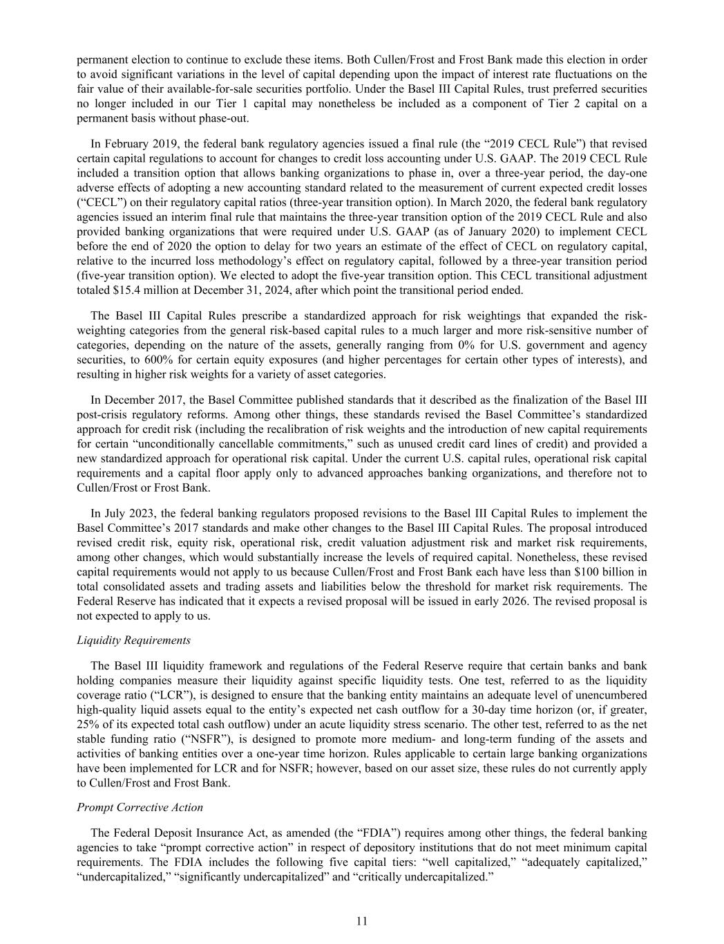 permanent election to continue to exclude these items. Both Cullen/Frost and Frost Bank made this election in order to avoid significant variations in the level of capital depending upon the impact of interest rate fluctuations on the fair value of their available-for-sale securities portfolio. Under the Basel III Capital Rules, trust preferred securities no longer included in our Tier 1 capital may nonetheless be included as a component of Tier 2 capital on a permanent basis without phase-out. In February 2019, the federal bank regulatory agencies issued a final rule (the “2019 CECL Rule”) that revised certain capital regulations to account for changes to credit loss accounting under U.S. GAAP. The 2019 CECL Rule included a transition option that allows banking organizations to phase in, over a three-year period, the day-one adverse effects of adopting a new accounting standard related to the measurement of current expected credit losses (“CECL”) on their regulatory capital ratios (three-year transition option). In March 2020, the federal bank regulatory agencies issued an interim final rule that maintains the three-year transition option of the 2019 CECL Rule and also provided banking organizations that were required under U.S. GAAP (as of January 2020) to implement CECL before the end of 2020 the option to delay for two years an estimate of the effect of CECL on regulatory capital, relative to the incurred loss methodology’s effect on regulatory capital, followed by a three-year transition period (five-year transition option). We elected to adopt the five-year transition option. This CECL transitional adjustment totaled $15.4 million at December 31, 2024, after which point the transitional period ended. The Basel III Capital Rules prescribe a standardized approach for risk weightings that expanded the risk- weighting categories from the general risk-based capital rules to a much larger and more risk-sensitive number of categories, depending on the nature of the assets, generally ranging from 0% for U.S. government and agency securities, to 600% for certain equity exposures (and higher percentages for certain other types of interests), and resulting in higher risk weights for a variety of asset categories. In December 2017, the Basel Committee published standards that it described as the finalization of the Basel III post-crisis regulatory reforms. Among other things, these standards revised the Basel Committee’s standardized approach for credit risk (including the recalibration of risk weights and the introduction of new capital requirements for certain “unconditionally cancellable commitments,” such as unused credit card lines of credit) and provided a new standardized approach for operational risk capital. Under the current U.S. capital rules, operational risk capital requirements and a capital floor apply only to advanced approaches banking organizations, and therefore not to Cullen/Frost or Frost Bank. In July 2023, the federal banking regulators proposed revisions to the Basel III Capital Rules to implement the Basel Committee’s 2017 standards and make other changes to the Basel III Capital Rules. The proposal introduced revised credit risk, equity risk, operational risk, credit valuation adjustment risk and market risk requirements, among other changes, which would substantially increase the levels of required capital. Nonetheless, these revised capital requirements would not apply to us because Cullen/Frost and Frost Bank each have less than $100 billion in total consolidated assets and trading assets and liabilities below the threshold for market risk requirements. The Federal Reserve has indicated that it expects a revised proposal will be issued in early 2026. The revised proposal is not expected to apply to us. Liquidity Requirements The Basel III liquidity framework and regulations of the Federal Reserve require that certain banks and bank holding companies measure their liquidity against specific liquidity tests. One test, referred to as the liquidity coverage ratio (“LCR”), is designed to ensure that the banking entity maintains an adequate level of unencumbered high-quality liquid assets equal to the entity’s expected net cash outflow for a 30-day time horizon (or, if greater, 25% of its expected total cash outflow) under an acute liquidity stress scenario. The other test, referred to as the net stable funding ratio (“NSFR”), is designed to promote more medium- and long-term funding of the assets and activities of banking entities over a one-year time horizon. Rules applicable to certain large banking organizations have been implemented for LCR and for NSFR; however, based on our asset size, these rules do not currently apply to Cullen/Frost and Frost Bank. Prompt Corrective Action The Federal Deposit Insurance Act, as amended (the “FDIA”) requires among other things, the federal banking agencies to take “prompt corrective action” in respect of depository institutions that do not meet minimum capital requirements. The FDIA includes the following five capital tiers: “well capitalized,” “adequately capitalized,” “undercapitalized,” “significantly undercapitalized” and “critically undercapitalized.” 11