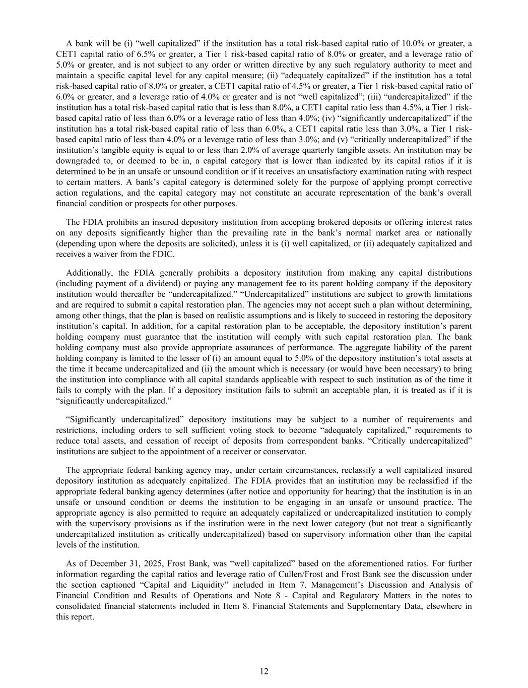 A bank will be (i) “well capitalized” if the institution has a total risk-based capital ratio of 10.0% or greater, a CET1 capital ratio of 6.5% or greater, a Tier 1 risk-based capital ratio of 8.0% or greater, and a leverage ratio of 5.0% or greater, and is not subject to any order or written directive by any such regulatory authority to meet and maintain a specific capital level for any capital measure; (ii) “adequately capitalized” if the institution has a total risk-based capital ratio of 8.0% or greater, a CET1 capital ratio of 4.5% or greater, a Tier 1 risk-based capital ratio of 6.0% or greater, and a leverage ratio of 4.0% or greater and is not “well capitalized”; (iii) “undercapitalized” if the institution has a total risk-based capital ratio that is less than 8.0%, a CET1 capital ratio less than 4.5%, a Tier 1 risk- based capital ratio of less than 6.0% or a leverage ratio of less than 4.0%; (iv) “significantly undercapitalized” if the institution has a total risk-based capital ratio of less than 6.0%, a CET1 capital ratio less than 3.0%, a Tier 1 risk- based capital ratio of less than 4.0% or a leverage ratio of less than 3.0%; and (v) “critically undercapitalized” if the institution’s tangible equity is equal to or less than 2.0% of average quarterly tangible assets. An institution may be downgraded to, or deemed to be in, a capital category that is lower than indicated by its capital ratios if it is determined to be in an unsafe or unsound condition or if it receives an unsatisfactory examination rating with respect to certain matters. A bank’s capital category is determined solely for the purpose of applying prompt corrective action regulations, and the capital category may not constitute an accurate representation of the bank’s overall financial condition or prospects for other purposes. The FDIA prohibits an insured depository institution from accepting brokered deposits or offering interest rates on any deposits significantly higher than the prevailing rate in the bank’s normal market area or nationally (depending upon where the deposits are solicited), unless it is (i) well capitalized, or (ii) adequately capitalized and receives a waiver from the FDIC. Additionally, the FDIA generally prohibits a depository institution from making any capital distributions (including payment of a dividend) or paying any management fee to its parent holding company if the depository institution would thereafter be “undercapitalized.” “Undercapitalized” institutions are subject to growth limitations and are required to submit a capital restoration plan. The agencies may not accept such a plan without determining, among other things, that the plan is based on realistic assumptions and is likely to succeed in restoring the depository institution’s capital. In addition, for a capital restoration plan to be acceptable, the depository institution’s parent holding company must guarantee that the institution will comply with such capital restoration plan. The bank holding company must also provide appropriate assurances of performance. The aggregate liability of the parent holding company is limited to the lesser of (i) an amount equal to 5.0% of the depository institution’s total assets at the time it became undercapitalized and (ii) the amount which is necessary (or would have been necessary) to bring the institution into compliance with all capital standards applicable with respect to such institution as of the time it fails to comply with the plan. If a depository institution fails to submit an acceptable plan, it is treated as if it is “significantly undercapitalized.” “Significantly undercapitalized” depository institutions may be subject to a number of requirements and restrictions, including orders to sell sufficient voting stock to become “adequately capitalized,” requirements to reduce total assets, and cessation of receipt of deposits from correspondent banks. “Critically undercapitalized” institutions are subject to the appointment of a receiver or conservator. The appropriate federal banking agency may, under certain circumstances, reclassify a well capitalized insured depository institution as adequately capitalized. The FDIA provides that an institution may be reclassified if the appropriate federal banking agency determines (after notice and opportunity for hearing) that the institution is in an unsafe or unsound condition or deems the institution to be engaging in an unsafe or unsound practice. The appropriate agency is also permitted to require an adequately capitalized or undercapitalized institution to comply with the supervisory provisions as if the institution were in the next lower category (but not treat a significantly undercapitalized institution as critically undercapitalized) based on supervisory information other than the capital levels of the institution. As of December 31, 2025, Frost Bank, was “well capitalized” based on the aforementioned ratios. For further information regarding the capital ratios and leverage ratio of Cullen/Frost and Frost Bank see the discussion under the section captioned “Capital and Liquidity” included in Item 7. Management’s Discussion and Analysis of Financial Condition and Results of Operations and Note 8 - Capital and Regulatory Matters in the notes to consolidated financial statements included in Item 8. Financial Statements and Supplementary Data, elsewhere in this report. 12