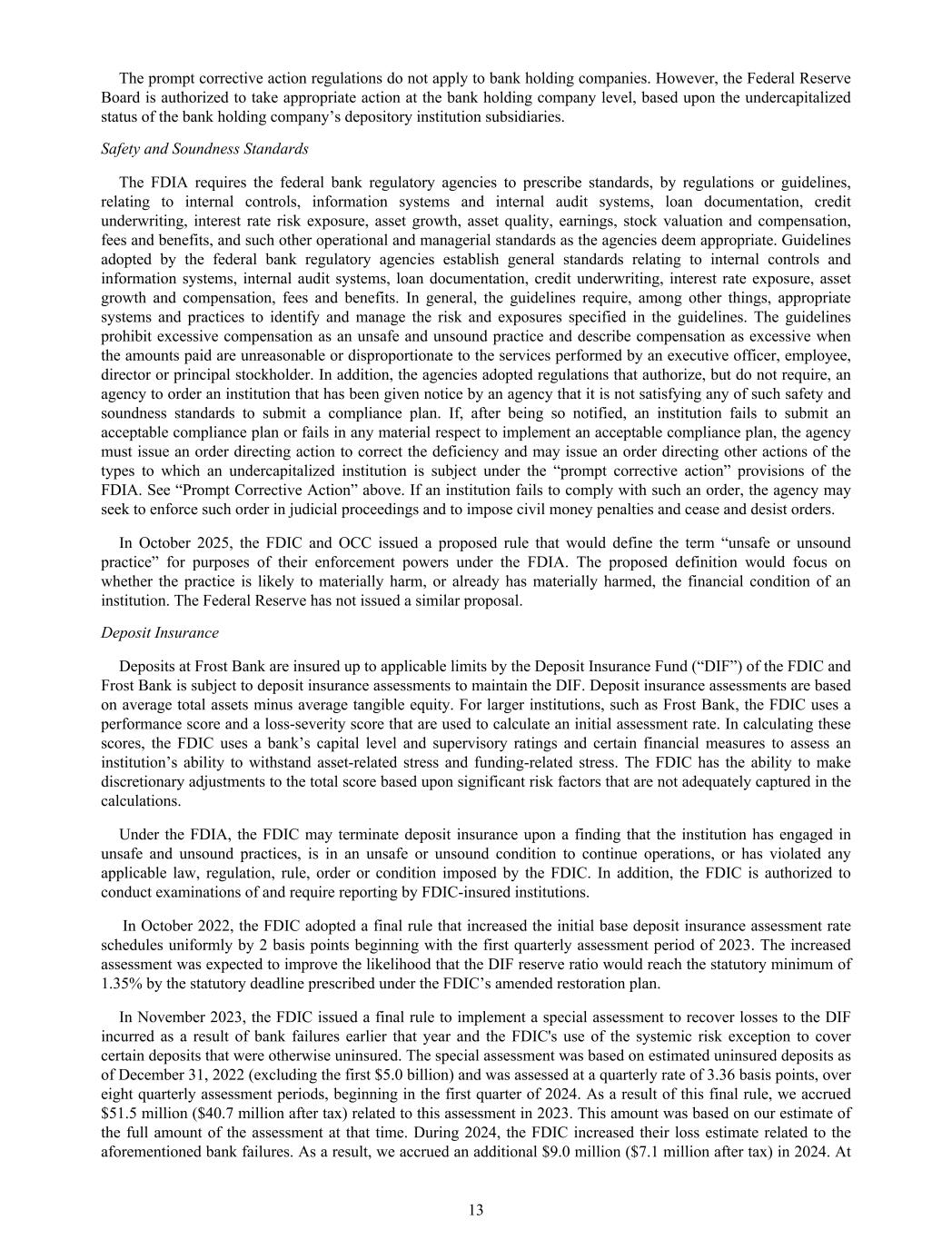 The prompt corrective action regulations do not apply to bank holding companies. However, the Federal Reserve Board is authorized to take appropriate action at the bank holding company level, based upon the undercapitalized status of the bank holding company’s depository institution subsidiaries. Safety and Soundness Standards The FDIA requires the federal bank regulatory agencies to prescribe standards, by regulations or guidelines, relating to internal controls, information systems and internal audit systems, loan documentation, credit underwriting, interest rate risk exposure, asset growth, asset quality, earnings, stock valuation and compensation, fees and benefits, and such other operational and managerial standards as the agencies deem appropriate. Guidelines adopted by the federal bank regulatory agencies establish general standards relating to internal controls and information systems, internal audit systems, loan documentation, credit underwriting, interest rate exposure, asset growth and compensation, fees and benefits. In general, the guidelines require, among other things, appropriate systems and practices to identify and manage the risk and exposures specified in the guidelines. The guidelines prohibit excessive compensation as an unsafe and unsound practice and describe compensation as excessive when the amounts paid are unreasonable or disproportionate to the services performed by an executive officer, employee, director or principal stockholder. In addition, the agencies adopted regulations that authorize, but do not require, an agency to order an institution that has been given notice by an agency that it is not satisfying any of such safety and soundness standards to submit a compliance plan. If, after being so notified, an institution fails to submit an acceptable compliance plan or fails in any material respect to implement an acceptable compliance plan, the agency must issue an order directing action to correct the deficiency and may issue an order directing other actions of the types to which an undercapitalized institution is subject under the “prompt corrective action” provisions of the FDIA. See “Prompt Corrective Action” above. If an institution fails to comply with such an order, the agency may seek to enforce such order in judicial proceedings and to impose civil money penalties and cease and desist orders. In October 2025, the FDIC and OCC issued a proposed rule that would define the term “unsafe or unsound practice” for purposes of their enforcement powers under the FDIA. The proposed definition would focus on whether the practice is likely to materially harm, or already has materially harmed, the financial condition of an institution. The Federal Reserve has not issued a similar proposal. Deposit Insurance Deposits at Frost Bank are insured up to applicable limits by the Deposit Insurance Fund (“DIF”) of the FDIC and Frost Bank is subject to deposit insurance assessments to maintain the DIF. Deposit insurance assessments are based on average total assets minus average tangible equity. For larger institutions, such as Frost Bank, the FDIC uses a performance score and a loss-severity score that are used to calculate an initial assessment rate. In calculating these scores, the FDIC uses a bank’s capital level and supervisory ratings and certain financial measures to assess an institution’s ability to withstand asset-related stress and funding-related stress. The FDIC has the ability to make discretionary adjustments to the total score based upon significant risk factors that are not adequately captured in the calculations. Under the FDIA, the FDIC may terminate deposit insurance upon a finding that the institution has engaged in unsafe and unsound practices, is in an unsafe or unsound condition to continue operations, or has violated any applicable law, regulation, rule, order or condition imposed by the FDIC. In addition, the FDIC is authorized to conduct examinations of and require reporting by FDIC-insured institutions. In October 2022, the FDIC adopted a final rule that increased the initial base deposit insurance assessment rate schedules uniformly by 2 basis points beginning with the first quarterly assessment period of 2023. The increased assessment was expected to improve the likelihood that the DIF reserve ratio would reach the statutory minimum of 1.35% by the statutory deadline prescribed under the FDIC’s amended restoration plan. In November 2023, the FDIC issued a final rule to implement a special assessment to recover losses to the DIF incurred as a result of bank failures earlier that year and the FDIC's use of the systemic risk exception to cover certain deposits that were otherwise uninsured. The special assessment was based on estimated uninsured deposits as of December 31, 2022 (excluding the first $5.0 billion) and was assessed at a quarterly rate of 3.36 basis points, over eight quarterly assessment periods, beginning in the first quarter of 2024. As a result of this final rule, we accrued $51.5 million ($40.7 million after tax) related to this assessment in 2023. This amount was based on our estimate of the full amount of the assessment at that time. During 2024, the FDIC increased their loss estimate related to the aforementioned bank failures. As a result, we accrued an additional $9.0 million ($7.1 million after tax) in 2024. At 13