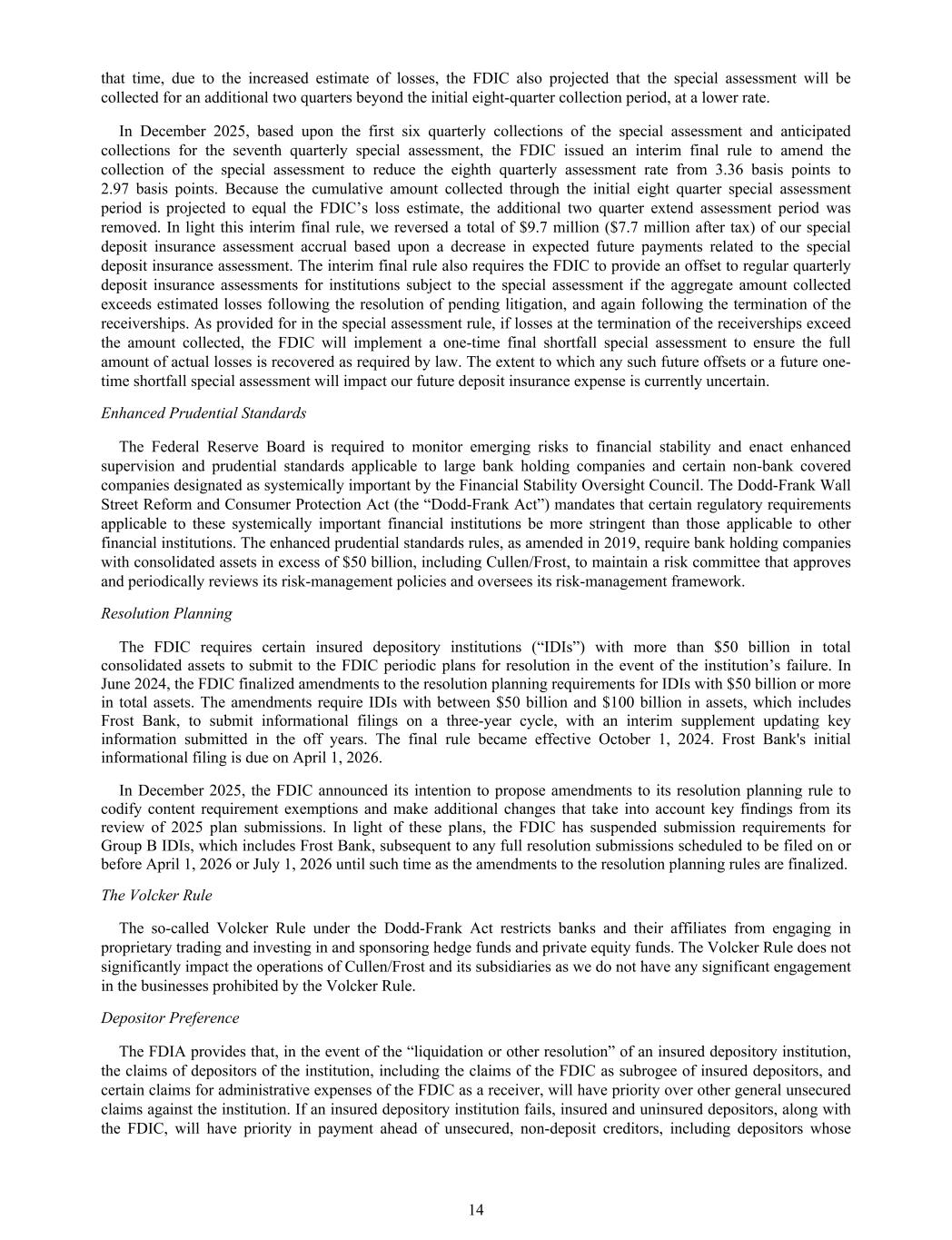 that time, due to the increased estimate of losses, the FDIC also projected that the special assessment will be collected for an additional two quarters beyond the initial eight-quarter collection period, at a lower rate. In December 2025, based upon the first six quarterly collections of the special assessment and anticipated collections for the seventh quarterly special assessment, the FDIC issued an interim final rule to amend the collection of the special assessment to reduce the eighth quarterly assessment rate from 3.36 basis points to 2.97 basis points. Because the cumulative amount collected through the initial eight quarter special assessment period is projected to equal the FDIC’s loss estimate, the additional two quarter extend assessment period was removed. In light this interim final rule, we reversed a total of $9.7 million ($7.7 million after tax) of our special deposit insurance assessment accrual based upon a decrease in expected future payments related to the special deposit insurance assessment. The interim final rule also requires the FDIC to provide an offset to regular quarterly deposit insurance assessments for institutions subject to the special assessment if the aggregate amount collected exceeds estimated losses following the resolution of pending litigation, and again following the termination of the receiverships. As provided for in the special assessment rule, if losses at the termination of the receiverships exceed the amount collected, the FDIC will implement a one-time final shortfall special assessment to ensure the full amount of actual losses is recovered as required by law. The extent to which any such future offsets or a future one- time shortfall special assessment will impact our future deposit insurance expense is currently uncertain. Enhanced Prudential Standards The Federal Reserve Board is required to monitor emerging risks to financial stability and enact enhanced supervision and prudential standards applicable to large bank holding companies and certain non-bank covered companies designated as systemically important by the Financial Stability Oversight Council. The Dodd-Frank Wall Street Reform and Consumer Protection Act (the “Dodd-Frank Act”) mandates that certain regulatory requirements applicable to these systemically important financial institutions be more stringent than those applicable to other financial institutions. The enhanced prudential standards rules, as amended in 2019, require bank holding companies with consolidated assets in excess of $50 billion, including Cullen/Frost, to maintain a risk committee that approves and periodically reviews its risk-management policies and oversees its risk-management framework. Resolution Planning The FDIC requires certain insured depository institutions (“IDIs”) with more than $50 billion in total consolidated assets to submit to the FDIC periodic plans for resolution in the event of the institution’s failure. In June 2024, the FDIC finalized amendments to the resolution planning requirements for IDIs with $50 billion or more in total assets. The amendments require IDIs with between $50 billion and $100 billion in assets, which includes Frost Bank, to submit informational filings on a three-year cycle, with an interim supplement updating key information submitted in the off years. The final rule became effective October 1, 2024. Frost Bank's initial informational filing is due on April 1, 2026. In December 2025, the FDIC announced its intention to propose amendments to its resolution planning rule to codify content requirement exemptions and make additional changes that take into account key findings from its review of 2025 plan submissions. In light of these plans, the FDIC has suspended submission requirements for Group B IDIs, which includes Frost Bank, subsequent to any full resolution submissions scheduled to be filed on or before April 1, 2026 or July 1, 2026 until such time as the amendments to the resolution planning rules are finalized. The Volcker Rule The so-called Volcker Rule under the Dodd-Frank Act restricts banks and their affiliates from engaging in proprietary trading and investing in and sponsoring hedge funds and private equity funds. The Volcker Rule does not significantly impact the operations of Cullen/Frost and its subsidiaries as we do not have any significant engagement in the businesses prohibited by the Volcker Rule. Depositor Preference The FDIA provides that, in the event of the “liquidation or other resolution” of an insured depository institution, the claims of depositors of the institution, including the claims of the FDIC as subrogee of insured depositors, and certain claims for administrative expenses of the FDIC as a receiver, will have priority over other general unsecured claims against the institution. If an insured depository institution fails, insured and uninsured depositors, along with the FDIC, will have priority in payment ahead of unsecured, non-deposit creditors, including depositors whose 14