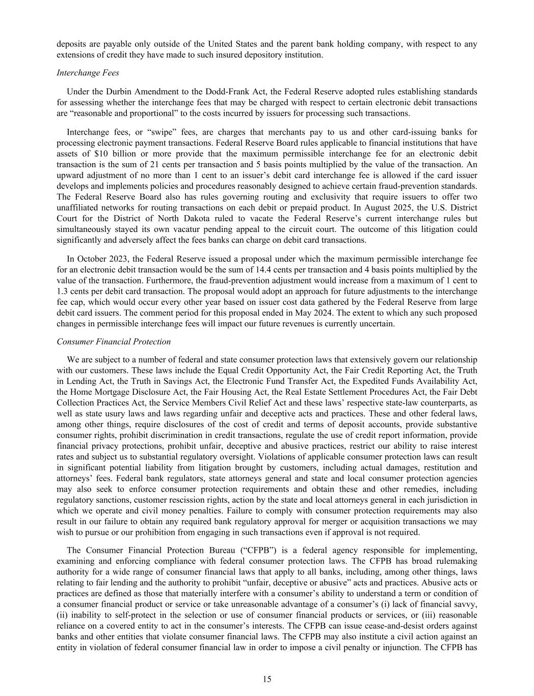 deposits are payable only outside of the United States and the parent bank holding company, with respect to any extensions of credit they have made to such insured depository institution. Interchange Fees Under the Durbin Amendment to the Dodd-Frank Act, the Federal Reserve adopted rules establishing standards for assessing whether the interchange fees that may be charged with respect to certain electronic debit transactions are “reasonable and proportional” to the costs incurred by issuers for processing such transactions. Interchange fees, or “swipe” fees, are charges that merchants pay to us and other card-issuing banks for processing electronic payment transactions. Federal Reserve Board rules applicable to financial institutions that have assets of $10 billion or more provide that the maximum permissible interchange fee for an electronic debit transaction is the sum of 21 cents per transaction and 5 basis points multiplied by the value of the transaction. An upward adjustment of no more than 1 cent to an issuer’s debit card interchange fee is allowed if the card issuer develops and implements policies and procedures reasonably designed to achieve certain fraud-prevention standards. The Federal Reserve Board also has rules governing routing and exclusivity that require issuers to offer two unaffiliated networks for routing transactions on each debit or prepaid product. In August 2025, the U.S. District Court for the District of North Dakota ruled to vacate the Federal Reserve’s current interchange rules but simultaneously stayed its own vacatur pending appeal to the circuit court. The outcome of this litigation could significantly and adversely affect the fees banks can charge on debit card transactions. In October 2023, the Federal Reserve issued a proposal under which the maximum permissible interchange fee for an electronic debit transaction would be the sum of 14.4 cents per transaction and 4 basis points multiplied by the value of the transaction. Furthermore, the fraud-prevention adjustment would increase from a maximum of 1 cent to 1.3 cents per debit card transaction. The proposal would adopt an approach for future adjustments to the interchange fee cap, which would occur every other year based on issuer cost data gathered by the Federal Reserve from large debit card issuers. The comment period for this proposal ended in May 2024. The extent to which any such proposed changes in permissible interchange fees will impact our future revenues is currently uncertain. Consumer Financial Protection We are subject to a number of federal and state consumer protection laws that extensively govern our relationship with our customers. These laws include the Equal Credit Opportunity Act, the Fair Credit Reporting Act, the Truth in Lending Act, the Truth in Savings Act, the Electronic Fund Transfer Act, the Expedited Funds Availability Act, the Home Mortgage Disclosure Act, the Fair Housing Act, the Real Estate Settlement Procedures Act, the Fair Debt Collection Practices Act, the Service Members Civil Relief Act and these laws’ respective state-law counterparts, as well as state usury laws and laws regarding unfair and deceptive acts and practices. These and other federal laws, among other things, require disclosures of the cost of credit and terms of deposit accounts, provide substantive consumer rights, prohibit discrimination in credit transactions, regulate the use of credit report information, provide financial privacy protections, prohibit unfair, deceptive and abusive practices, restrict our ability to raise interest rates and subject us to substantial regulatory oversight. Violations of applicable consumer protection laws can result in significant potential liability from litigation brought by customers, including actual damages, restitution and attorneys’ fees. Federal bank regulators, state attorneys general and state and local consumer protection agencies may also seek to enforce consumer protection requirements and obtain these and other remedies, including regulatory sanctions, customer rescission rights, action by the state and local attorneys general in each jurisdiction in which we operate and civil money penalties. Failure to comply with consumer protection requirements may also result in our failure to obtain any required bank regulatory approval for merger or acquisition transactions we may wish to pursue or our prohibition from engaging in such transactions even if approval is not required. The Consumer Financial Protection Bureau (“CFPB”) is a federal agency responsible for implementing, examining and enforcing compliance with federal consumer protection laws. The CFPB has broad rulemaking authority for a wide range of consumer financial laws that apply to all banks, including, among other things, laws relating to fair lending and the authority to prohibit “unfair, deceptive or abusive” acts and practices. Abusive acts or practices are defined as those that materially interfere with a consumer’s ability to understand a term or condition of a consumer financial product or service or take unreasonable advantage of a consumer’s (i) lack of financial savvy, (ii) inability to self-protect in the selection or use of consumer financial products or services, or (iii) reasonable reliance on a covered entity to act in the consumer’s interests. The CFPB can issue cease-and-desist orders against banks and other entities that violate consumer financial laws. The CFPB may also institute a civil action against an entity in violation of federal consumer financial law in order to impose a civil penalty or injunction. The CFPB has 15