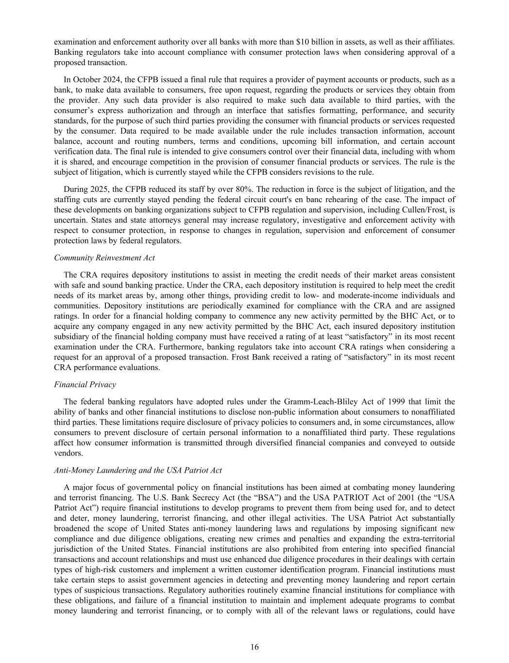 examination and enforcement authority over all banks with more than $10 billion in assets, as well as their affiliates. Banking regulators take into account compliance with consumer protection laws when considering approval of a proposed transaction. In October 2024, the CFPB issued a final rule that requires a provider of payment accounts or products, such as a bank, to make data available to consumers, free upon request, regarding the products or services they obtain from the provider. Any such data provider is also required to make such data available to third parties, with the consumer’s express authorization and through an interface that satisfies formatting, performance, and security standards, for the purpose of such third parties providing the consumer with financial products or services requested by the consumer. Data required to be made available under the rule includes transaction information, account balance, account and routing numbers, terms and conditions, upcoming bill information, and certain account verification data. The final rule is intended to give consumers control over their financial data, including with whom it is shared, and encourage competition in the provision of consumer financial products or services. The rule is the subject of litigation, which is currently stayed while the CFPB considers revisions to the rule. During 2025, the CFPB reduced its staff by over 80%. The reduction in force is the subject of litigation, and the staffing cuts are currently stayed pending the federal circuit court's en banc rehearing of the case. The impact of these developments on banking organizations subject to CFPB regulation and supervision, including Cullen/Frost, is uncertain. States and state attorneys general may increase regulatory, investigative and enforcement activity with respect to consumer protection, in response to changes in regulation, supervision and enforcement of consumer protection laws by federal regulators. Community Reinvestment Act The CRA requires depository institutions to assist in meeting the credit needs of their market areas consistent with safe and sound banking practice. Under the CRA, each depository institution is required to help meet the credit needs of its market areas by, among other things, providing credit to low- and moderate-income individuals and communities. Depository institutions are periodically examined for compliance with the CRA and are assigned ratings. In order for a financial holding company to commence any new activity permitted by the BHC Act, or to acquire any company engaged in any new activity permitted by the BHC Act, each insured depository institution subsidiary of the financial holding company must have received a rating of at least “satisfactory” in its most recent examination under the CRA. Furthermore, banking regulators take into account CRA ratings when considering a request for an approval of a proposed transaction. Frost Bank received a rating of “satisfactory” in its most recent CRA performance evaluations. Financial Privacy The federal banking regulators have adopted rules under the Gramm-Leach-Bliley Act of 1999 that limit the ability of banks and other financial institutions to disclose non-public information about consumers to nonaffiliated third parties. These limitations require disclosure of privacy policies to consumers and, in some circumstances, allow consumers to prevent disclosure of certain personal information to a nonaffiliated third party. These regulations affect how consumer information is transmitted through diversified financial companies and conveyed to outside vendors. Anti-Money Laundering and the USA Patriot Act A major focus of governmental policy on financial institutions has been aimed at combating money laundering and terrorist financing. The U.S. Bank Secrecy Act (the “BSA”) and the USA PATRIOT Act of 2001 (the “USA Patriot Act”) require financial institutions to develop programs to prevent them from being used for, and to detect and deter, money laundering, terrorist financing, and other illegal activities. The USA Patriot Act substantially broadened the scope of United States anti-money laundering laws and regulations by imposing significant new compliance and due diligence obligations, creating new crimes and penalties and expanding the extra-territorial jurisdiction of the United States. Financial institutions are also prohibited from entering into specified financial transactions and account relationships and must use enhanced due diligence procedures in their dealings with certain types of high-risk customers and implement a written customer identification program. Financial institutions must take certain steps to assist government agencies in detecting and preventing money laundering and report certain types of suspicious transactions. Regulatory authorities routinely examine financial institutions for compliance with these obligations, and failure of a financial institution to maintain and implement adequate programs to combat money laundering and terrorist financing, or to comply with all of the relevant laws or regulations, could have 16